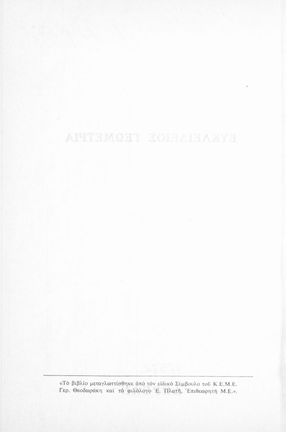 Παρουσίαση περιεχομένου: Σχολικό εγχειρίδιο Γεωμετρίας Γ΄ Γυμνασίου χωρισμένο σε θεωρήματα και ασκήσεις που εστιάζει στην Επιπεδομετρία. Το εγχειρίδιο μεταγλωττίστηκε στη δημοτική από τους Ε. Πλατή και Ιορδάνη Παπαδόπουλο.