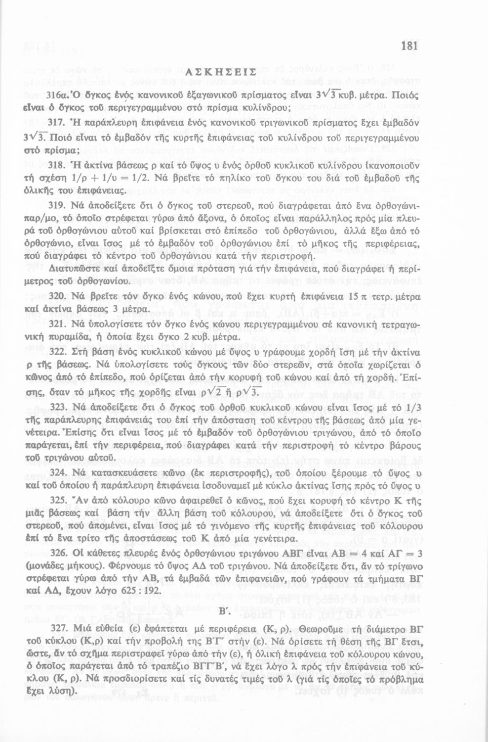 Σχολικό εγχειρίδιο Γεωμετρίας για τις Α΄, Β΄ και Γ΄ Λυκείου που περιλαμβάνει θεωρία και ασκήσεις και είναι χωρισμένο σε Επιπεδομετρία και Στερεομετρία.