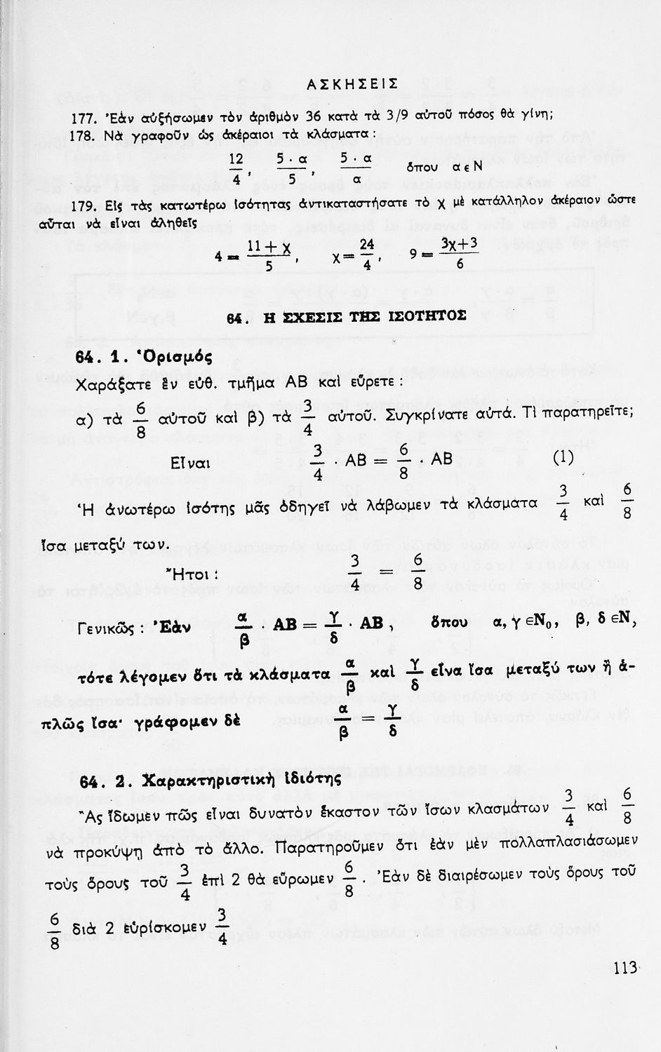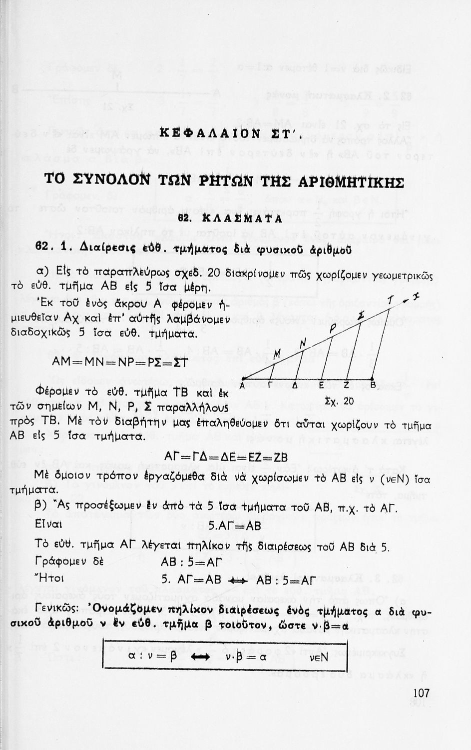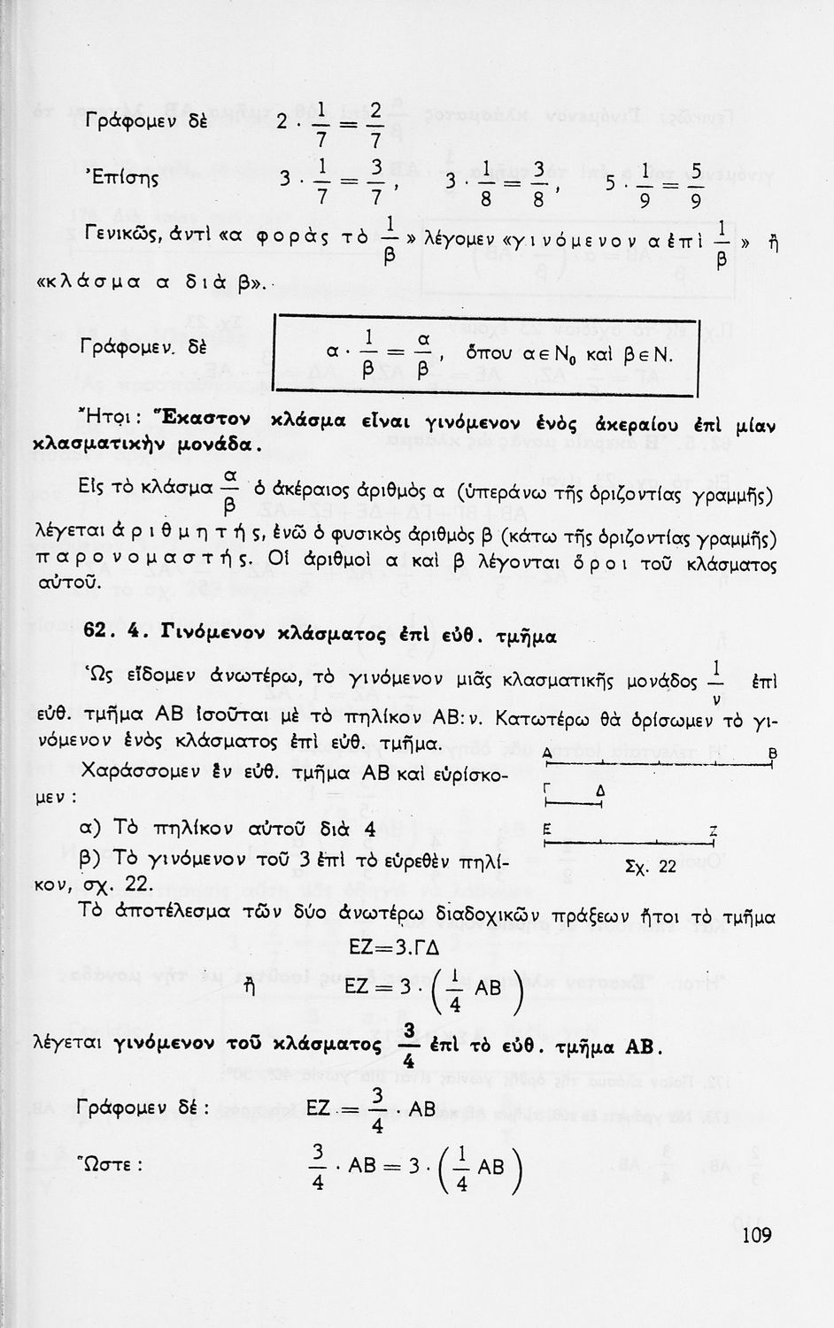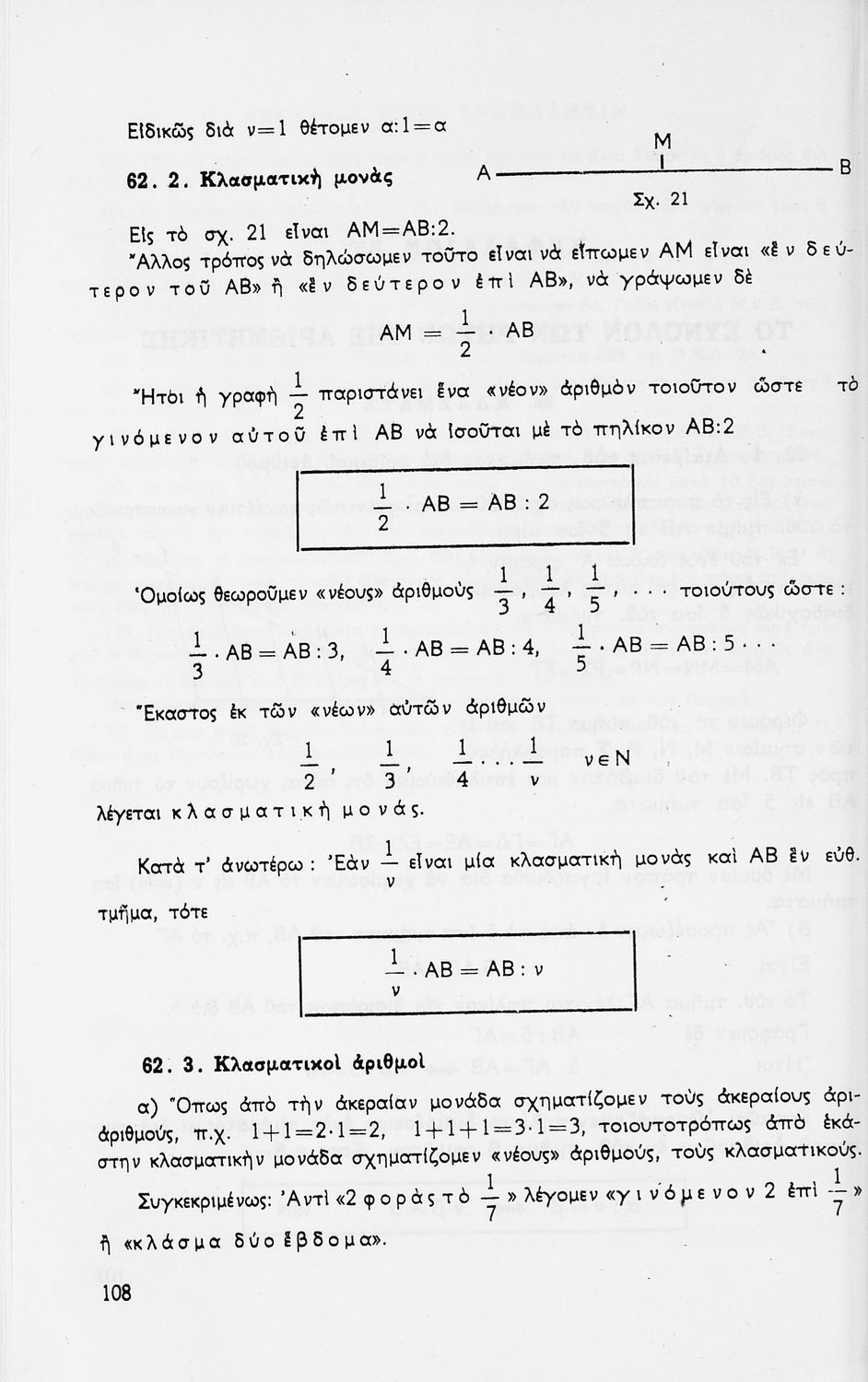 Σχολικό εγχειρίδιο Μαθηματικών Α' Γυμνασίου που περιέχει άλγεβρα με έμφαση στις αριθμητικές πράξεις με ακέραιους, δεκαδικούς και κλάσματα, και γεωμετρία με έμφαση στην επιπεδομετρία. Περιέχει και εισαγωγή στη θεωρία των συνόλων. Φέρει το σύμβολο της δικτατορίας.