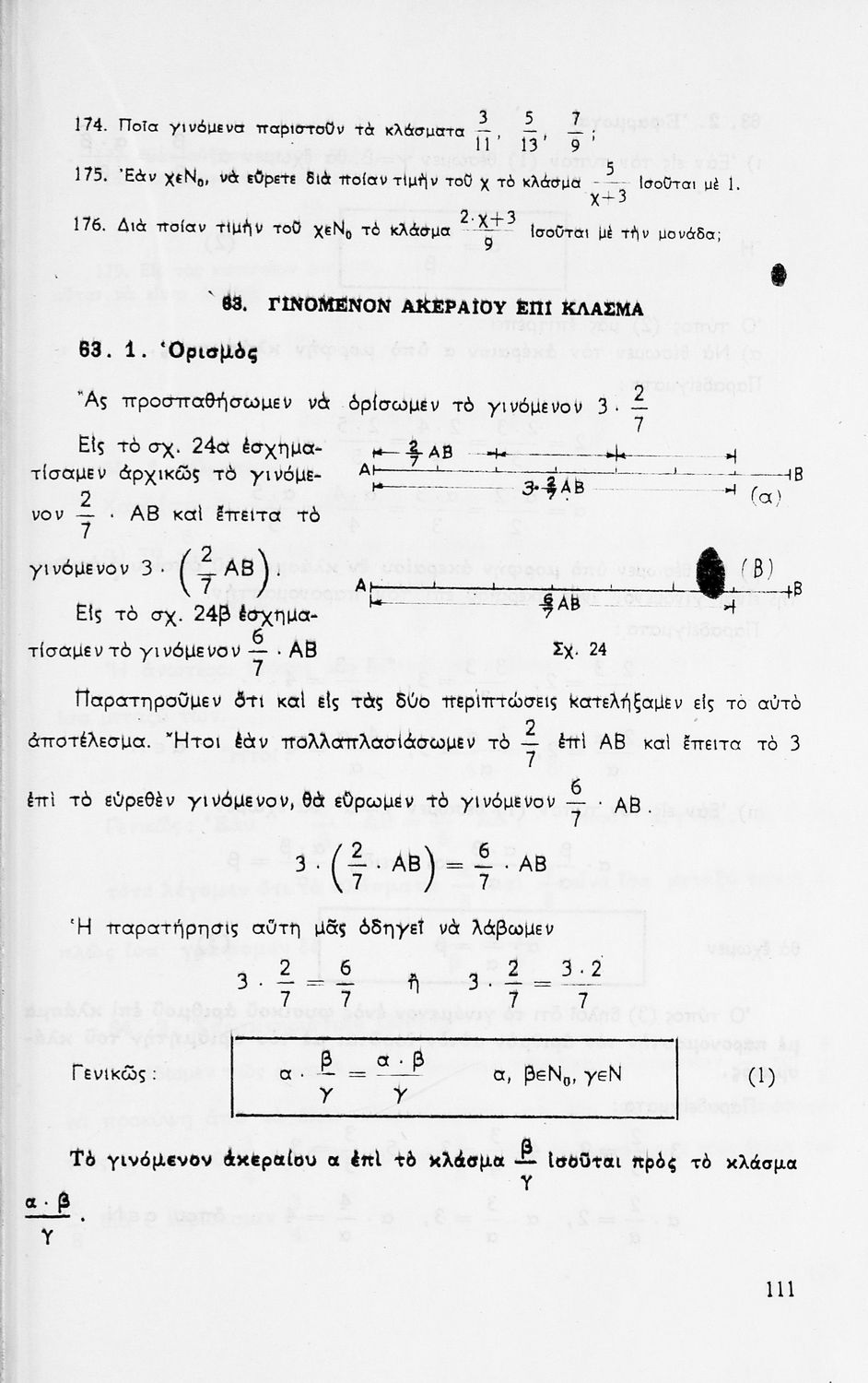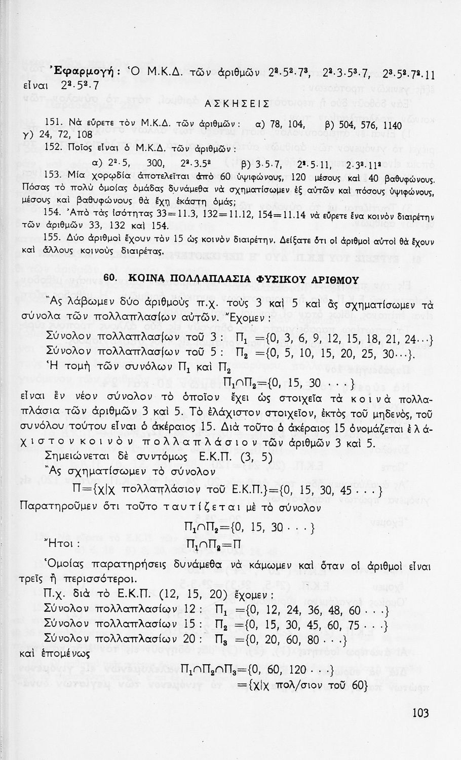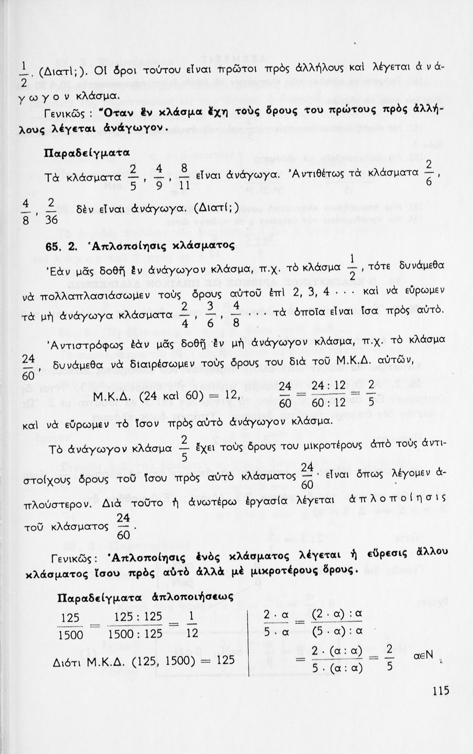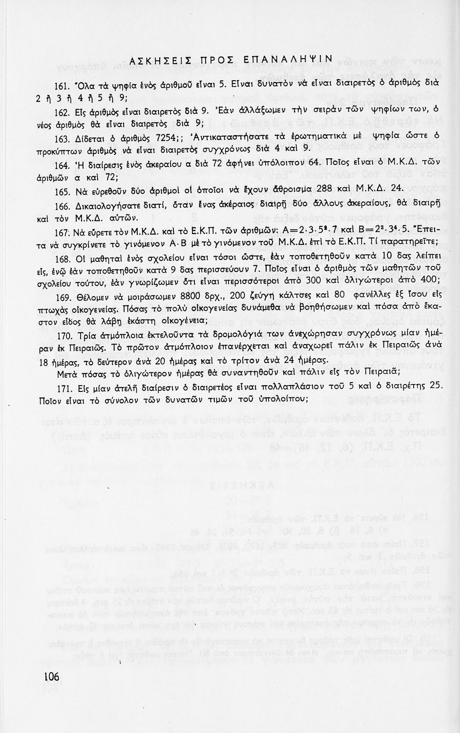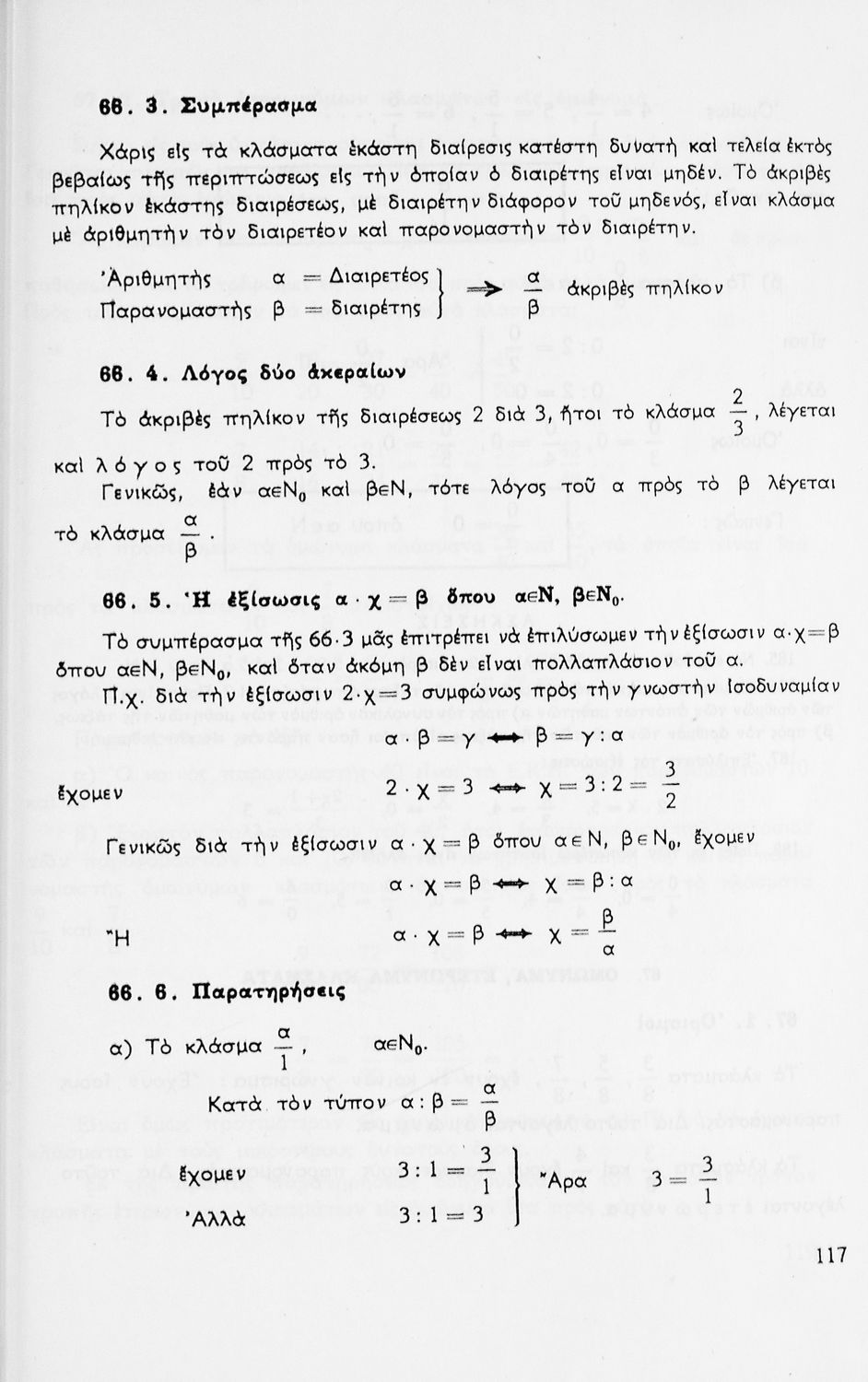 Σχολικό εγχειρίδιο Μαθηματικών Α' Γυμνασίου που περιέχει άλγεβρα με έμφαση στις αριθμητικές πράξεις με ακέραιους, δεκαδικούς και κλάσματα, και γεωμετρία με έμφαση στην επιπεδομετρία. Περιέχει και εισαγωγή στη θεωρία των συνόλων. Φέρει το σύμβολο της δικτατορίας.
