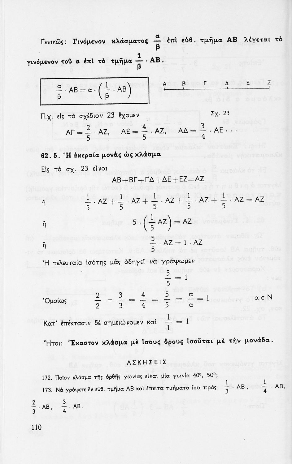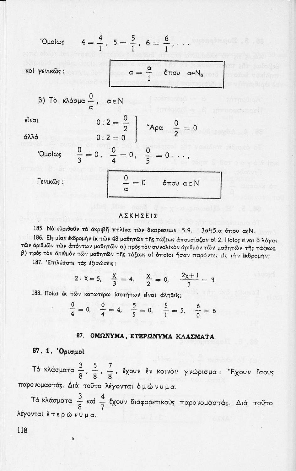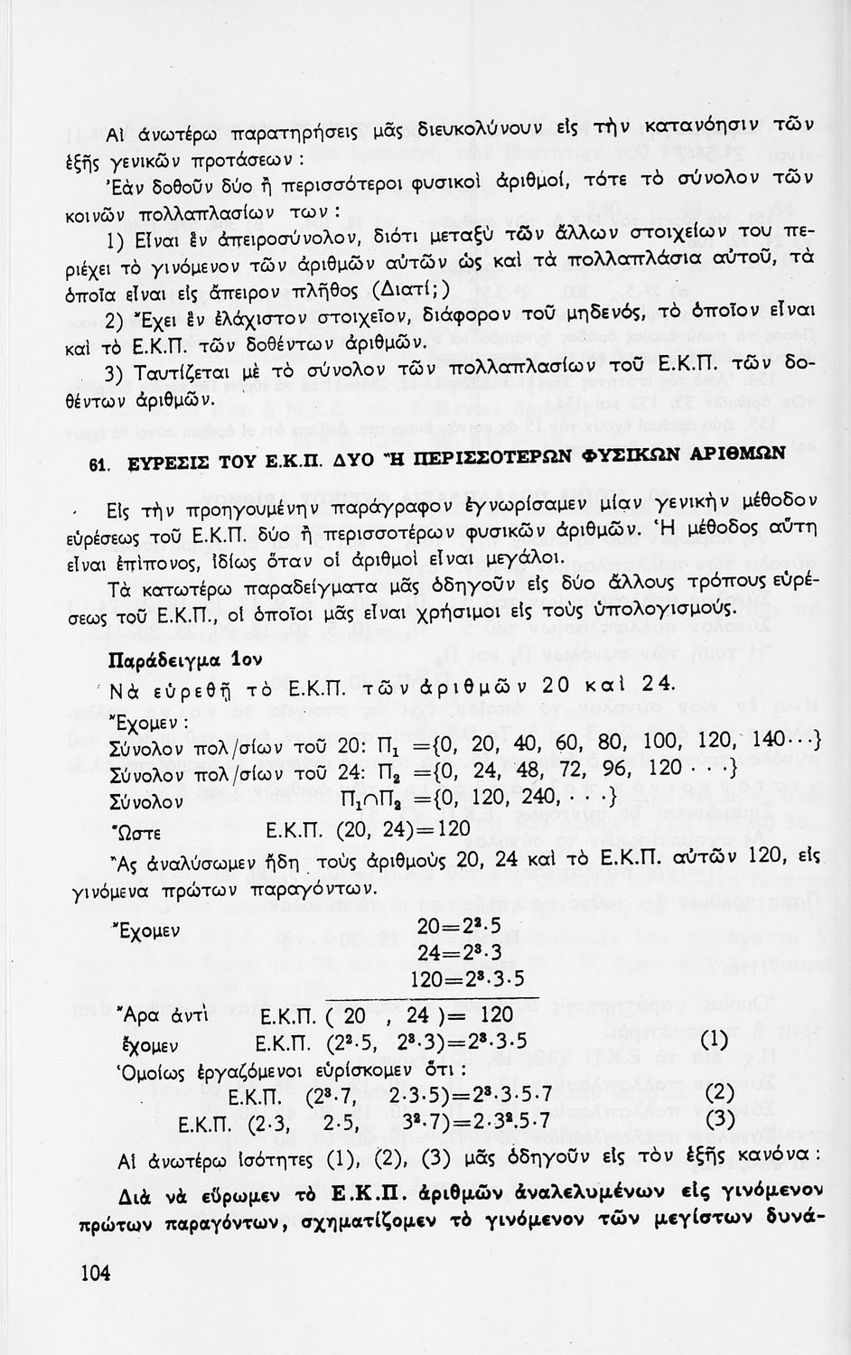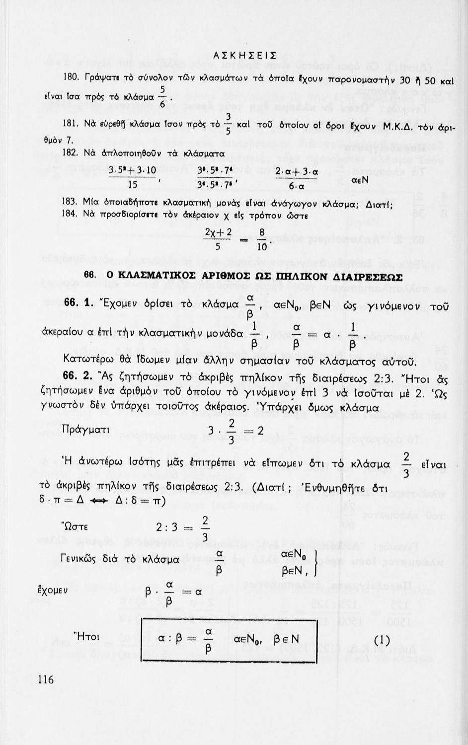 Σχολικό εγχειρίδιο Μαθηματικών Α' Γυμνασίου που περιέχει άλγεβρα με έμφαση στις αριθμητικές πράξεις με ακέραιους, δεκαδικούς και κλάσματα, και γεωμετρία με έμφαση στην επιπεδομετρία. Περιέχει και εισαγωγή στη θεωρία των συνόλων. Φέρει το σύμβολο της δικτατορίας.