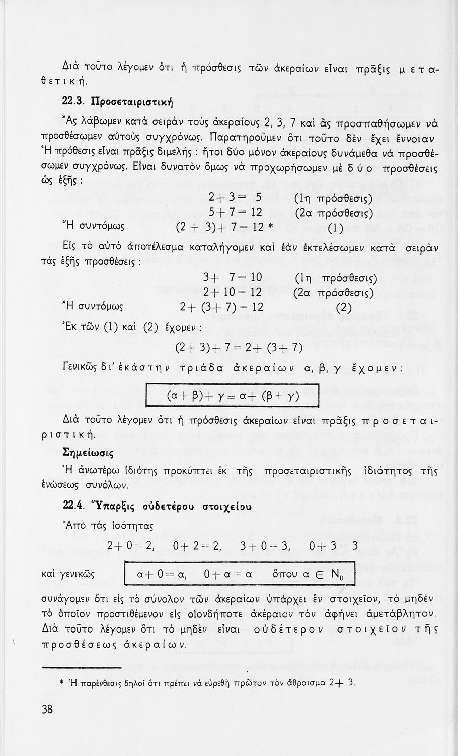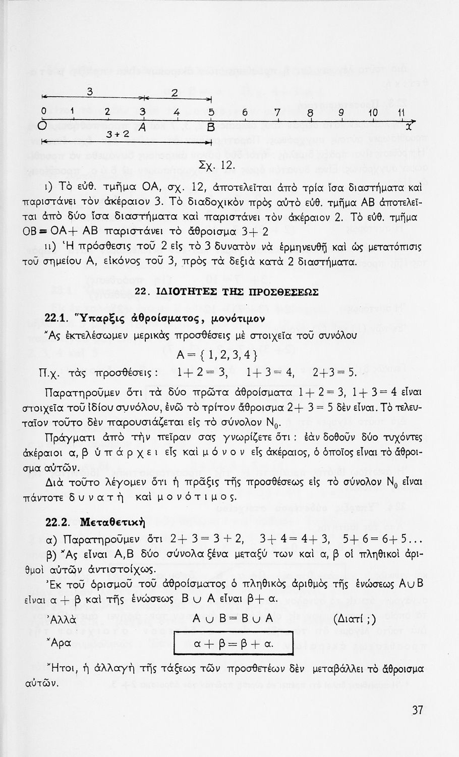 Σχολικό εγχειρίδιο Μαθηματικών Α' Γυμνασίου που περιέχει άλγεβρα με έμφαση στις αριθμητικές πράξεις με ακέραιους, δεκαδικούς και κλάσματα, και γεωμετρία με έμφαση στην επιπεδομετρία. Περιέχει και εισαγωγή στη θεωρία των συνόλων. Φέρει το σύμβολο της δικτατορίας.