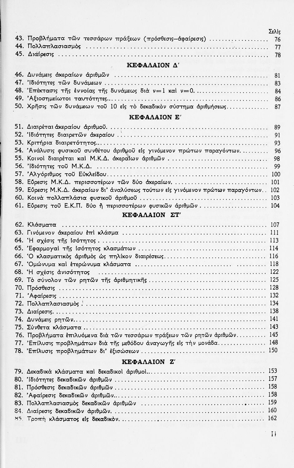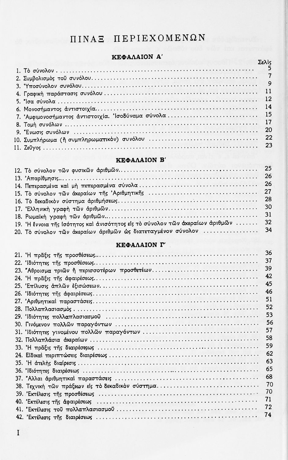 Σχολικό εγχειρίδιο Μαθηματικών Α' Γυμνασίου που περιέχει άλγεβρα με έμφαση στις αριθμητικές πράξεις με ακέραιους, δεκαδικούς και κλάσματα, και γεωμετρία με έμφαση στην επιπεδομετρία. Περιέχει και εισαγωγή στη θεωρία των συνόλων. Φέρει το σύμβολο της δικτατορίας.