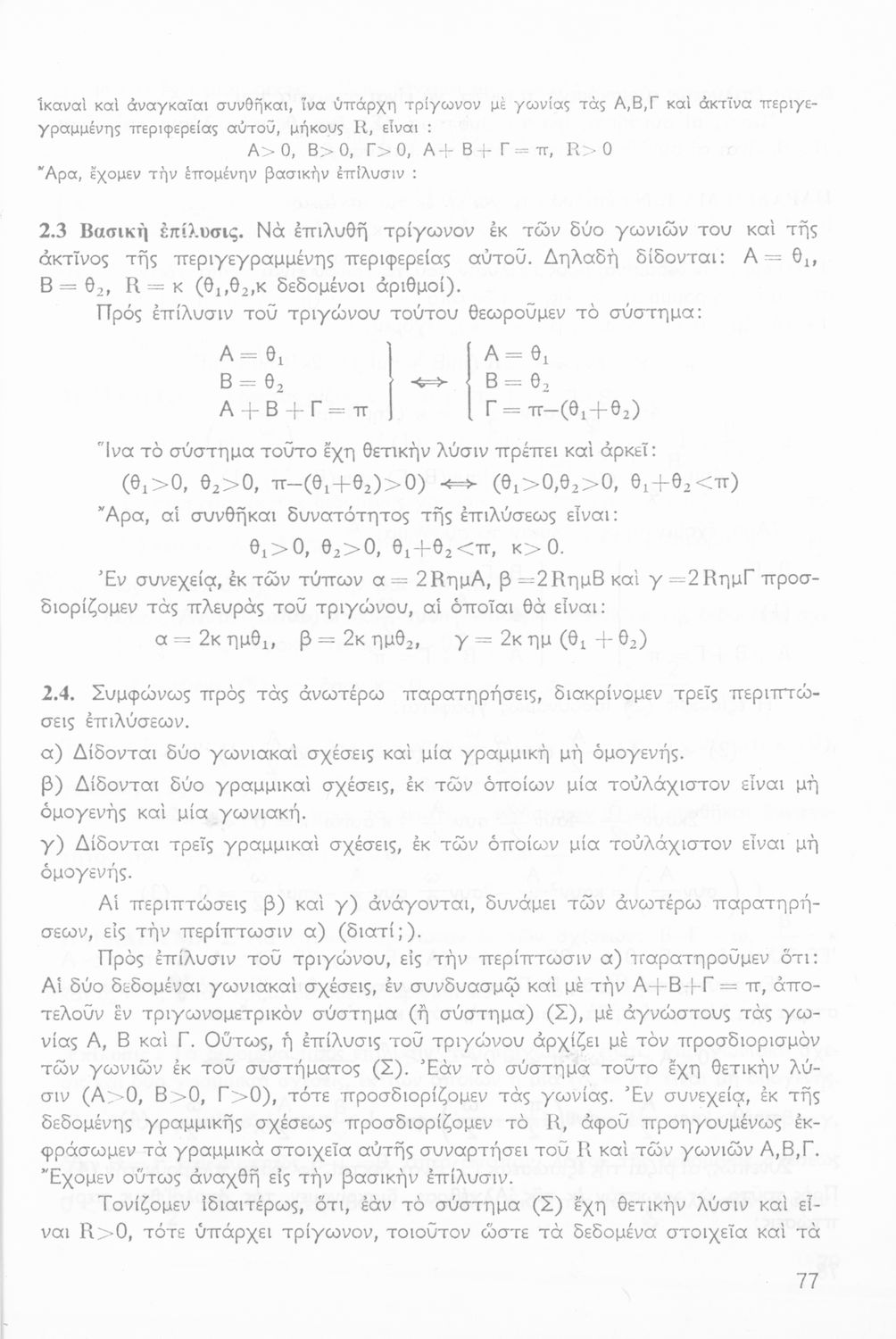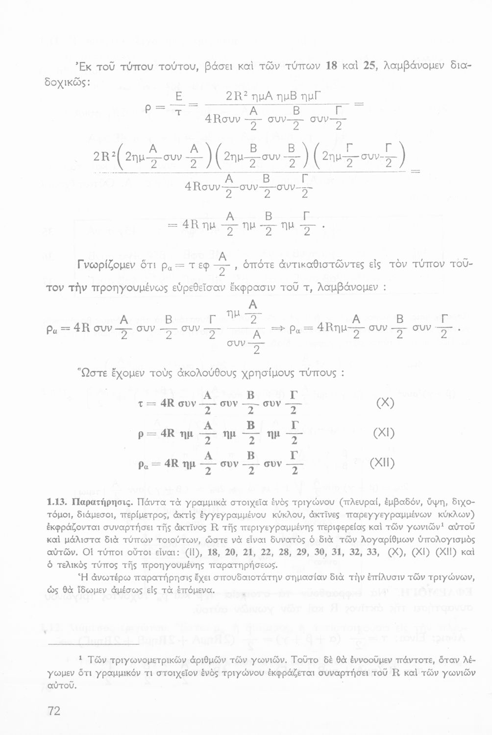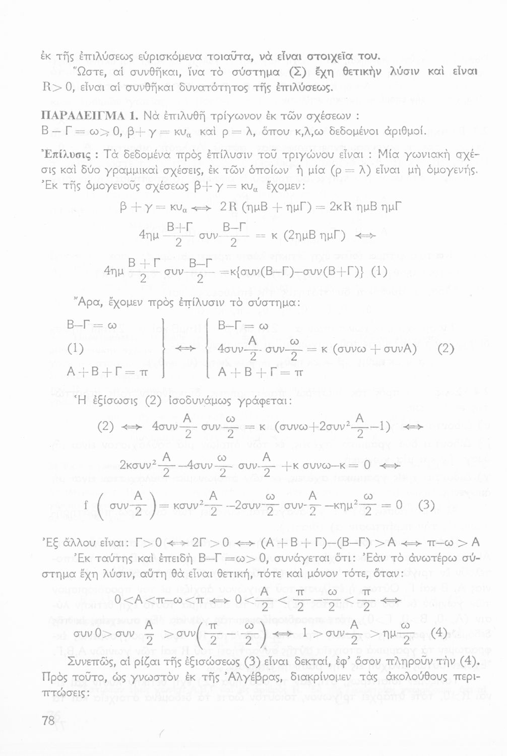 Το σύγγραμμα ήταν σχολικό εγχειρίδιο για το μάθημα των Μαθηματικών στο Γυμνάσιο. Περιέχει βασικές γνώσεις Τριγωνομετρίας. Αναφέρεται στις τριγωνομετρικές εξισώσεις, τα τριγωνομετρικά συστήματα, την απαλοιφή, ...