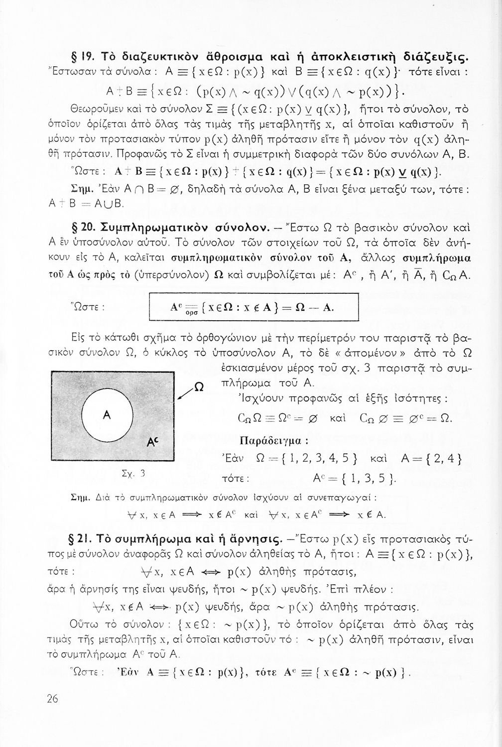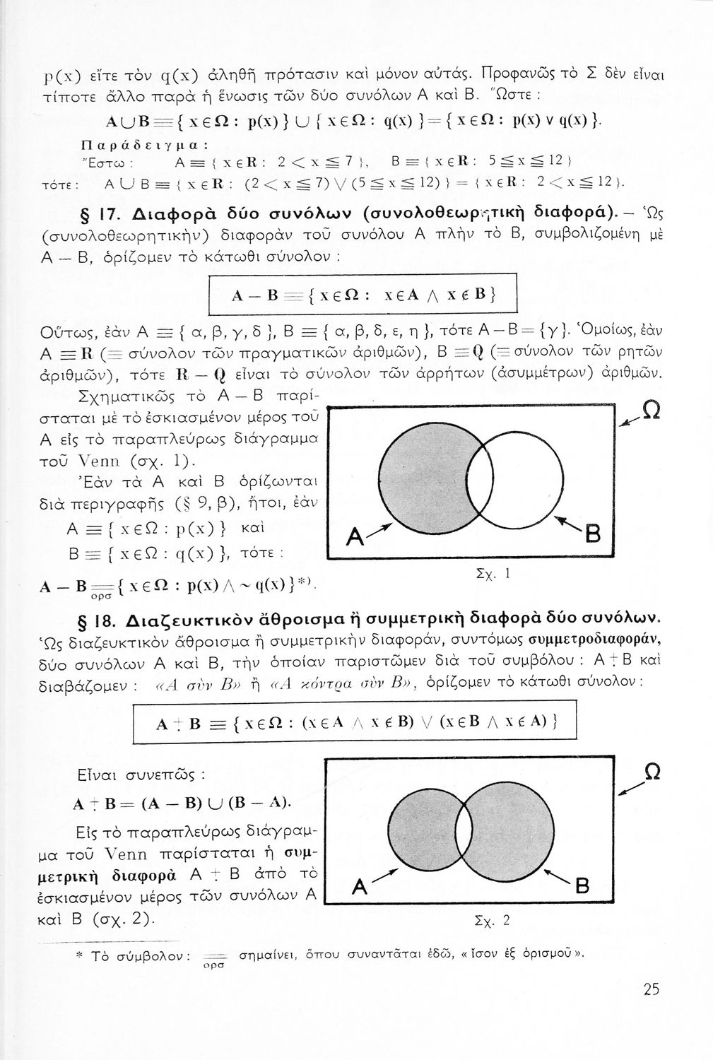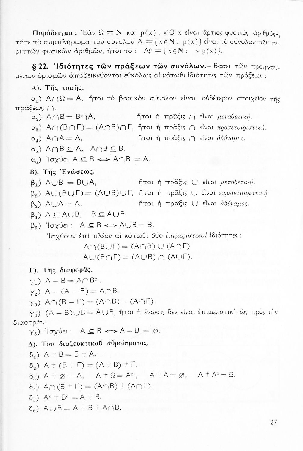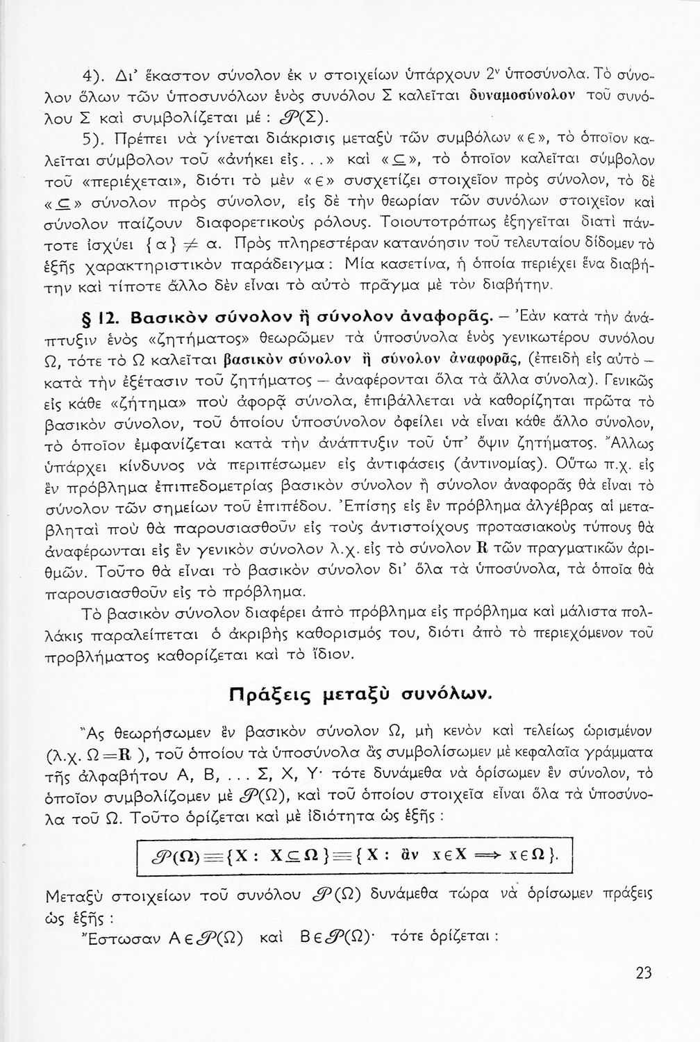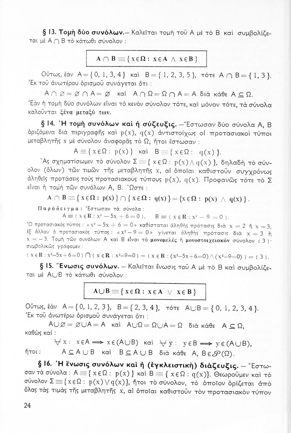 Σχολικό εγχειρίδιο Μαθηματικών Ε' Γυμνασίου που εστιάζει στη θεωρίας των συνόλων, τα ακέραια πολυώνυμα, τους πραγματικούς αριθμούς και τις πιθανότητες. Φέρει το σύμβολο της δικτατορίας.