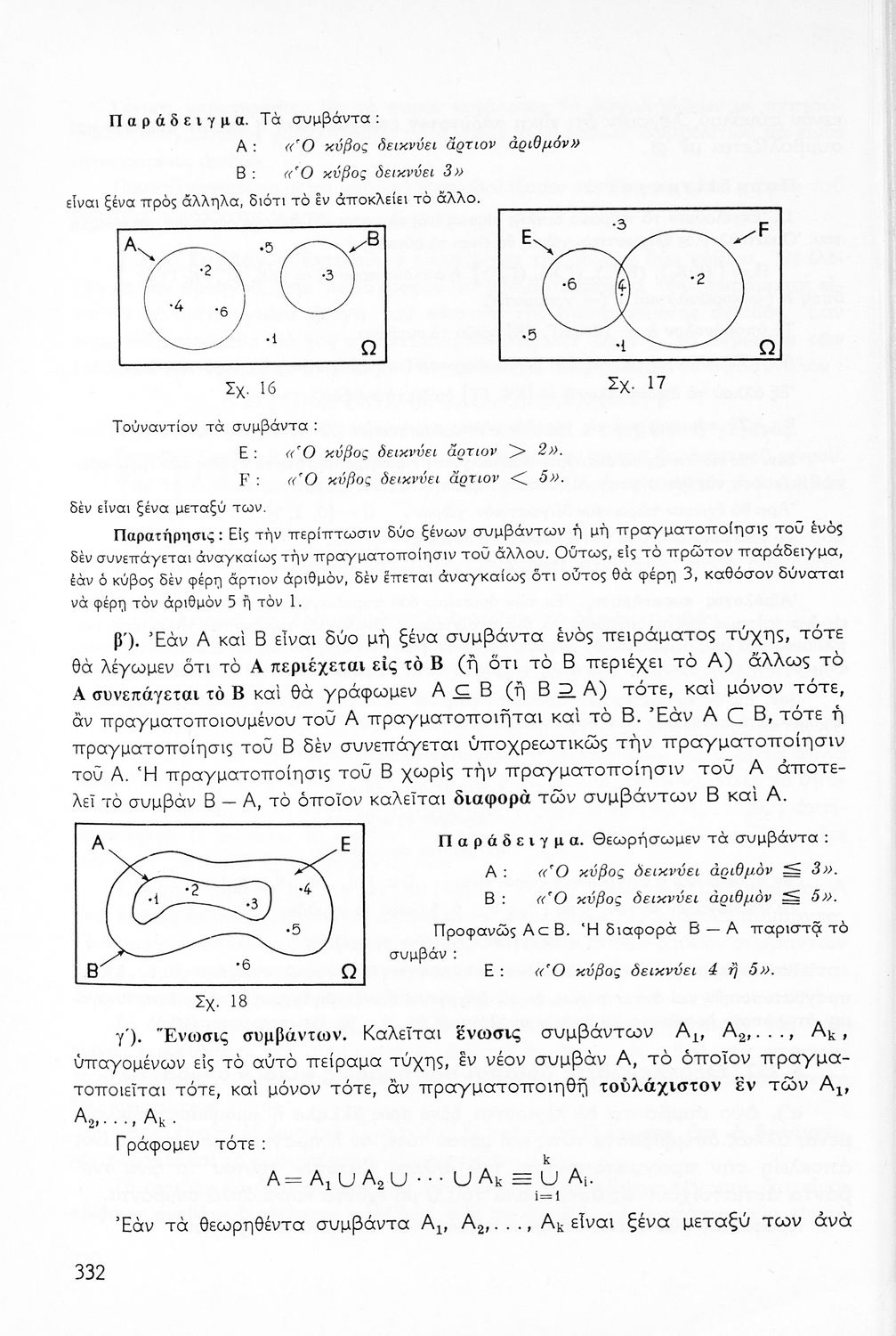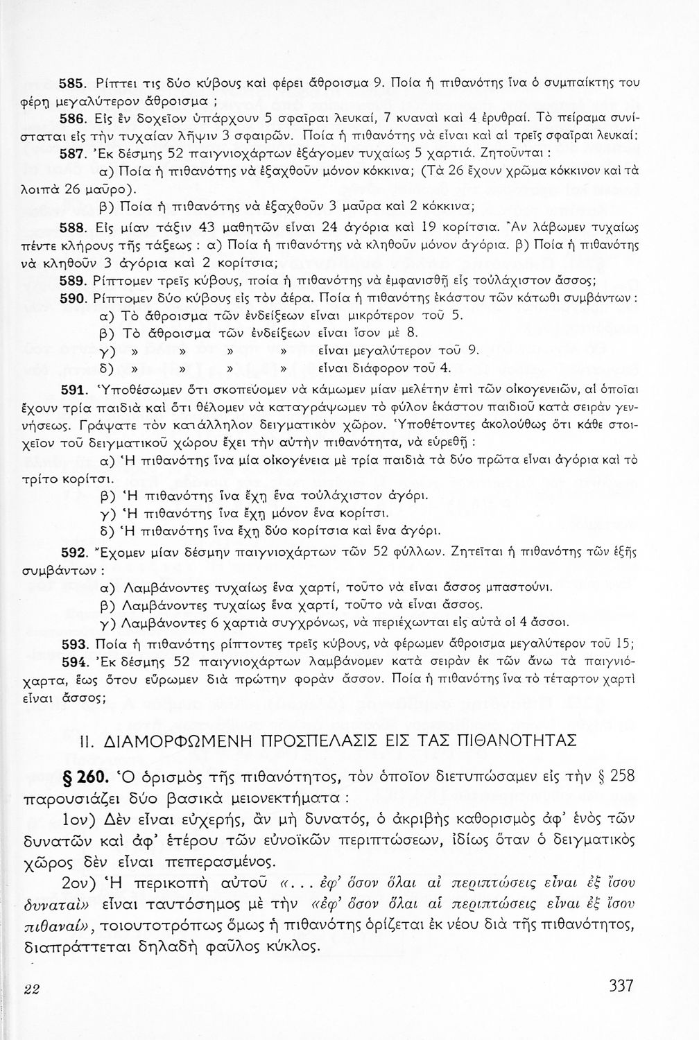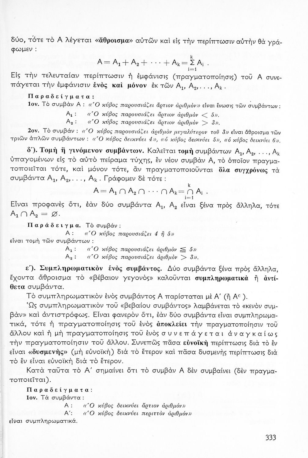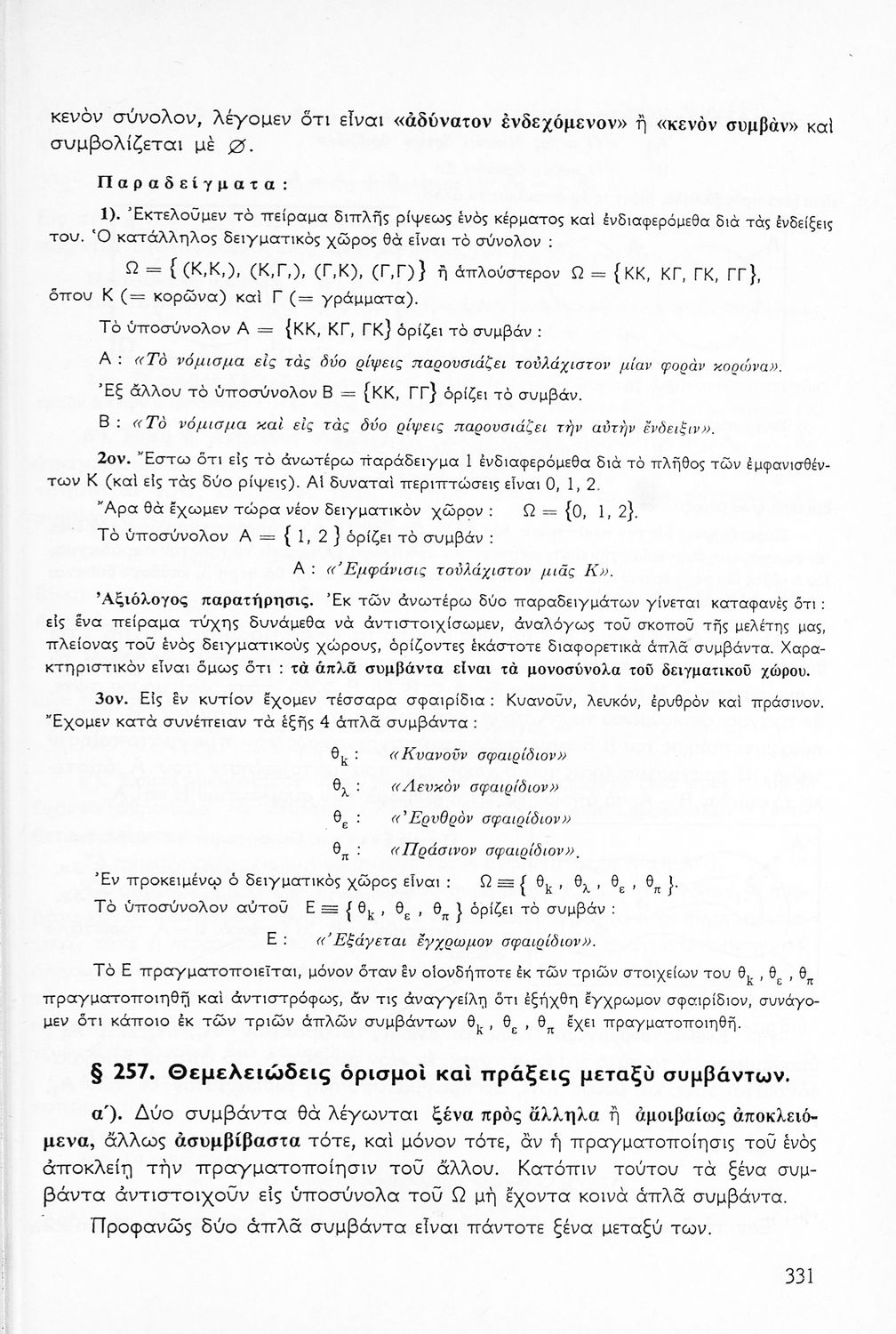 Σχολικό εγχειρίδιο Μαθηματικών Ε' Γυμνασίου που εστιάζει στη θεωρίας των συνόλων, τα ακέραια πολυώνυμα, τους πραγματικούς αριθμούς και τις πιθανότητες. Φέρει το σύμβολο της δικτατορίας.