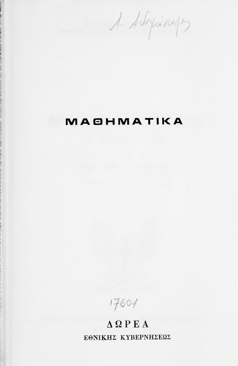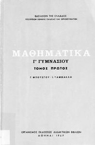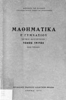 Βαθμίδα εκπαίδευσης: Δευτεροβάθμια Τάξη: Γ' Γυμνασίου Μάθημα: Μαθηματικά Γλώσσα: Απλή καθαρεύουσα Παρουσίαση περιεχομένου: Σχολικό εγχειρίδιο Μαθηματικών Γ΄ Γυμνασίου που περιλαμβάνει θεωρία, παραδείγματα και ασκήσεις. Φέρει το σύμβολο της δικτατορίας. |
