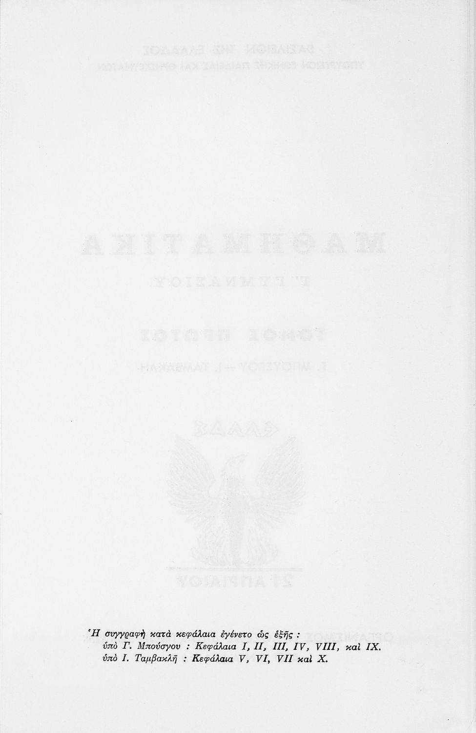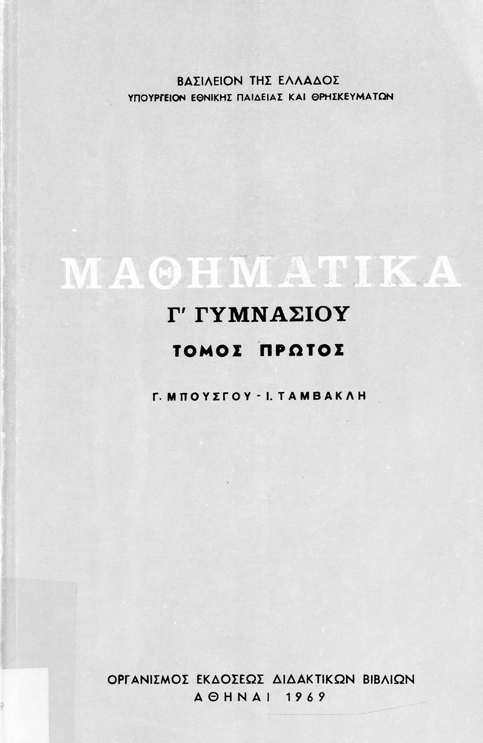 Κωδικός αναγνώρισης: 01-17601 Τίτλος: Μαθηματικά Γ΄ Γυμνασίου, τόμος Α΄ Συγγραφέας: Γ. Μπούσγος, Ι. Ταμβακλής, Παν. Ηλιάδης (επιμέλεια) Μέγεθος και υπόστρωμα: Σχολικό εγχειρίδιο, 23εκ., μαλακό εξώφυλλο, 197 σελίδες. Σκίτσα (ασπρόμαυρα). |