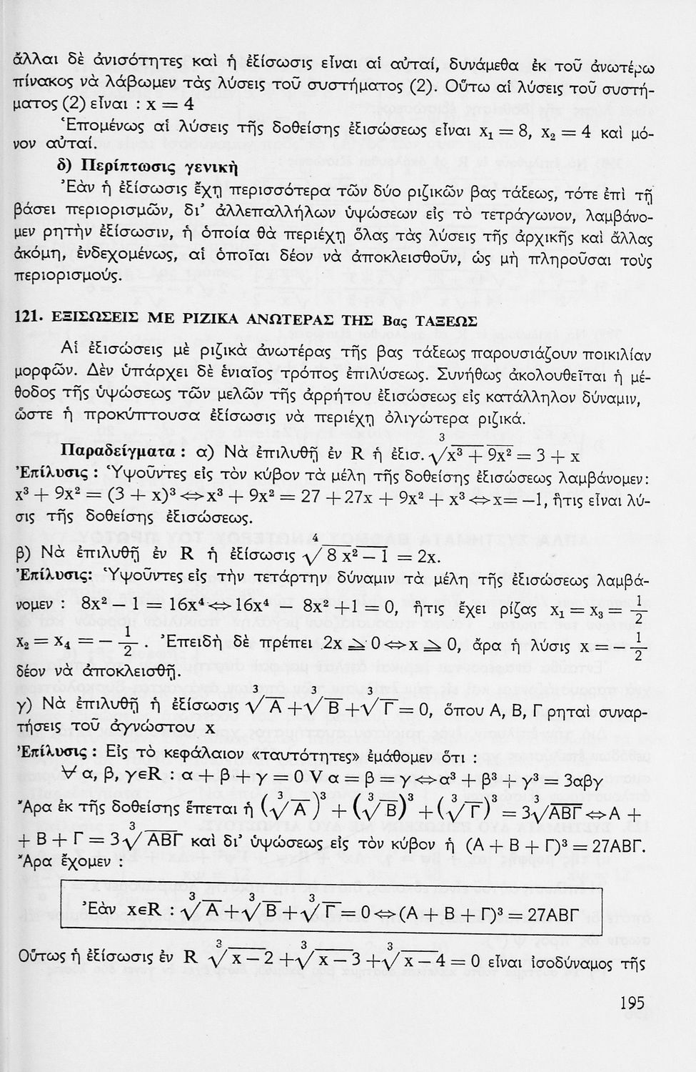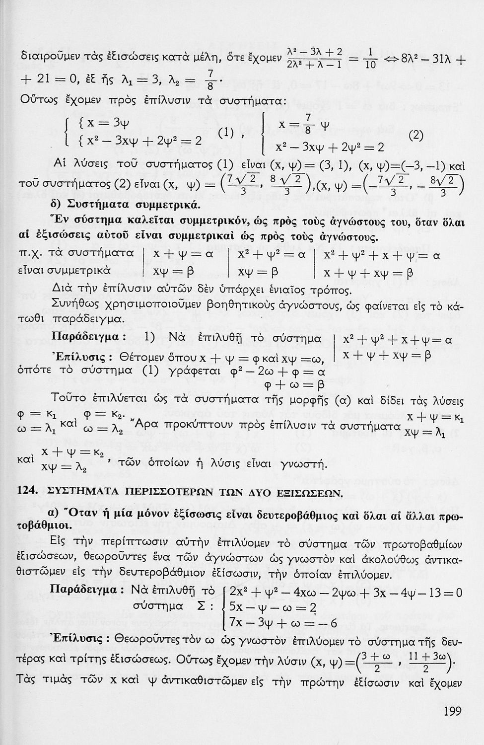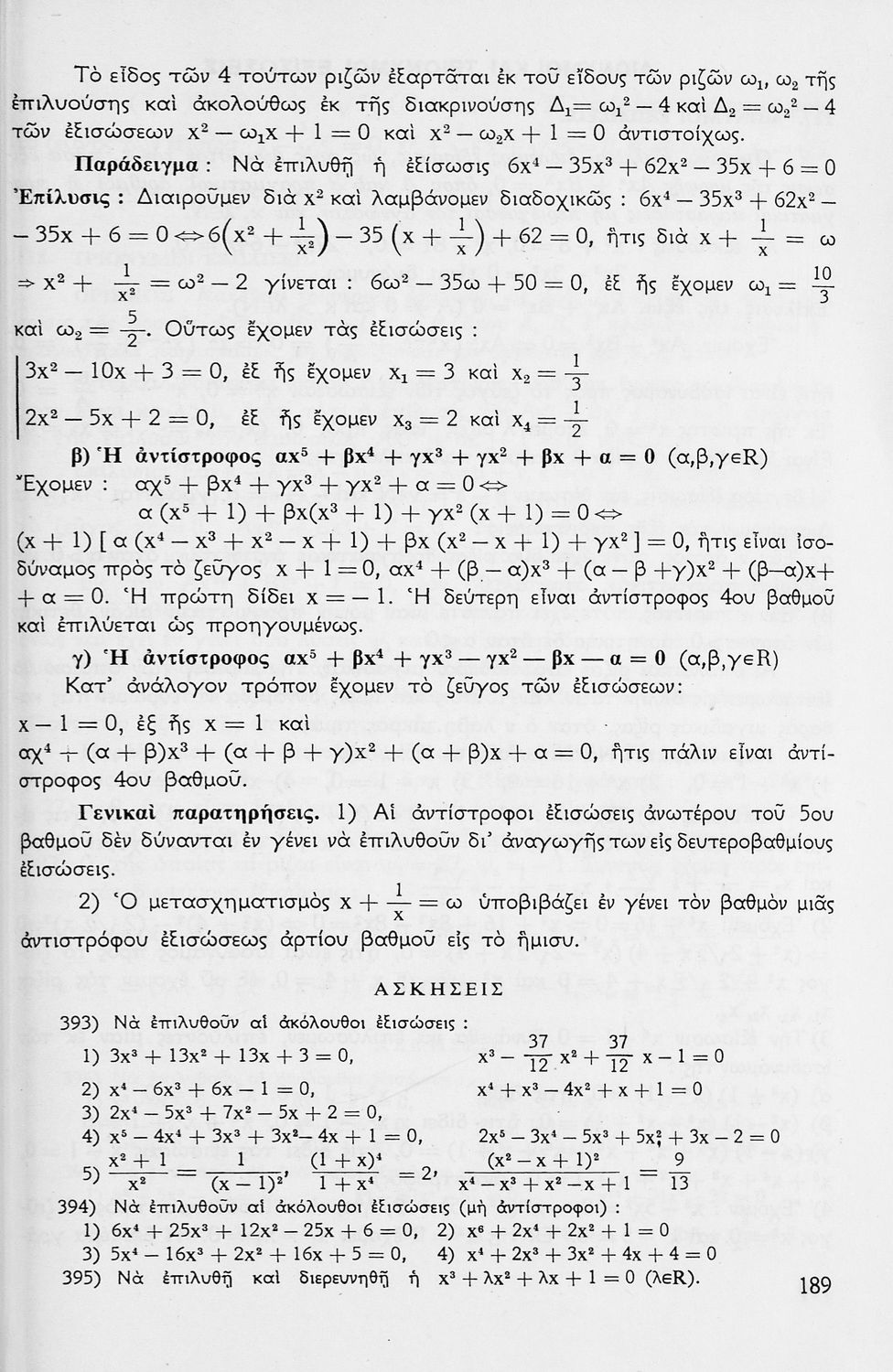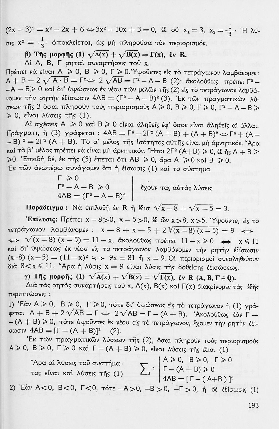 Σχολικό εγχειρίδιο Μαθηματικών Γυμνασίου που είναι χωρισμένο σε θεωρήματα, παραδείγματα και ασκήσεις και περιλαμβάνει στοιχεία Ανώτερης Άλγεβρας και Μαθηματικής Ανάλυσης.