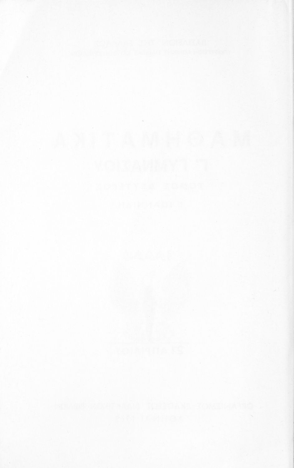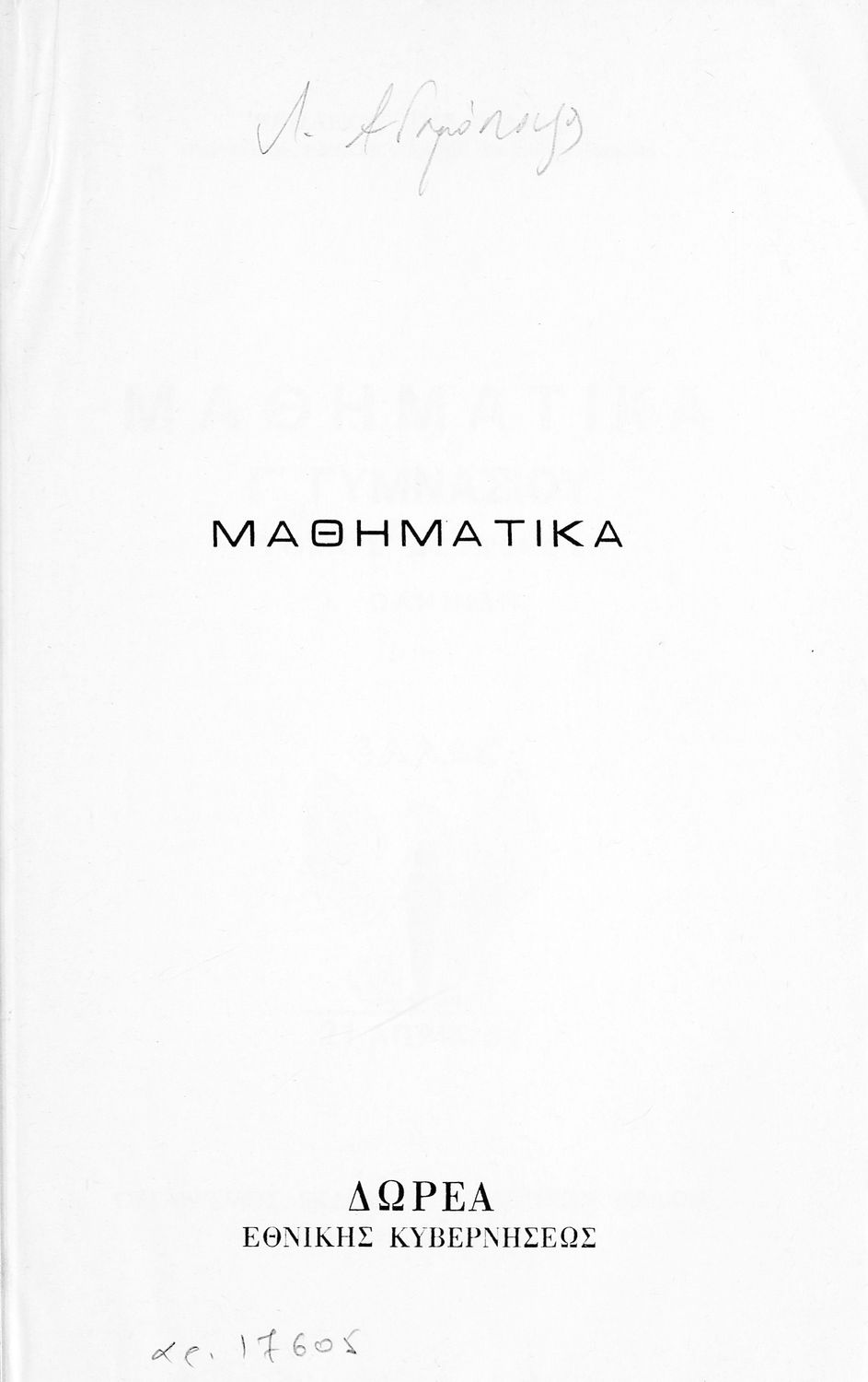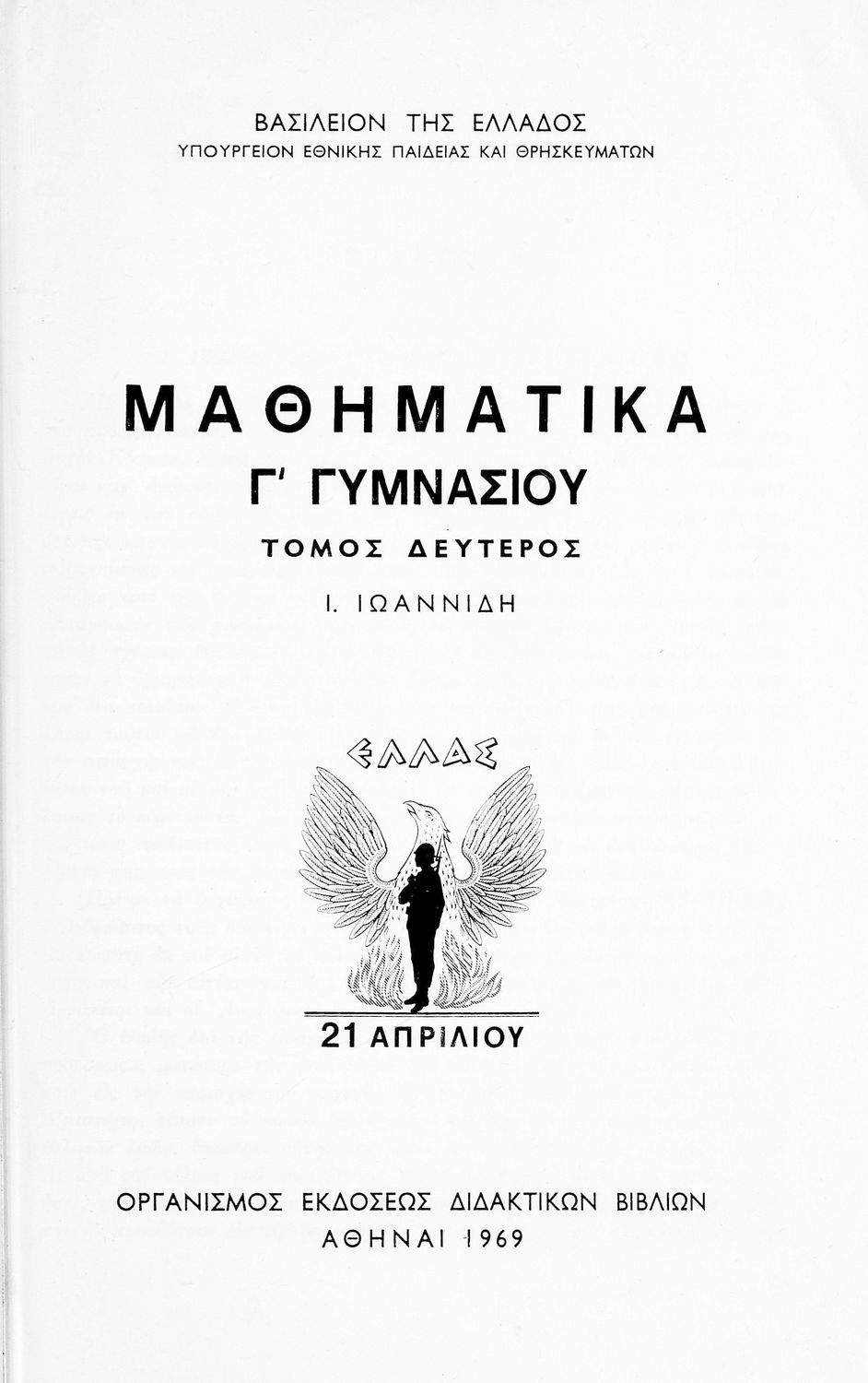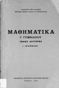 Βαθμίδα εκπαίδευσης: Δευτεροβάθμια Τάξη: Γ' Γυμνασίου Μάθημα: Μαθηματικά Γλώσσα: Απλή καθαρεύουσα Παρουσίαση περιεχομένου: Σχολικό εγχειρίδιο Μαθηματικών Γ΄ Γυμνασίου που εστιάζει στη Γεωμετρία. Φέρει το σύμβολο της δικτατορίας. |
