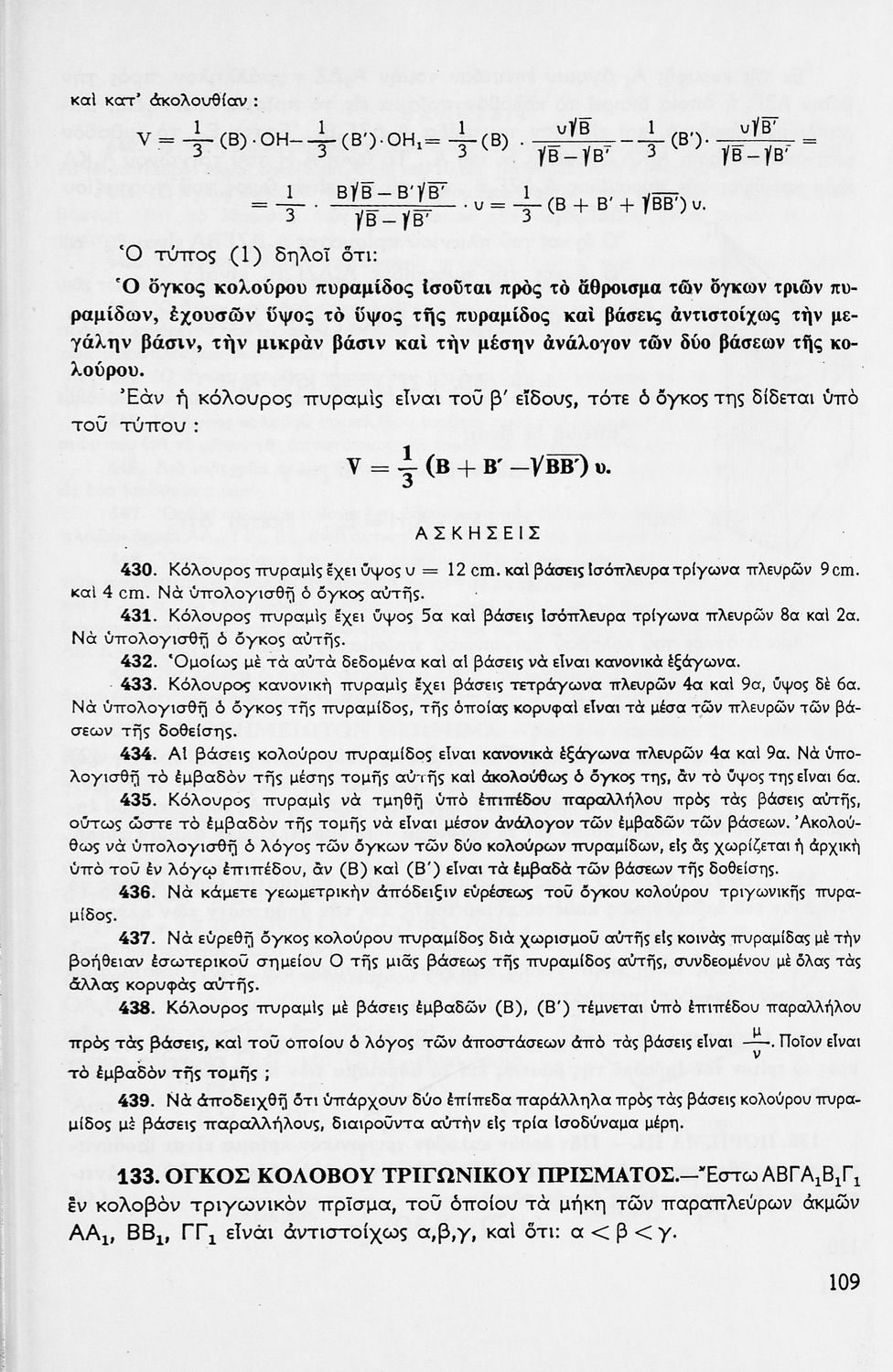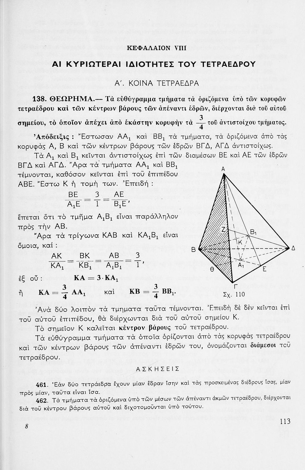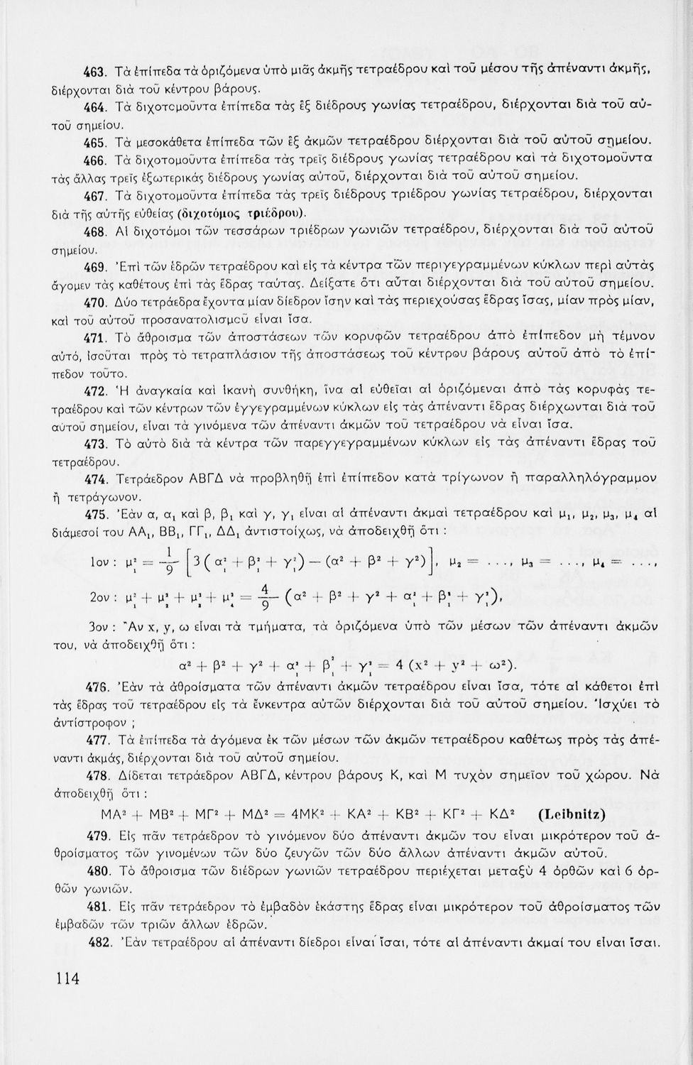 Σχολικό εγχειρίδιο Γεωμετρίας για τις Γ΄, Δ΄, Ε΄, ΣΤ΄ Γυμνασίου που περιλαμβάνει θεωρία και ασκήσεις και είναι χωρισμένο σε Επιπεδομετρία και Στερεομετρία. Φέρει το σύμβολο της δικτατορίας.