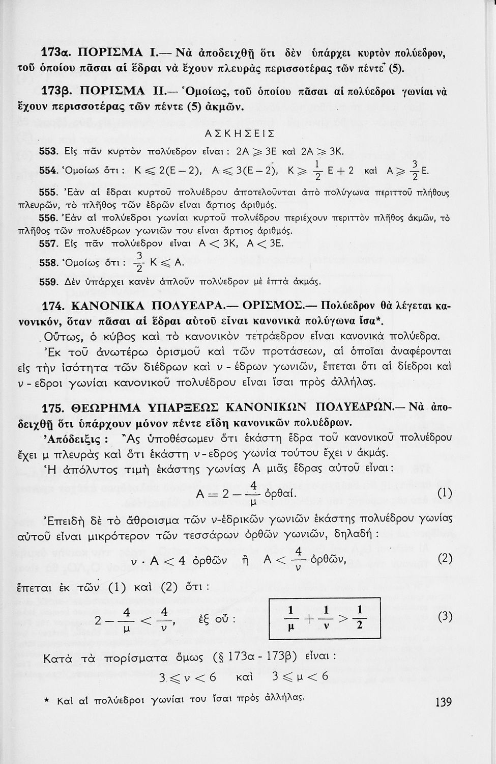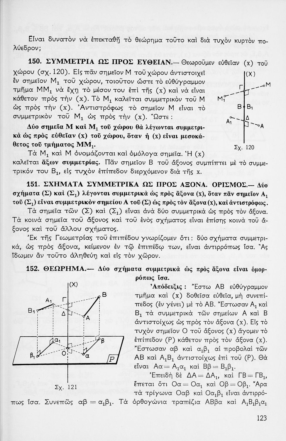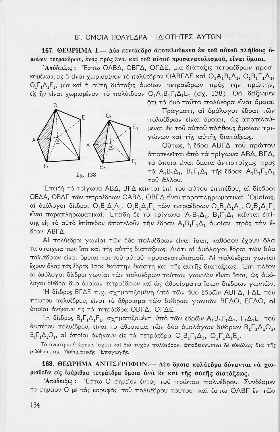Σχολικό εγχειρίδιο Μαθηματικών για τις Δ΄, Ε΄ και ΣΤ΄ Γυμνασίου χωρισμένο σε θεωρήματα και ασκήσεις που εστιάζει στη Γεωμετρία. Φέρει το σύμβολο της δικτατορίας.