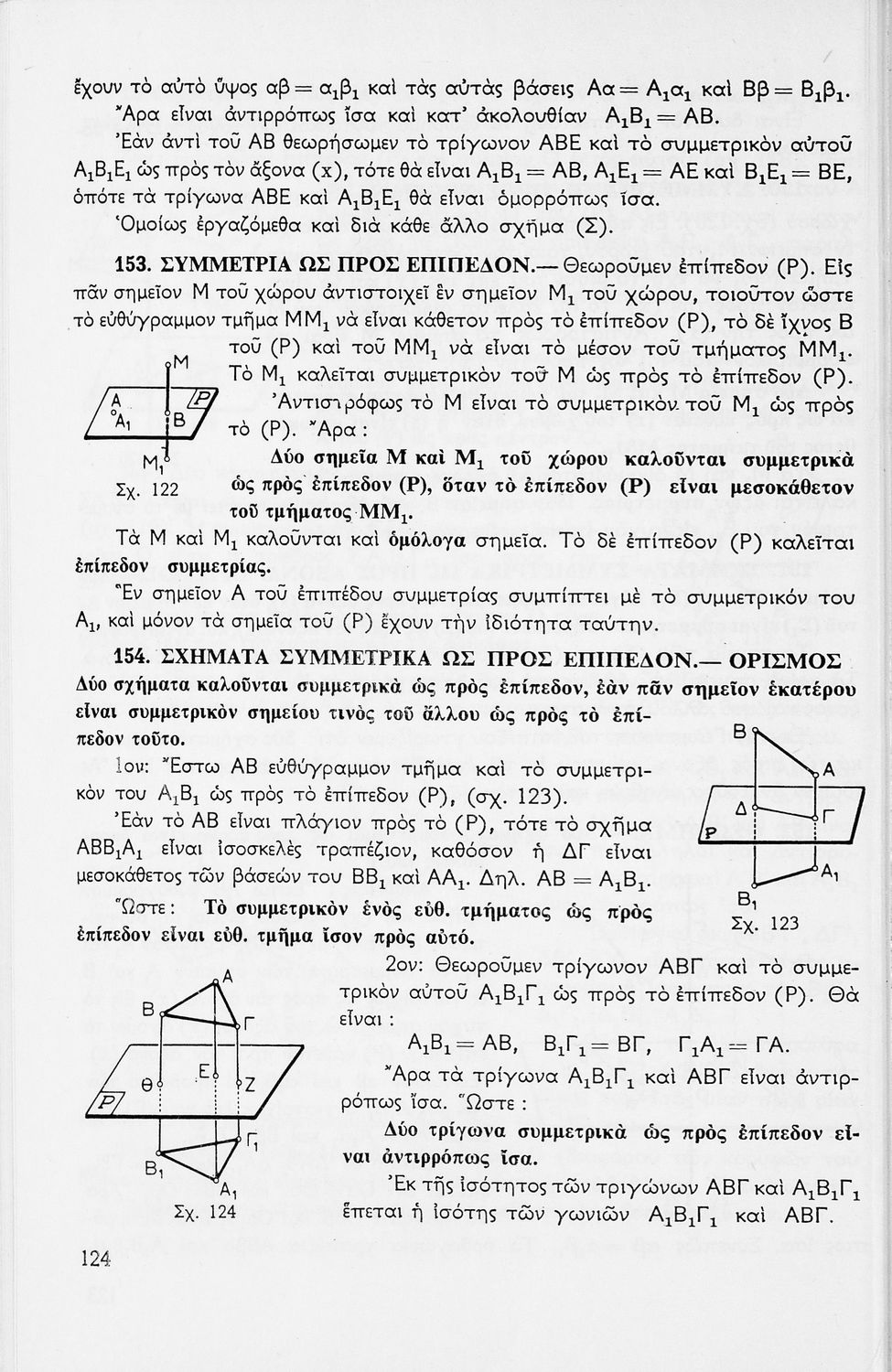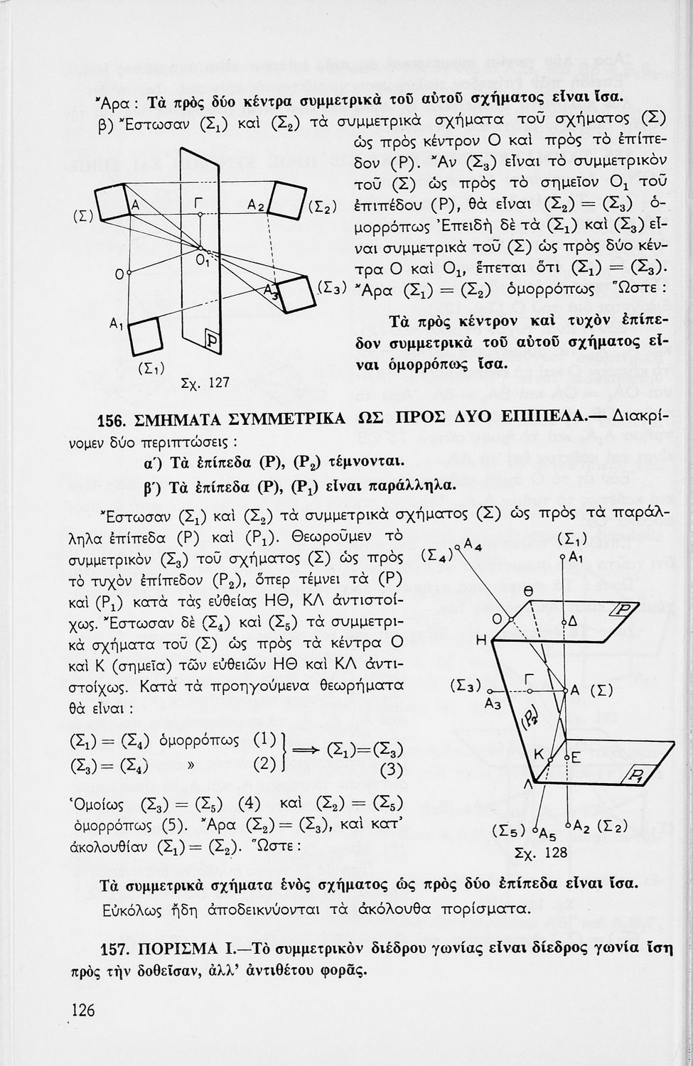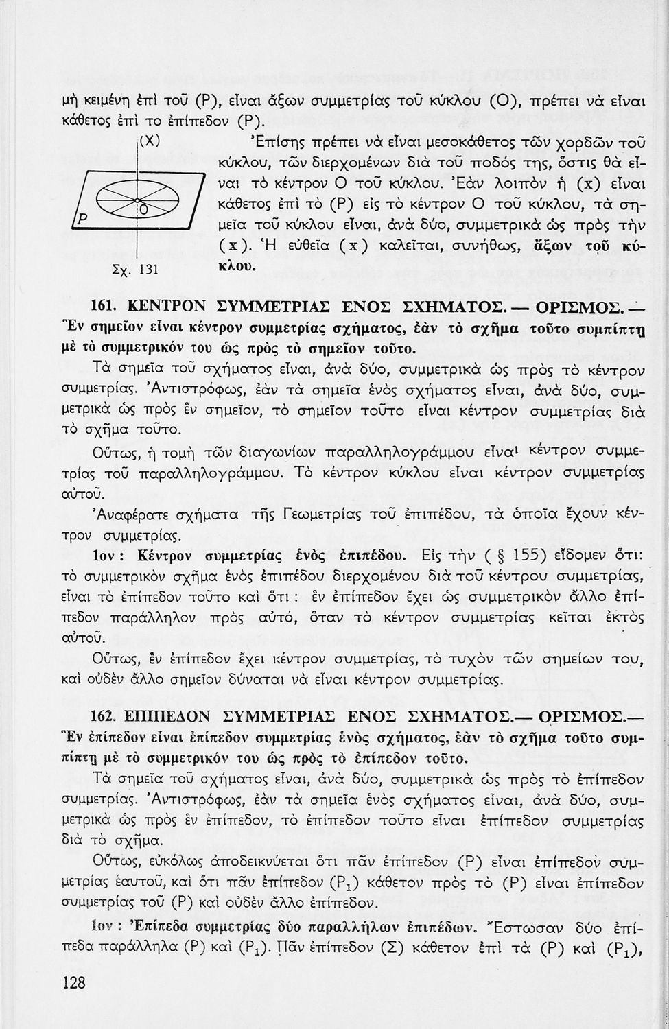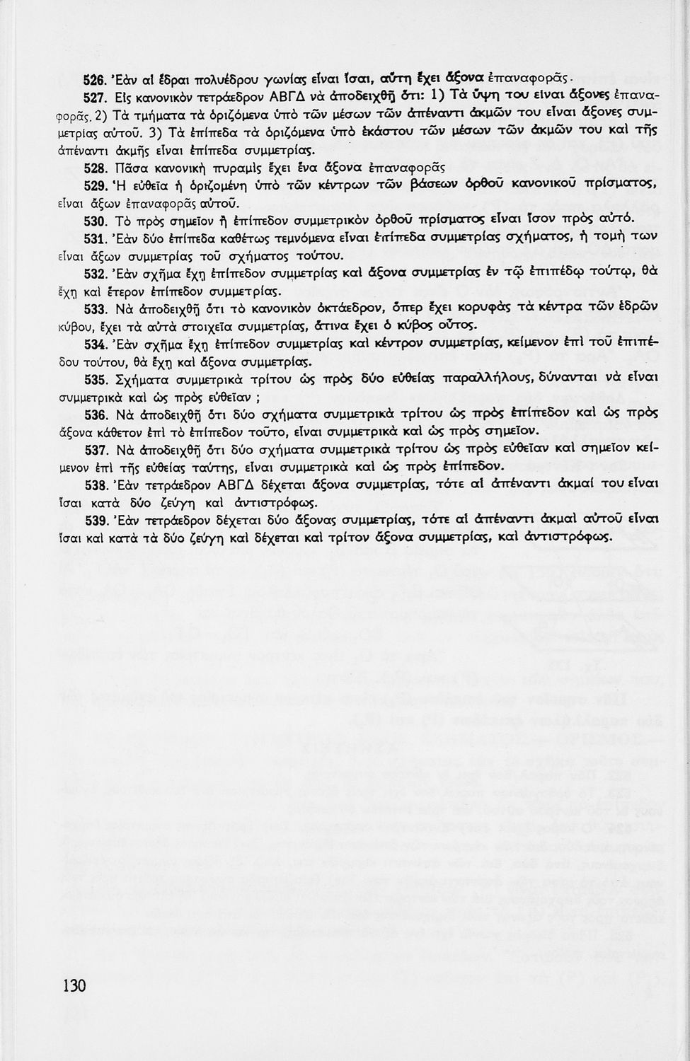 Σχολικό εγχειρίδιο Γεωμετρίας για τις Γ΄, Δ΄, Ε΄, ΣΤ΄ Γυμνασίου που περιλαμβάνει θεωρία και ασκήσεις και είναι χωρισμένο σε Επιπεδομετρία και Στερεομετρία. Φέρει το σύμβολο της δικτατορίας.