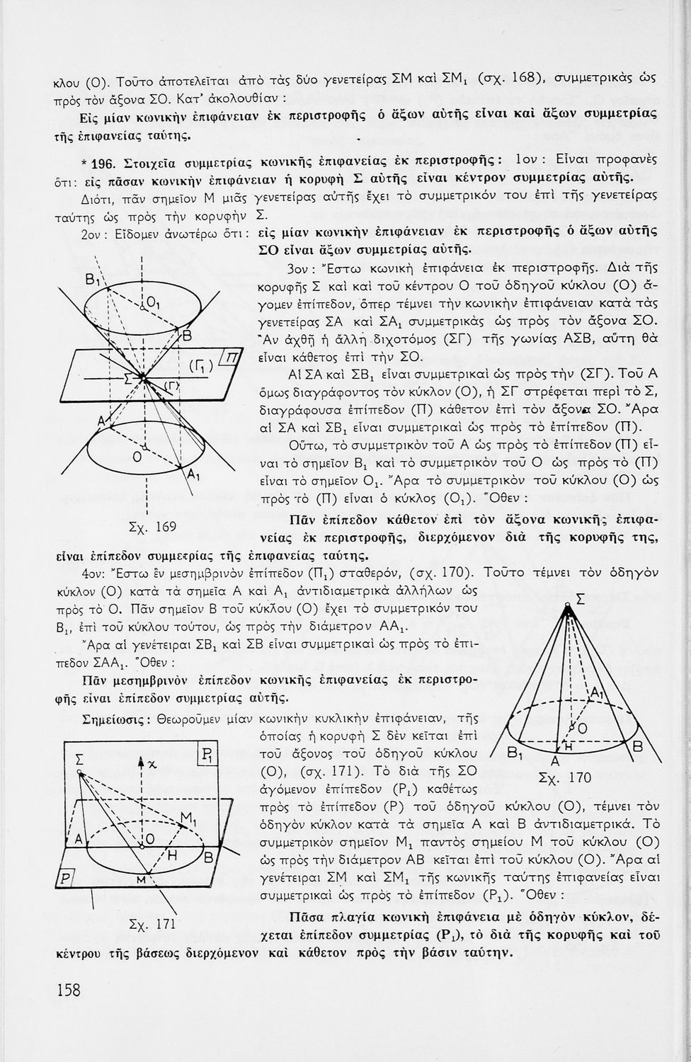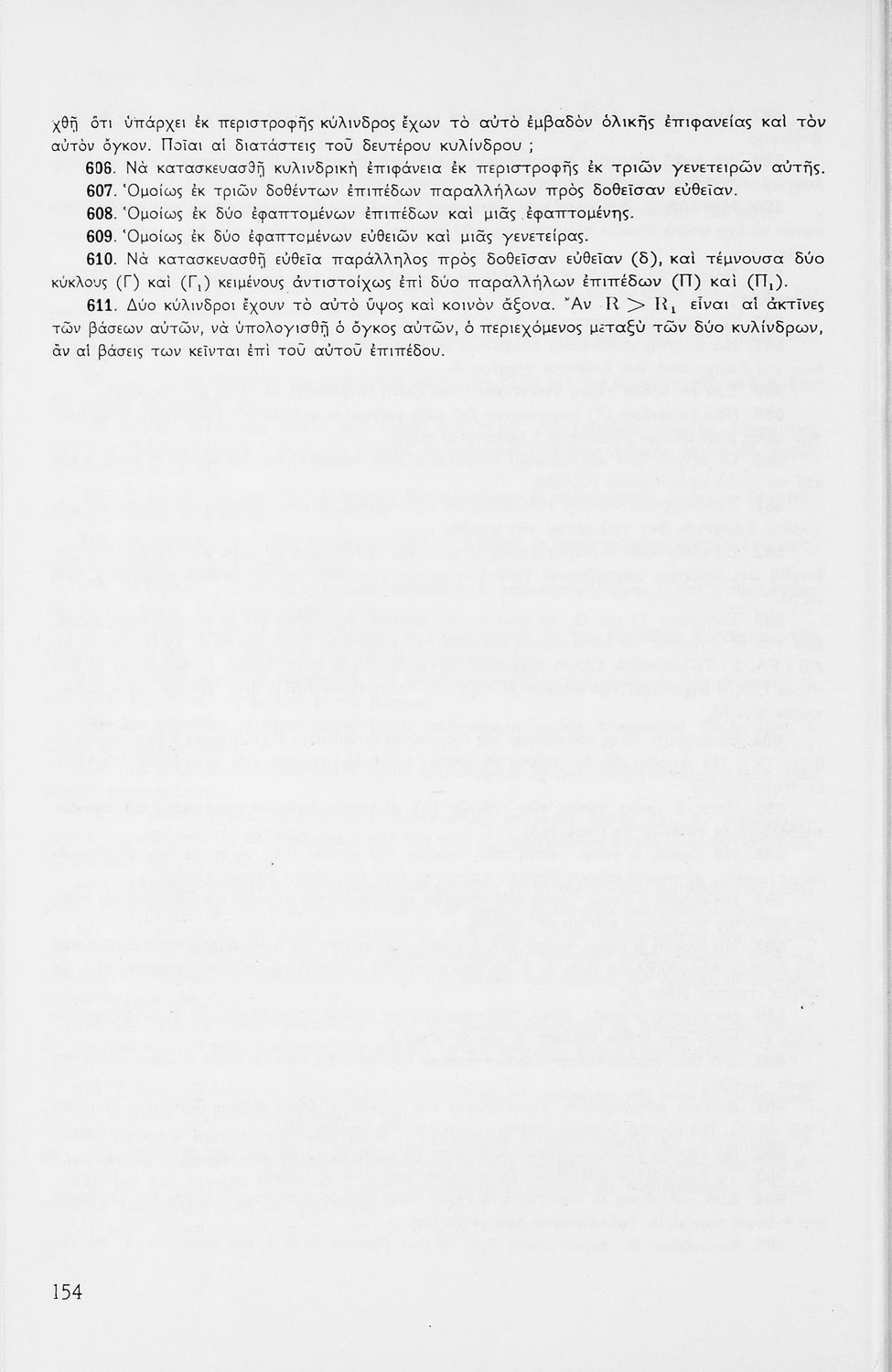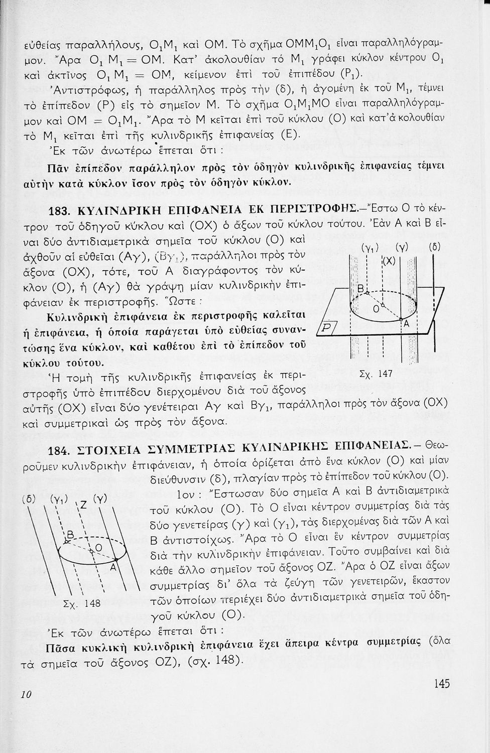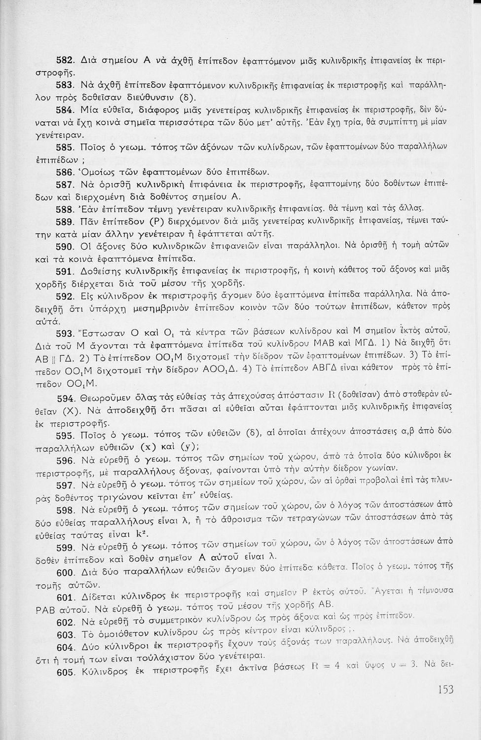 Σχολικό εγχειρίδιο Γεωμετρίας για τις Γ΄, Δ΄, Ε΄, ΣΤ΄ Γυμνασίου που περιλαμβάνει θεωρία και ασκήσεις και είναι χωρισμένο σε Επιπεδομετρία και Στερεομετρία. Φέρει το σύμβολο της δικτατορίας.