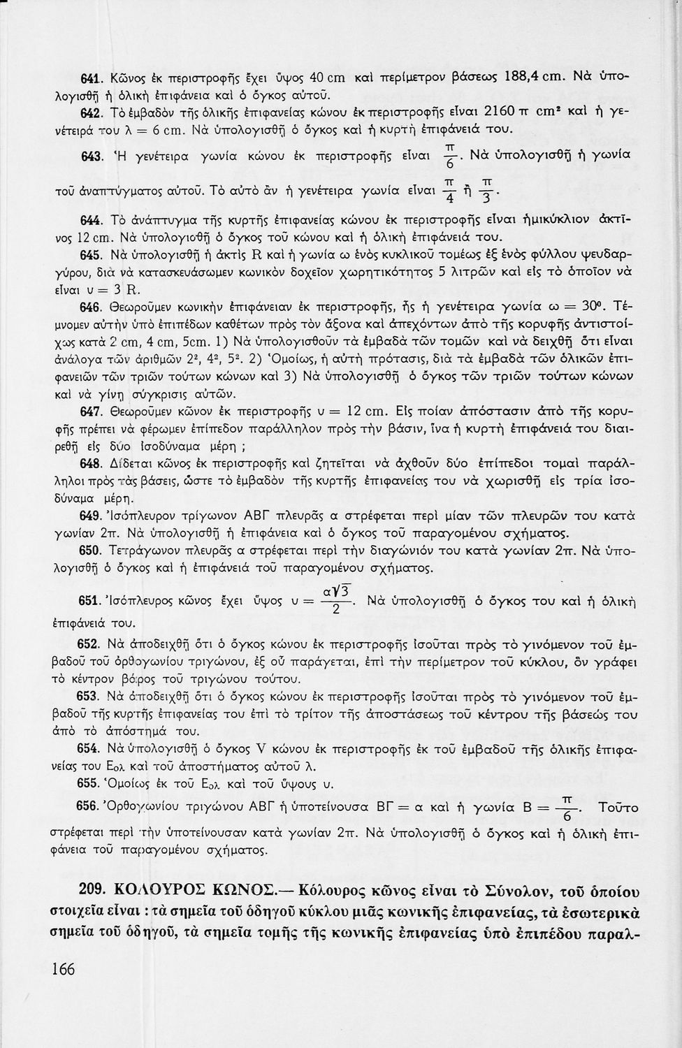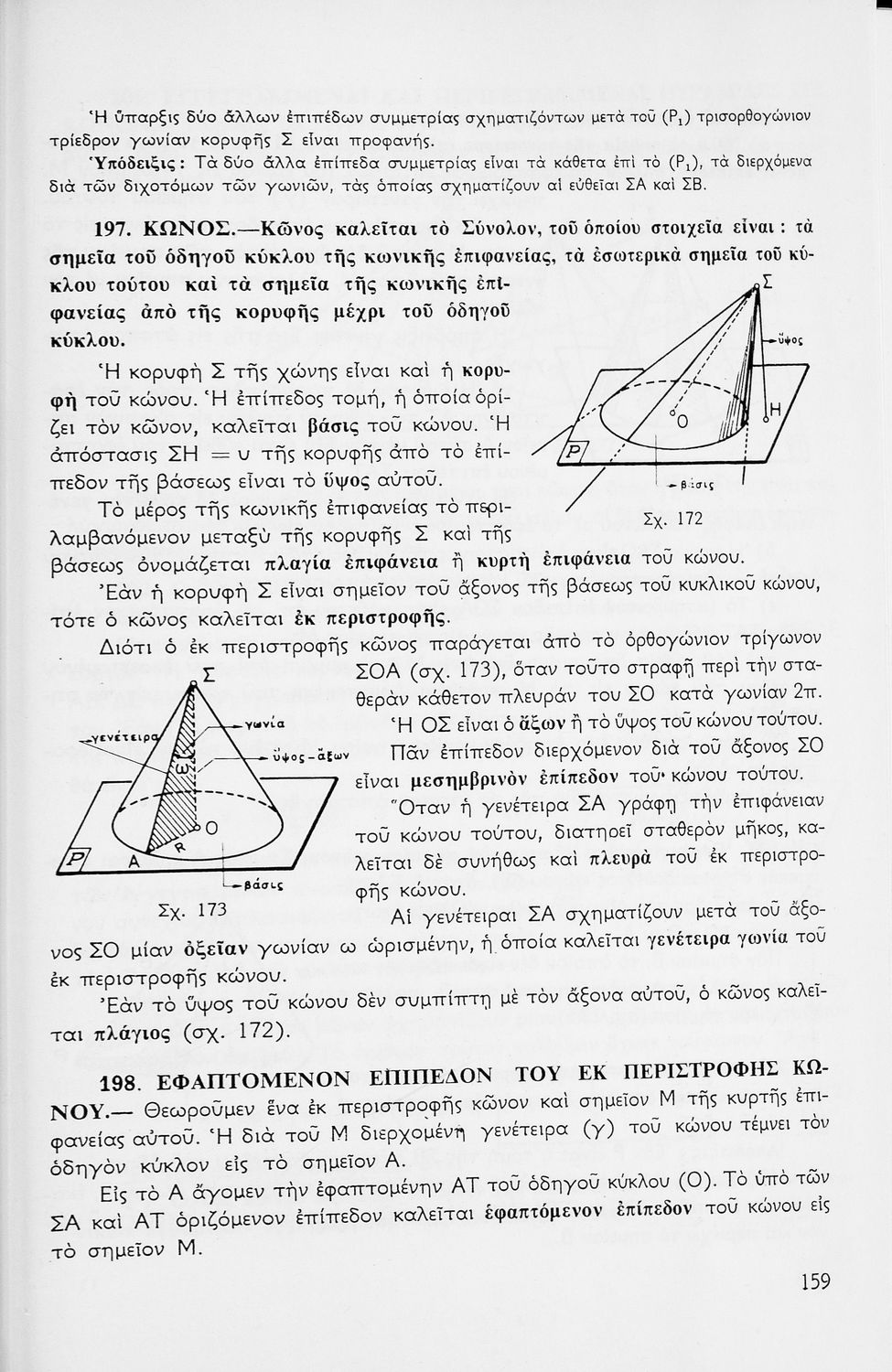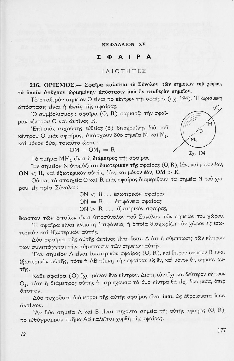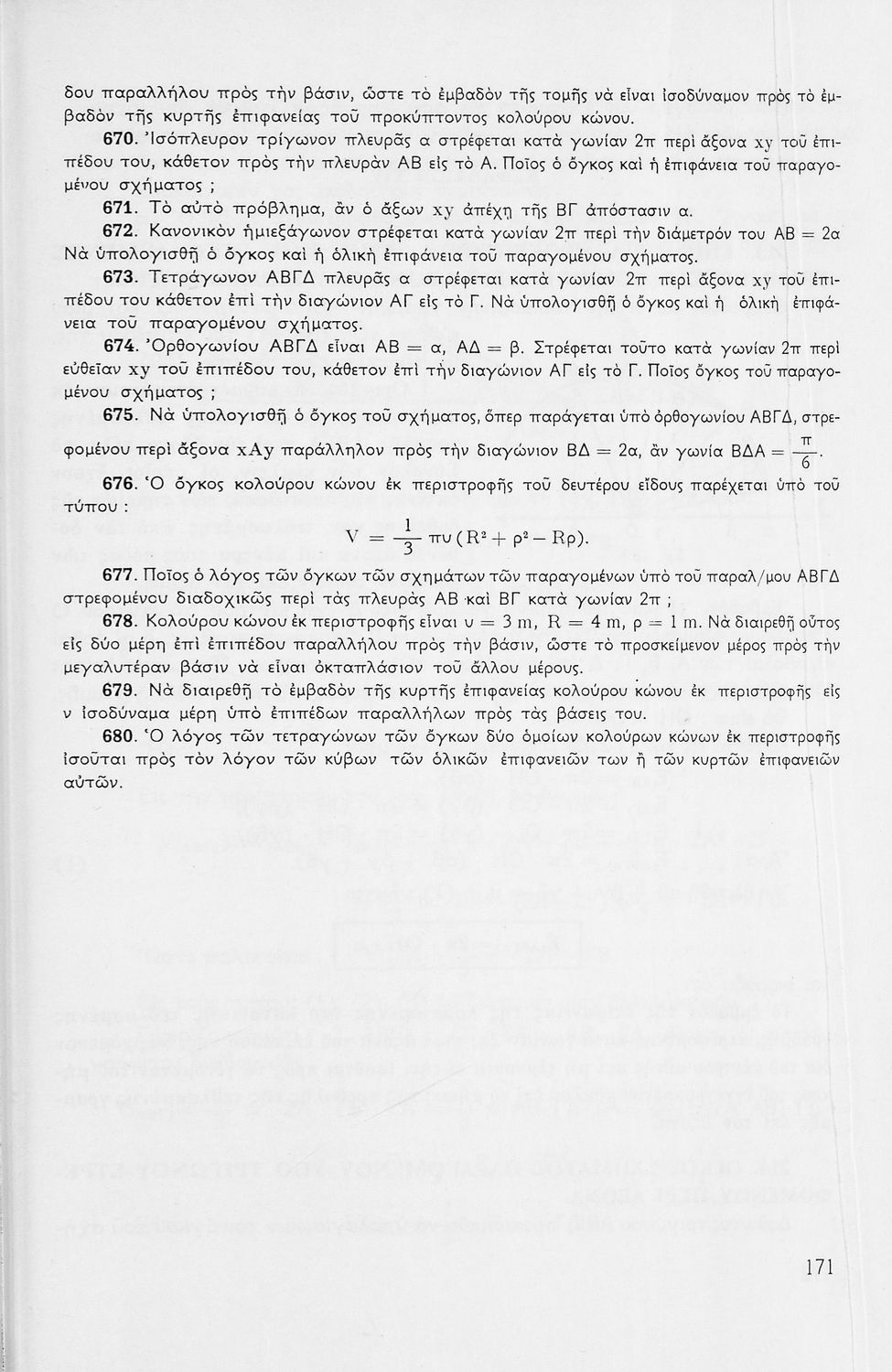 Σχολικό εγχειρίδιο Γεωμετρίας για τις Γ΄, Δ΄, Ε΄, ΣΤ΄ Γυμνασίου που περιλαμβάνει θεωρία και ασκήσεις και είναι χωρισμένο σε Επιπεδομετρία και Στερεομετρία. Φέρει το σύμβολο της δικτατορίας.