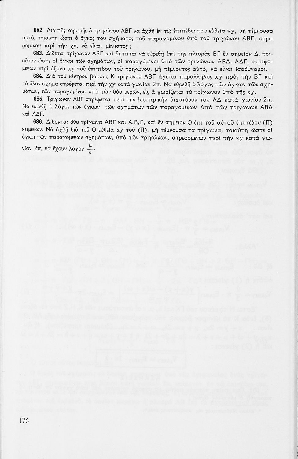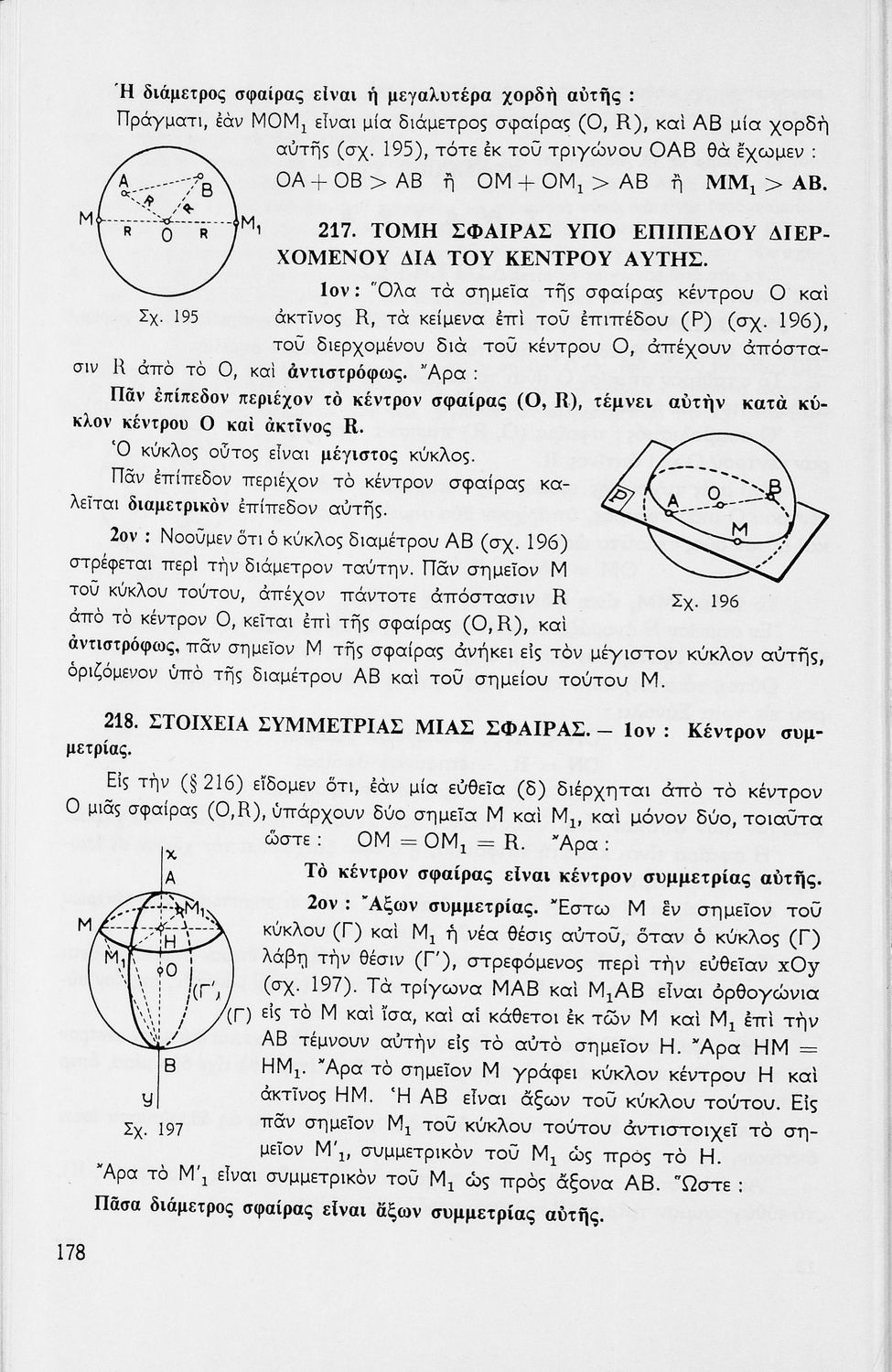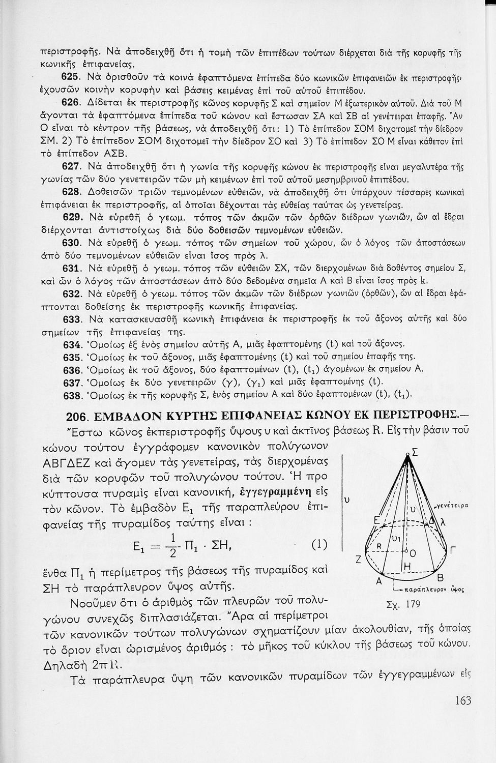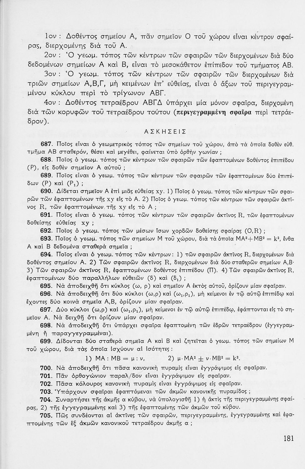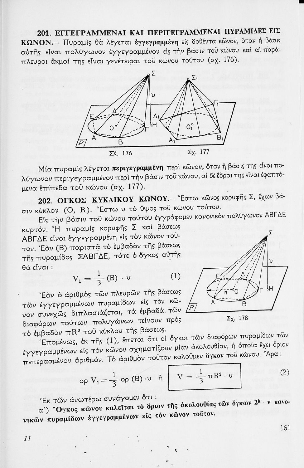 Σχολικό εγχειρίδιο Γεωμετρίας για τις Γ΄, Δ΄, Ε΄, ΣΤ΄ Γυμνασίου που περιλαμβάνει θεωρία και ασκήσεις και είναι χωρισμένο σε Επιπεδομετρία και Στερεομετρία. Φέρει το σύμβολο της δικτατορίας.