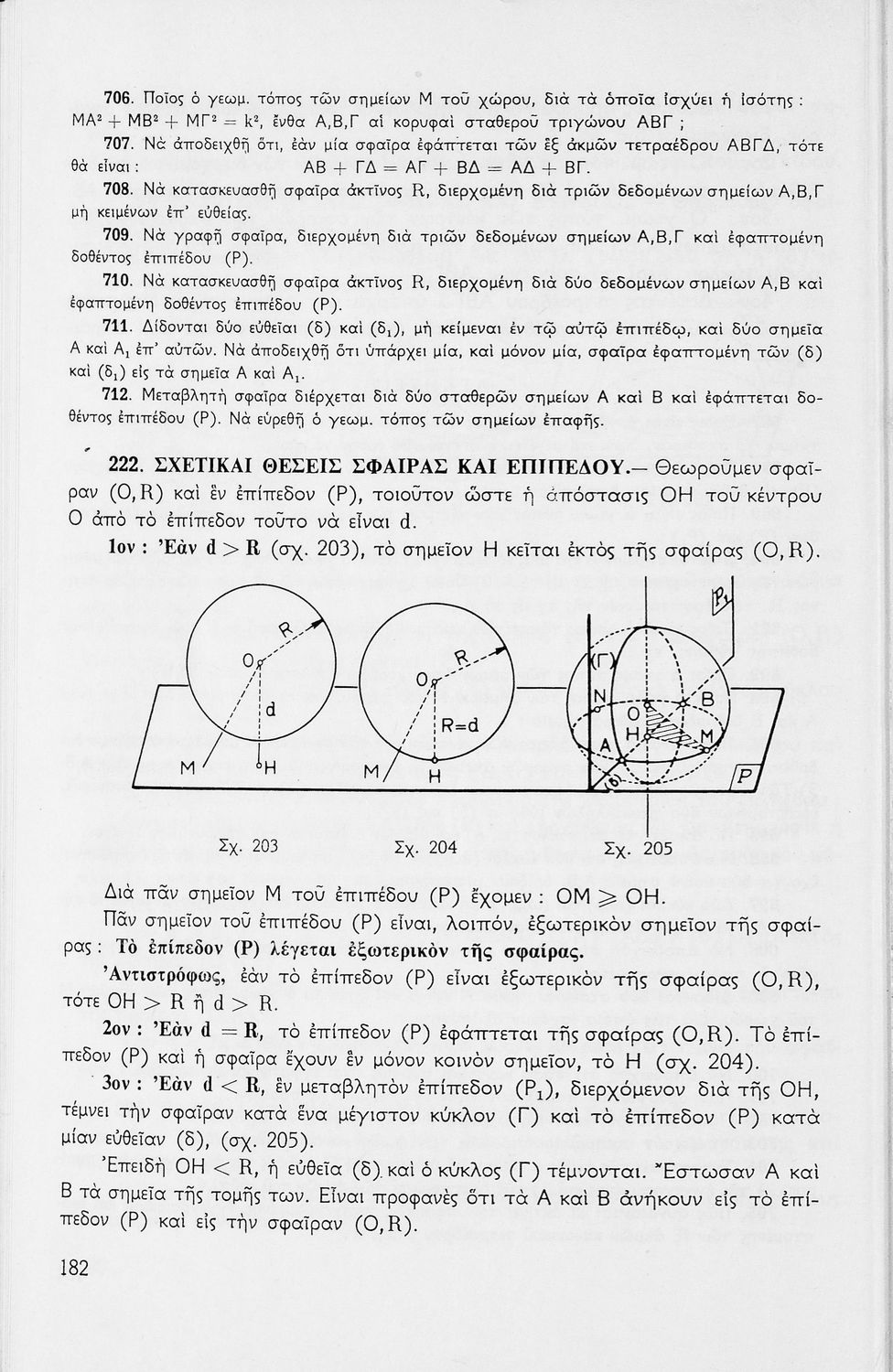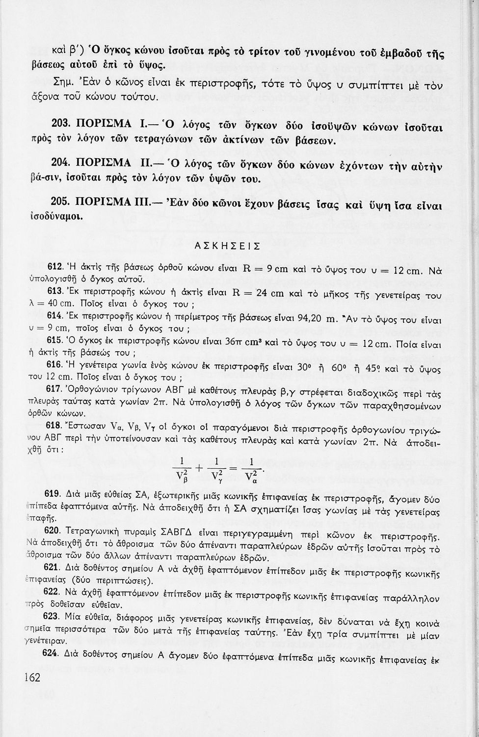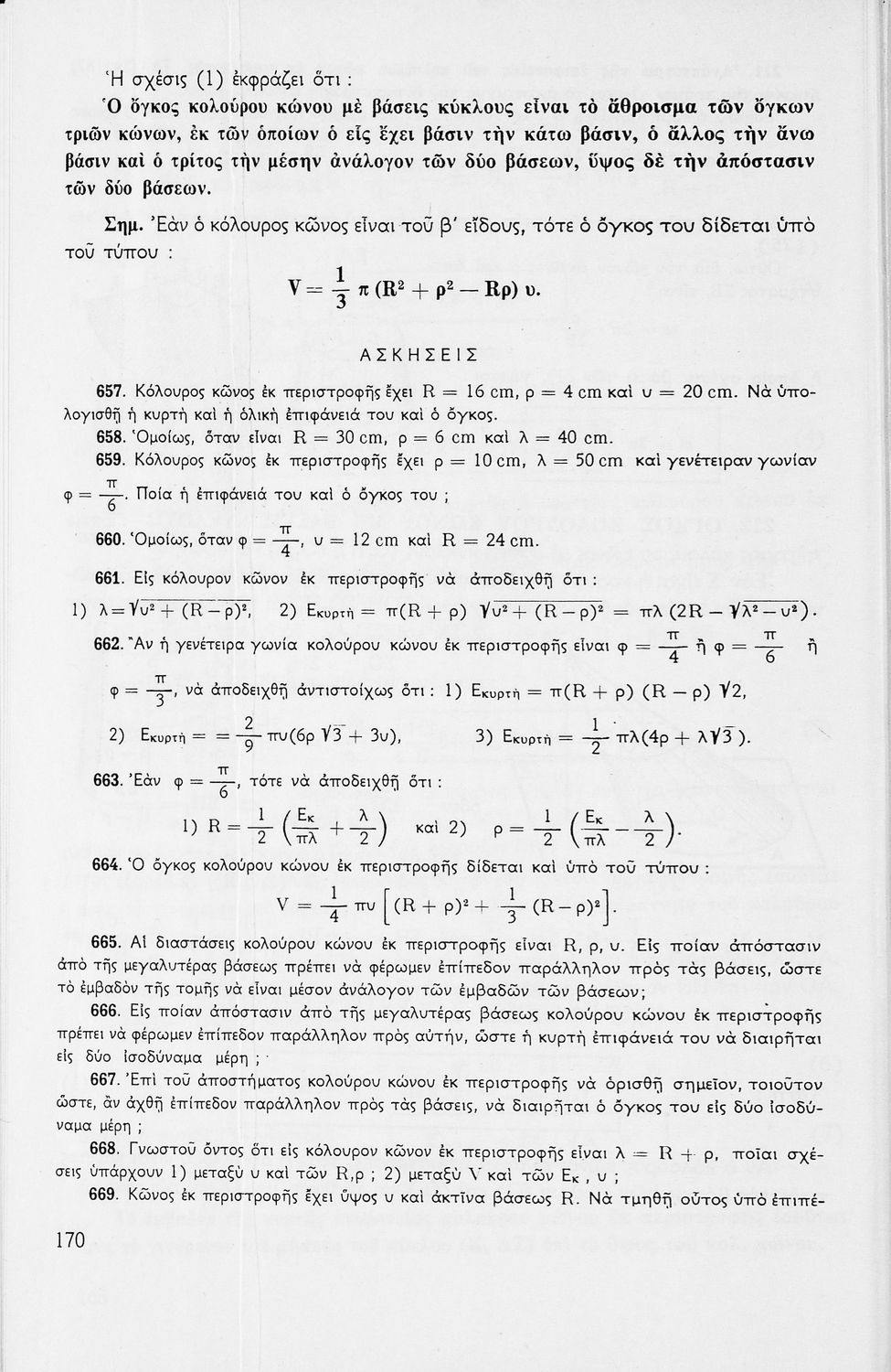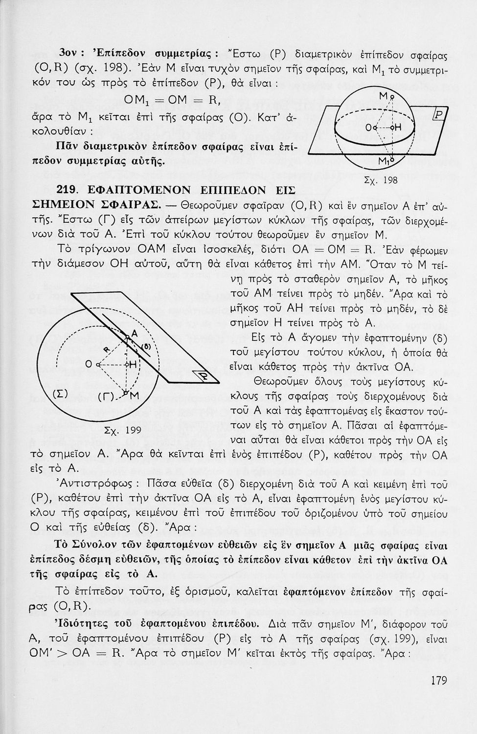 Σχολικό εγχειρίδιο Γεωμετρίας για τις Γ΄, Δ΄, Ε΄, ΣΤ΄ Γυμνασίου που περιλαμβάνει θεωρία και ασκήσεις και είναι χωρισμένο σε Επιπεδομετρία και Στερεομετρία. Φέρει το σύμβολο της δικτατορίας.