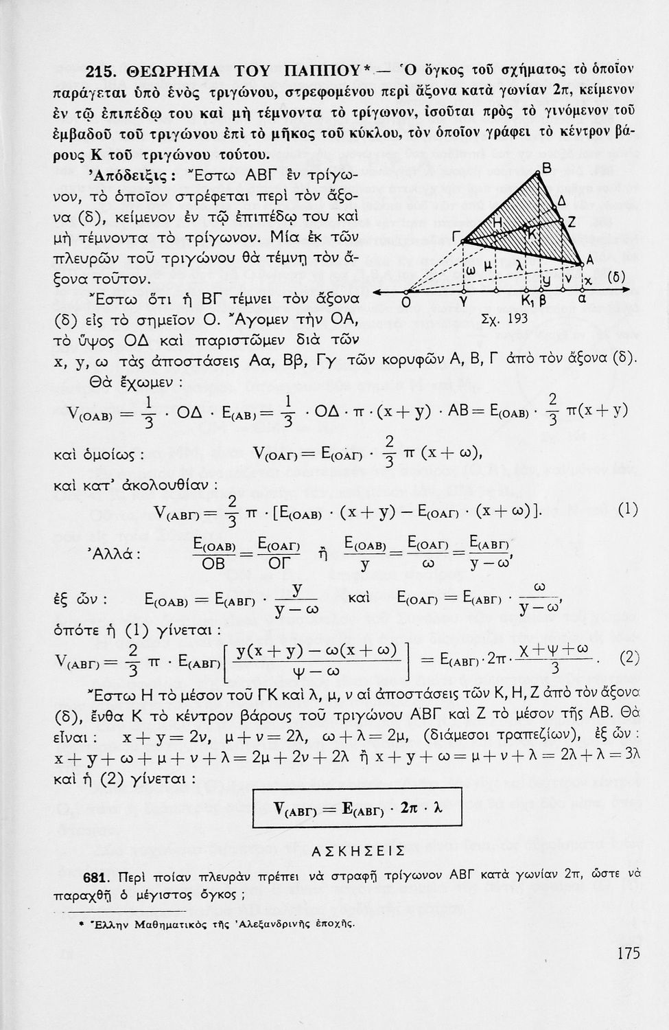 Σχολικό εγχειρίδιο Μαθηματικών για τις Δ΄, Ε΄ και ΣΤ΄ Γυμνασίου χωρισμένο σε θεωρήματα και ασκήσεις που εστιάζει στη Γεωμετρία. Φέρει το σύμβολο της δικτατορίας.