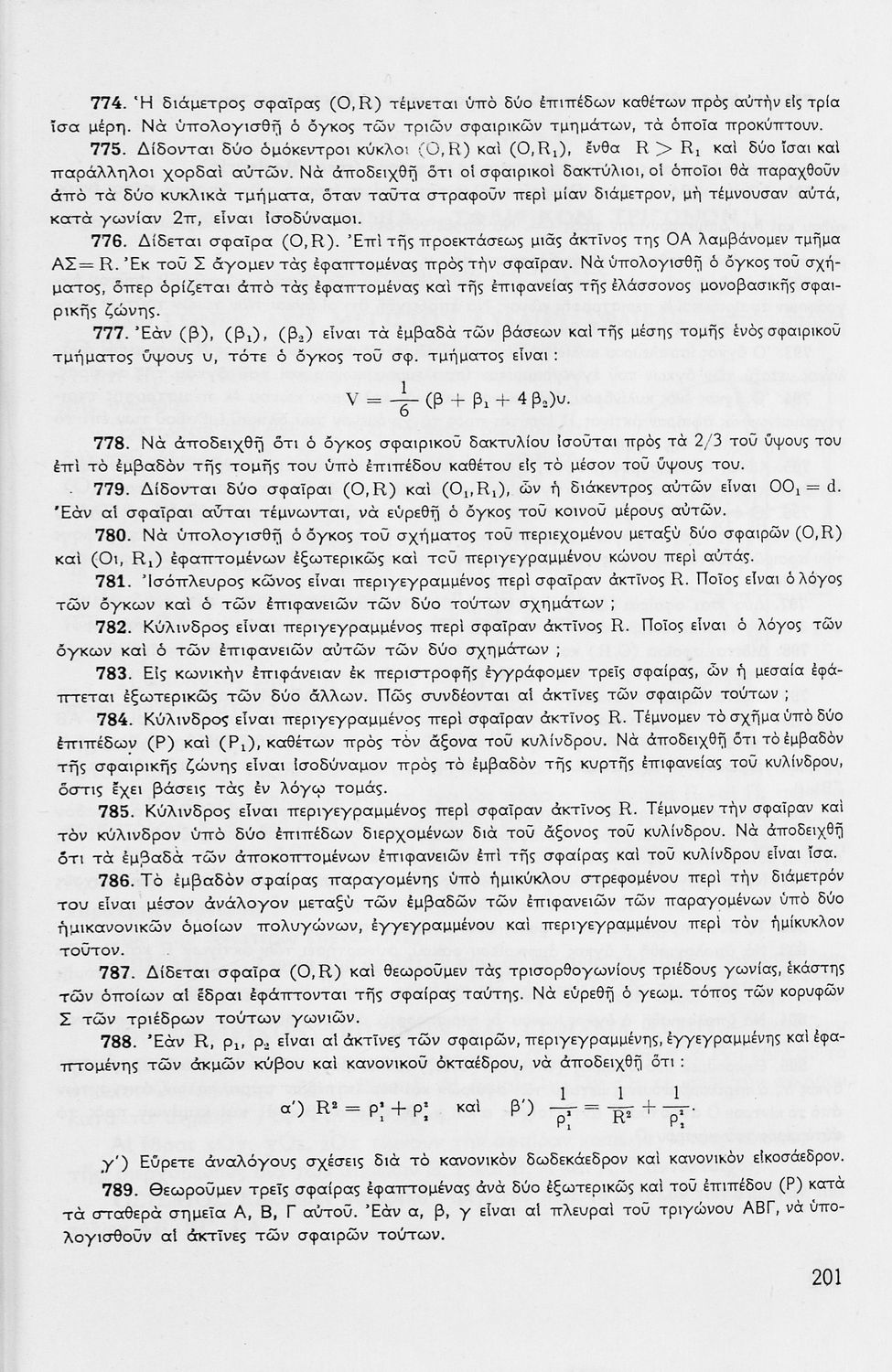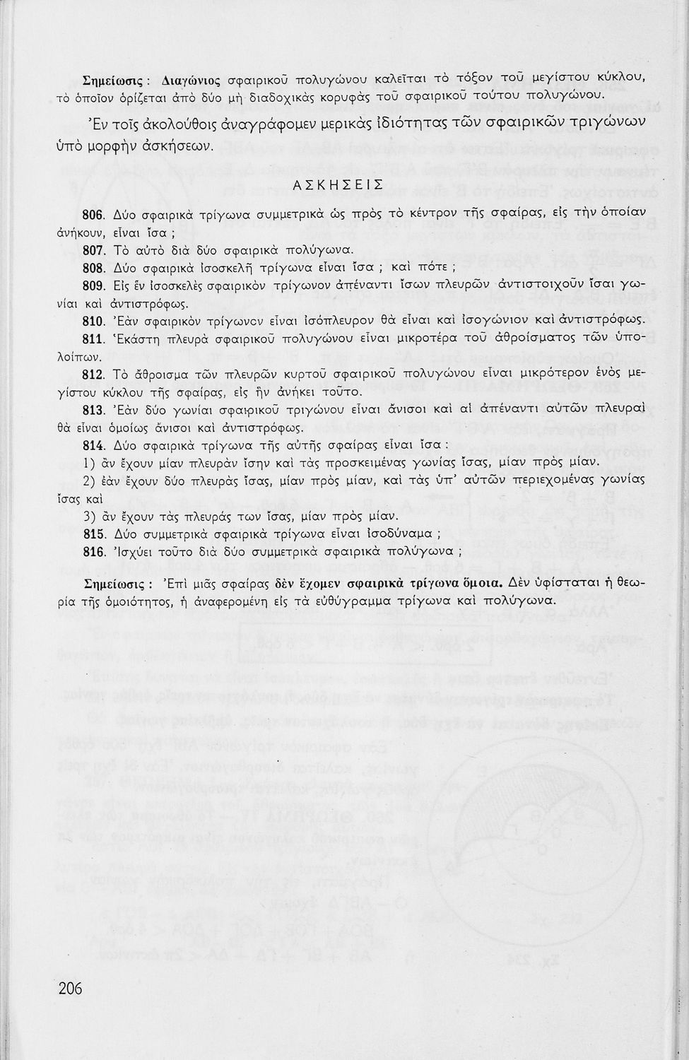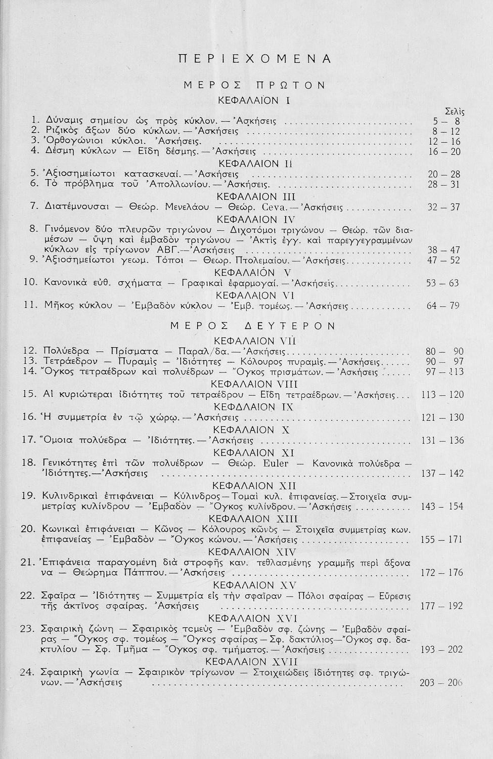 Σχολικό εγχειρίδιο Γεωμετρίας για τις Γ΄, Δ΄, Ε΄, ΣΤ΄ Γυμνασίου που περιλαμβάνει θεωρία και ασκήσεις και είναι χωρισμένο σε Επιπεδομετρία και Στερεομετρία. Φέρει το σύμβολο της δικτατορίας.
