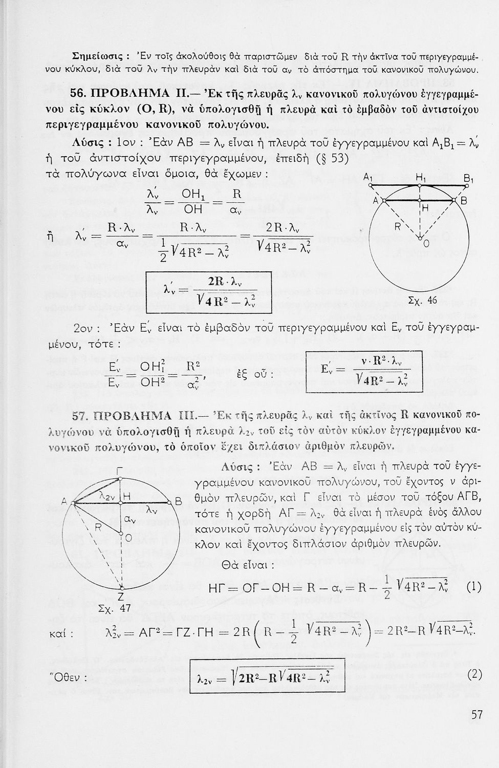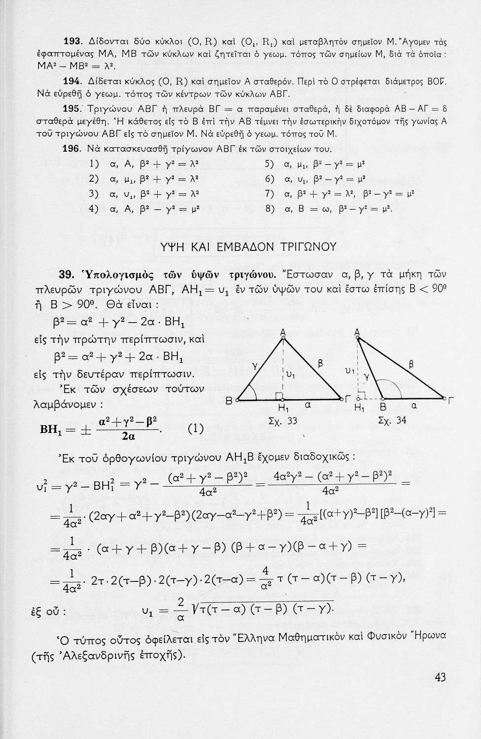 Σχολικό εγχειρίδιο Γεωμετρίας για τις Γ΄, Δ΄, Ε΄, ΣΤ΄ Γυμνασίου που περιλαμβάνει θεωρία και ασκήσεις και είναι χωρισμένο σε Επιπεδομετρία και Στερεομετρία. Φέρει το σύμβολο της δικτατορίας.
