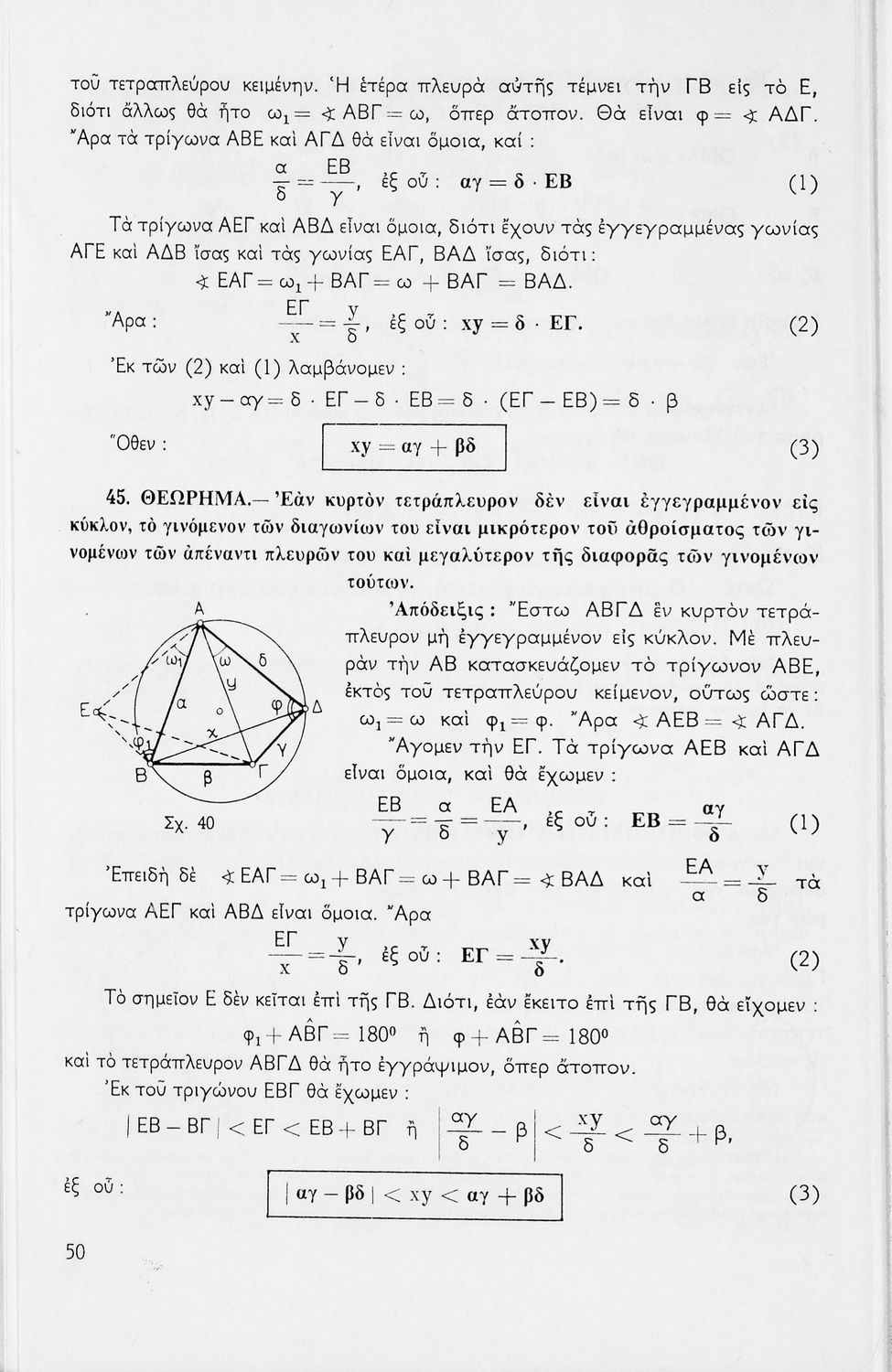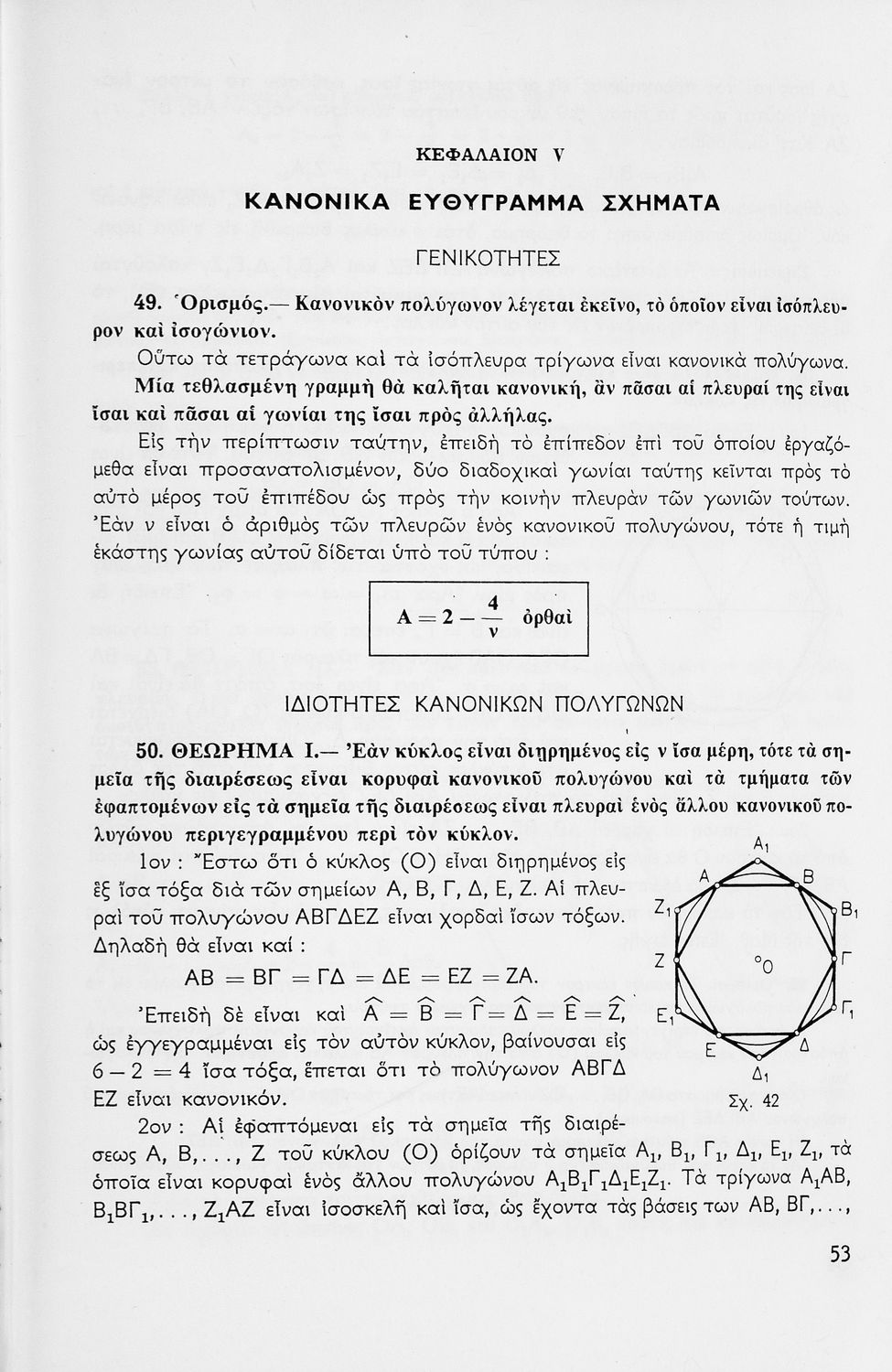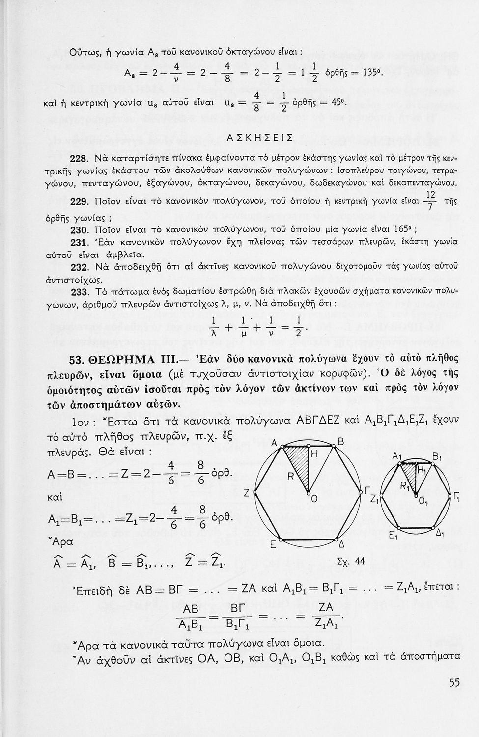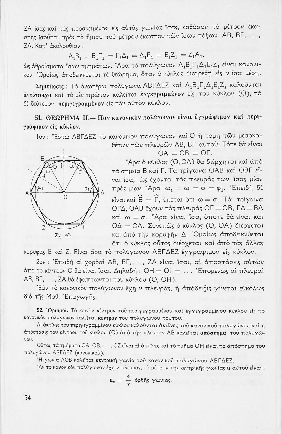 Σχολικό εγχειρίδιο Μαθηματικών για τις Δ΄, Ε΄ και ΣΤ΄ Γυμνασίου χωρισμένο σε θεωρήματα και ασκήσεις που εστιάζει στη Γεωμετρία. Φέρει το σύμβολο της δικτατορίας.