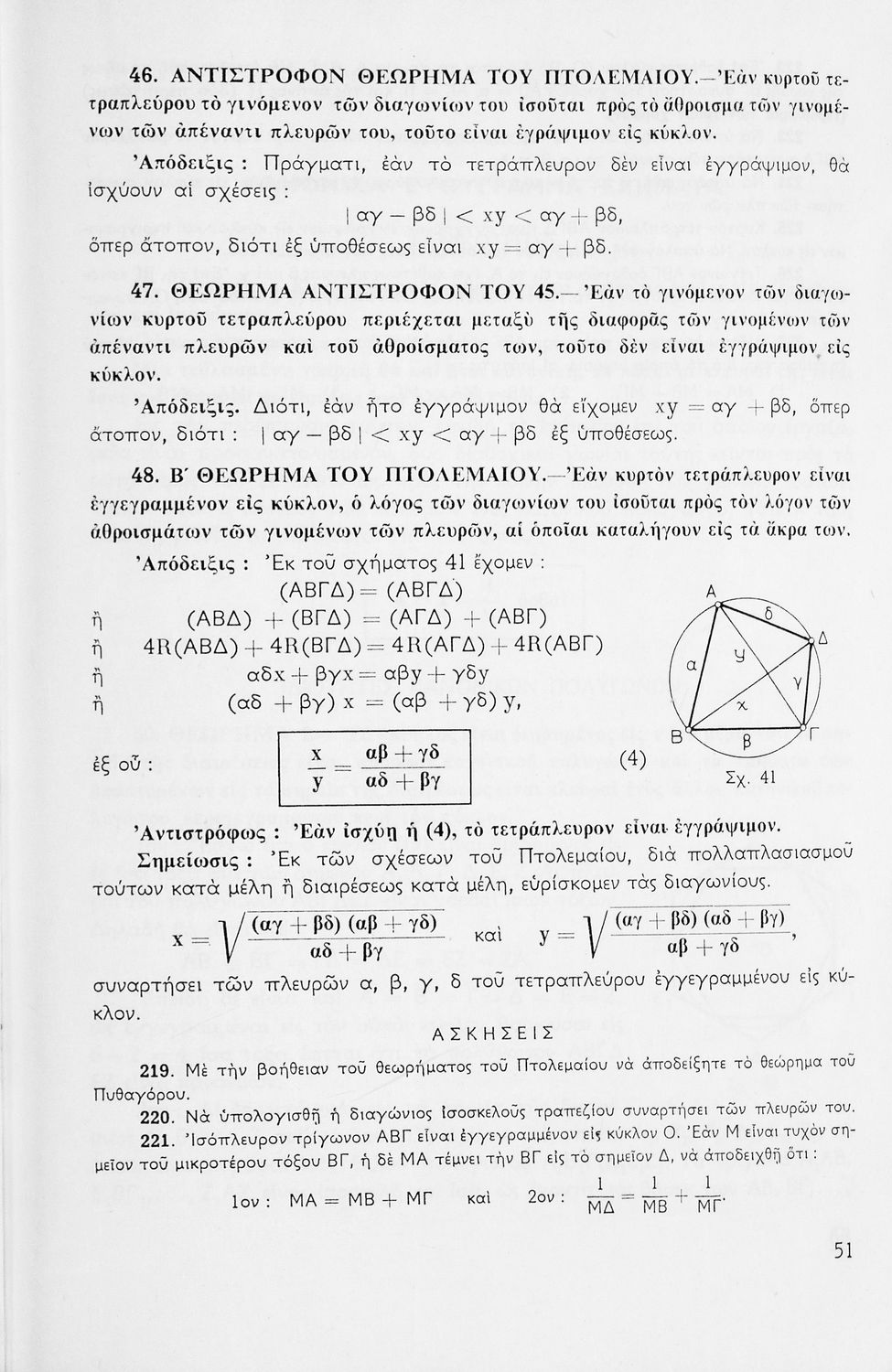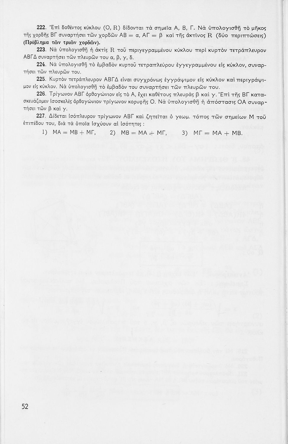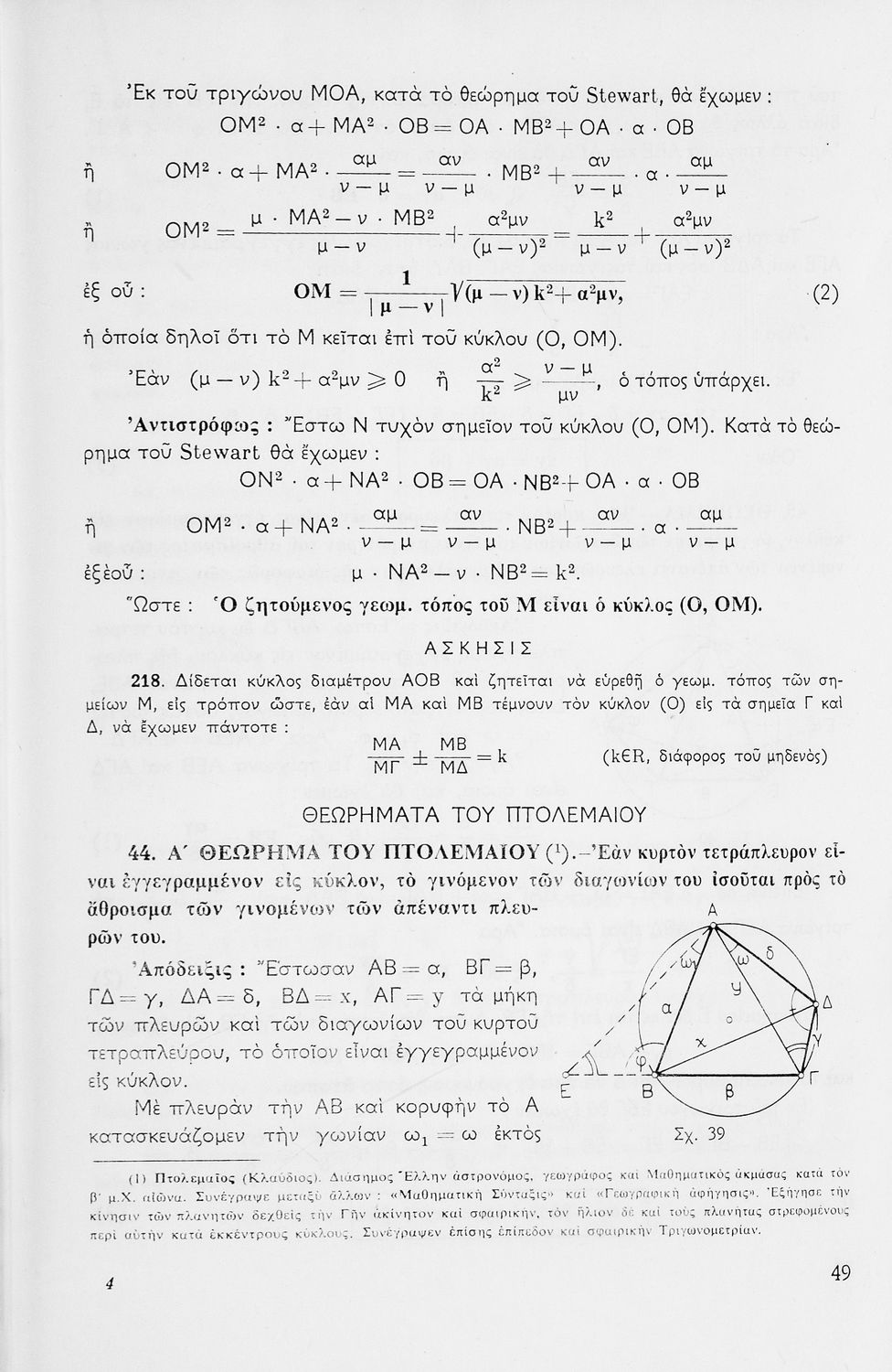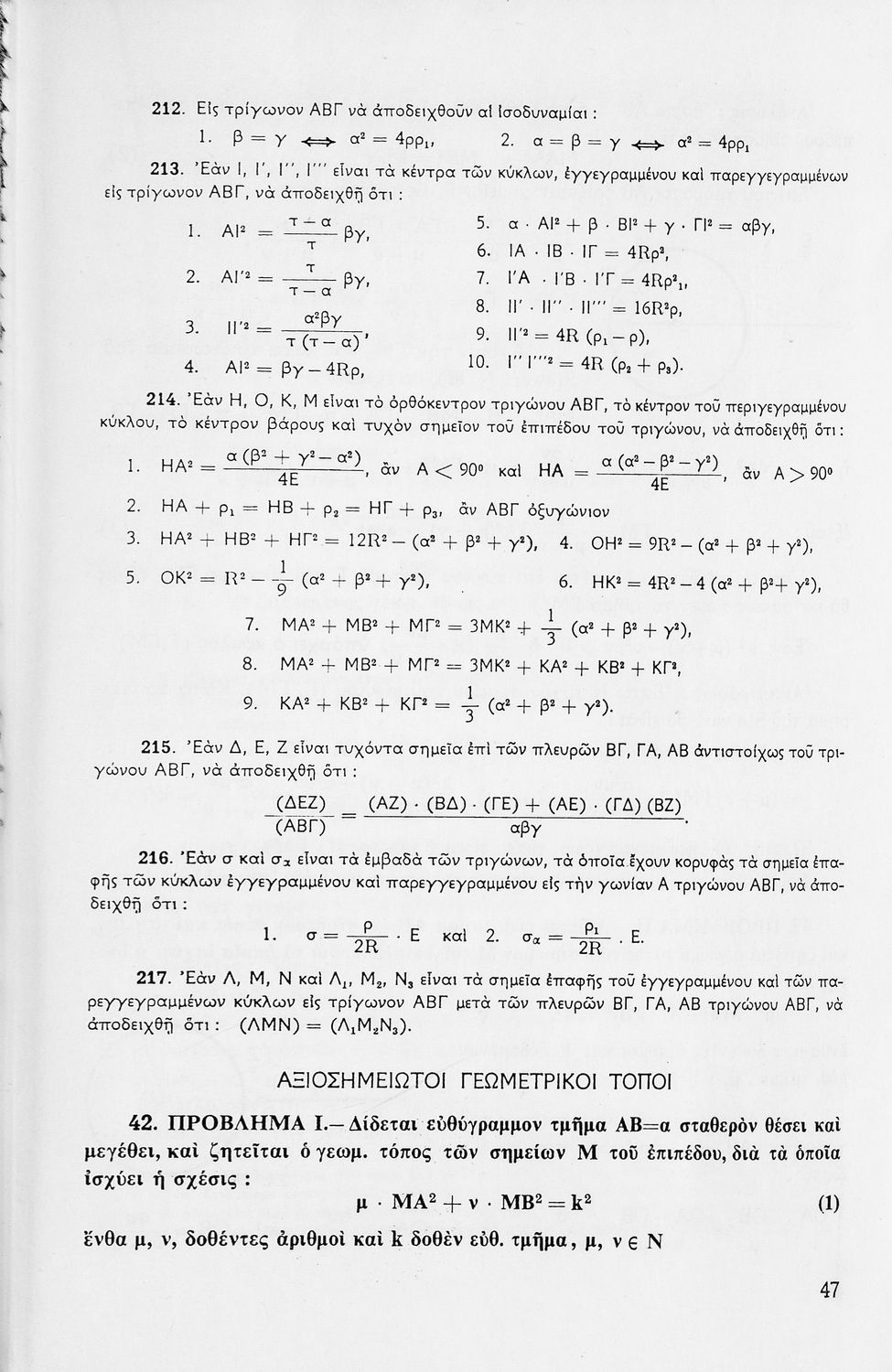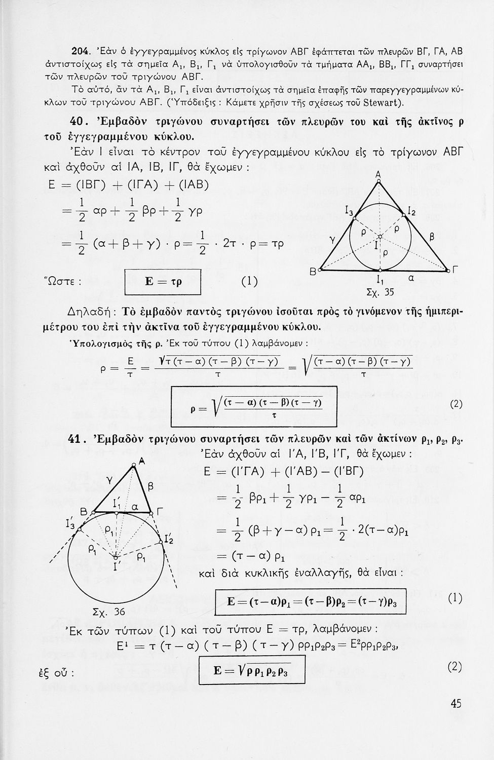 Σχολικό εγχειρίδιο Μαθηματικών για τις Δ΄, Ε΄ και ΣΤ΄ Γυμνασίου χωρισμένο σε θεωρήματα και ασκήσεις που εστιάζει στη Γεωμετρία. Φέρει το σύμβολο της δικτατορίας.