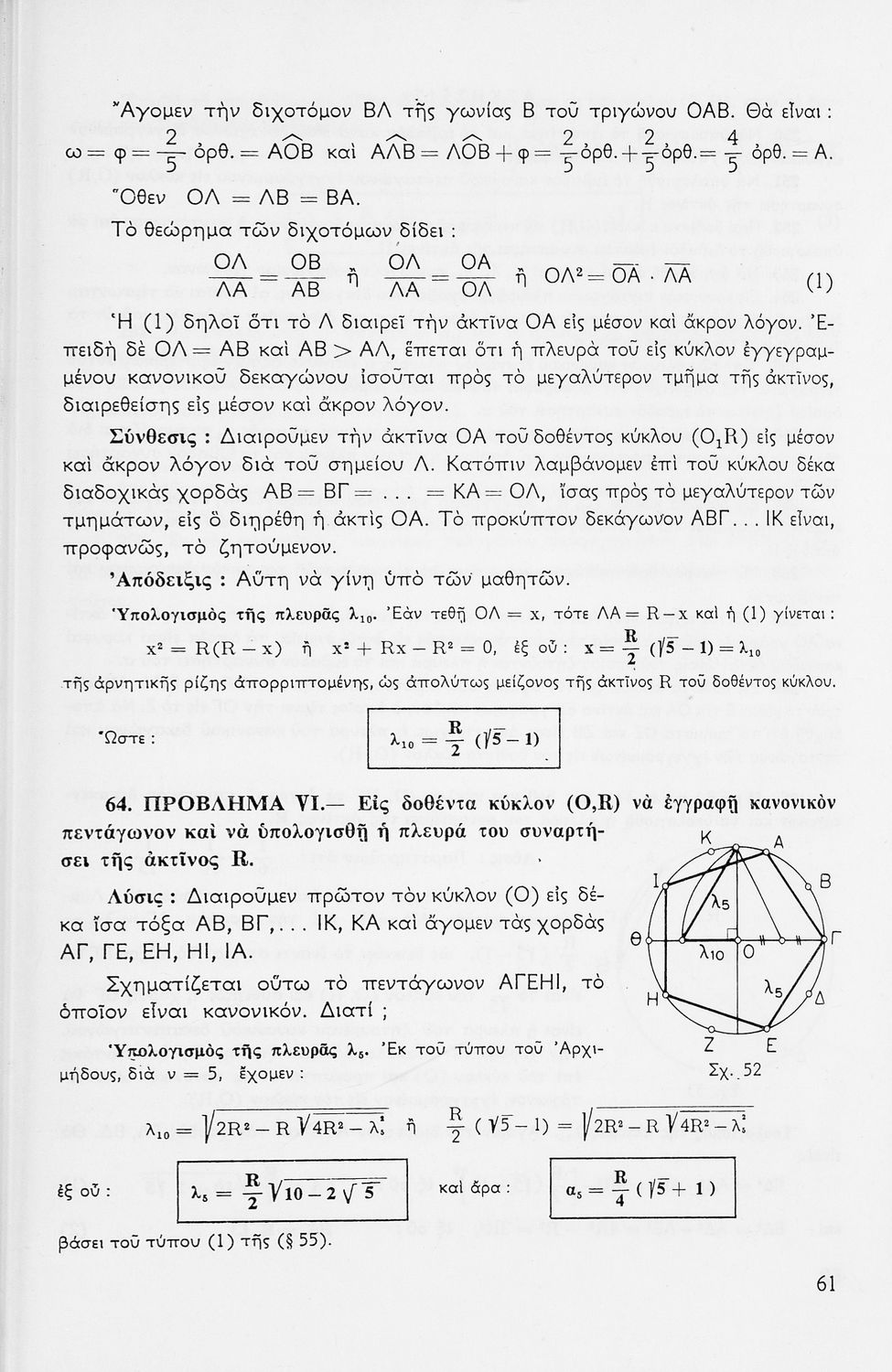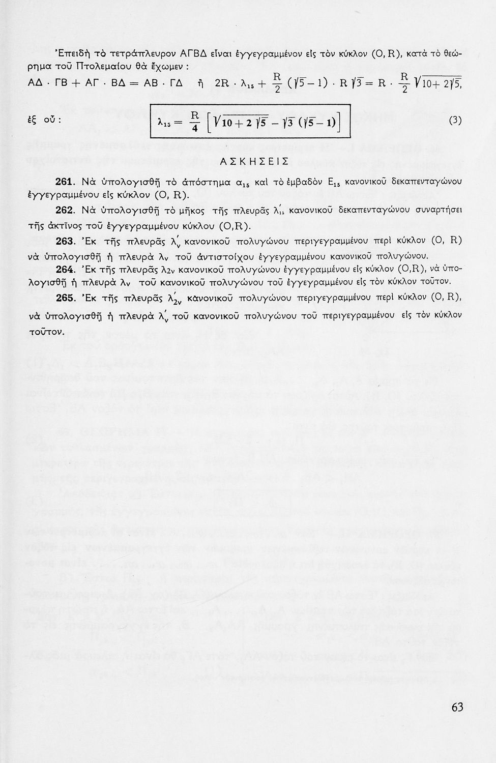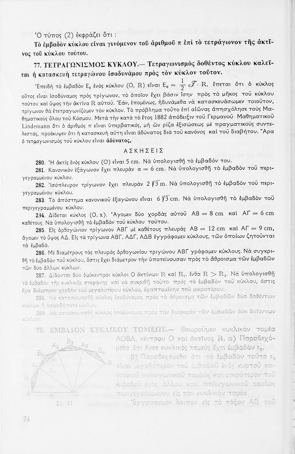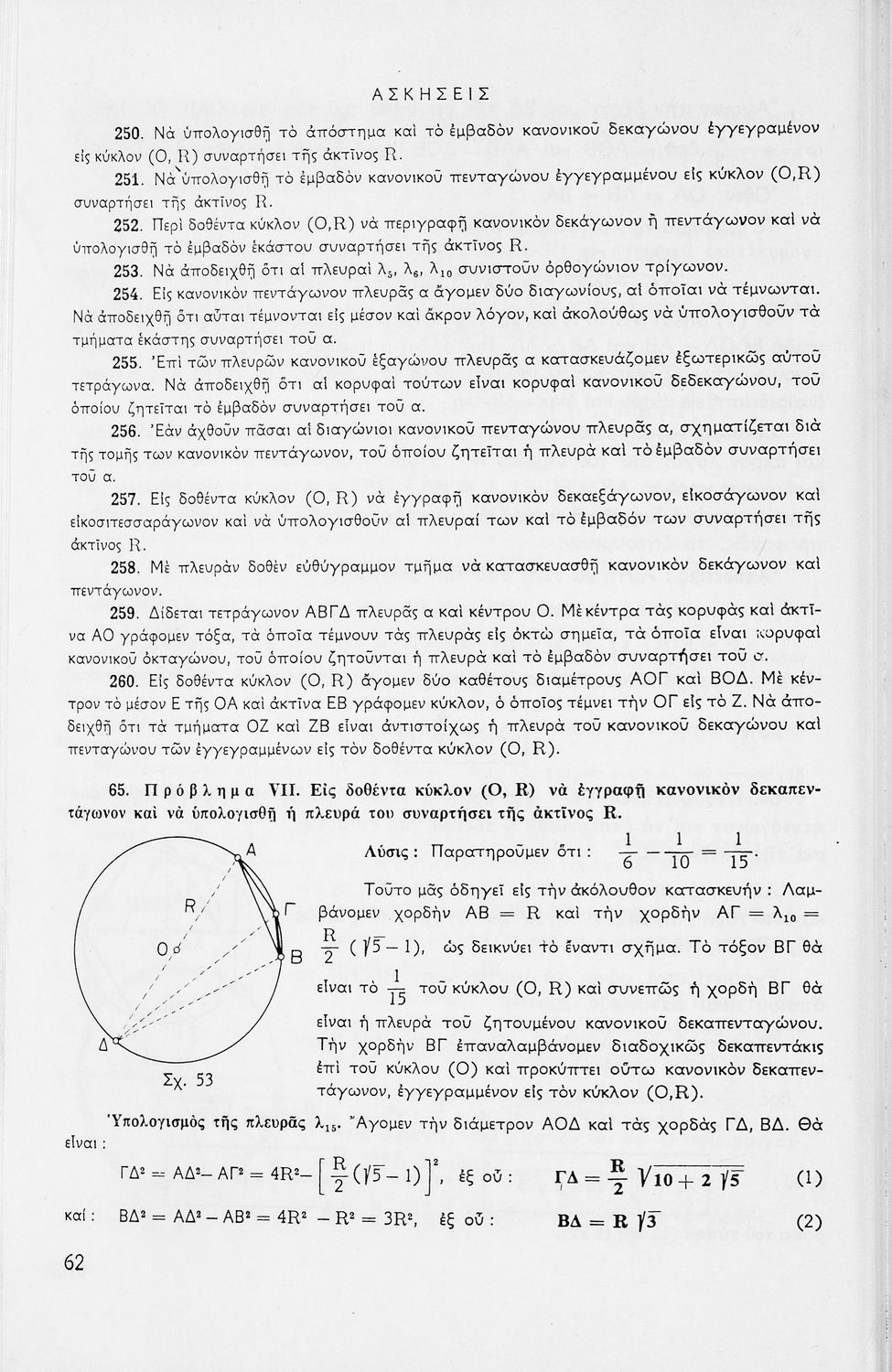 Σχολικό εγχειρίδιο Μαθηματικών για τις Δ΄, Ε΄ και ΣΤ΄ Γυμνασίου χωρισμένο σε θεωρήματα και ασκήσεις που εστιάζει στη Γεωμετρία. Φέρει το σύμβολο της δικτατορίας.
