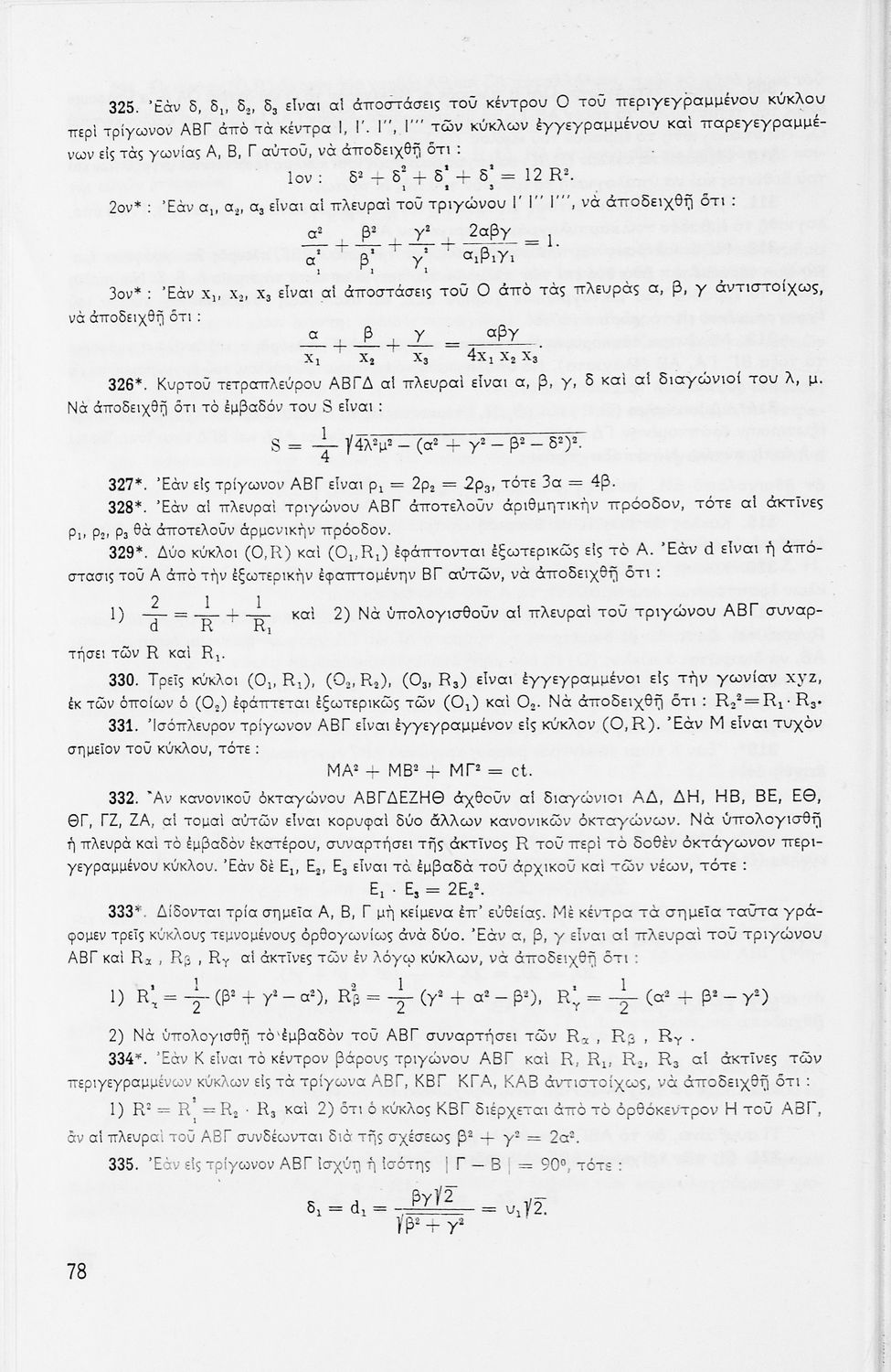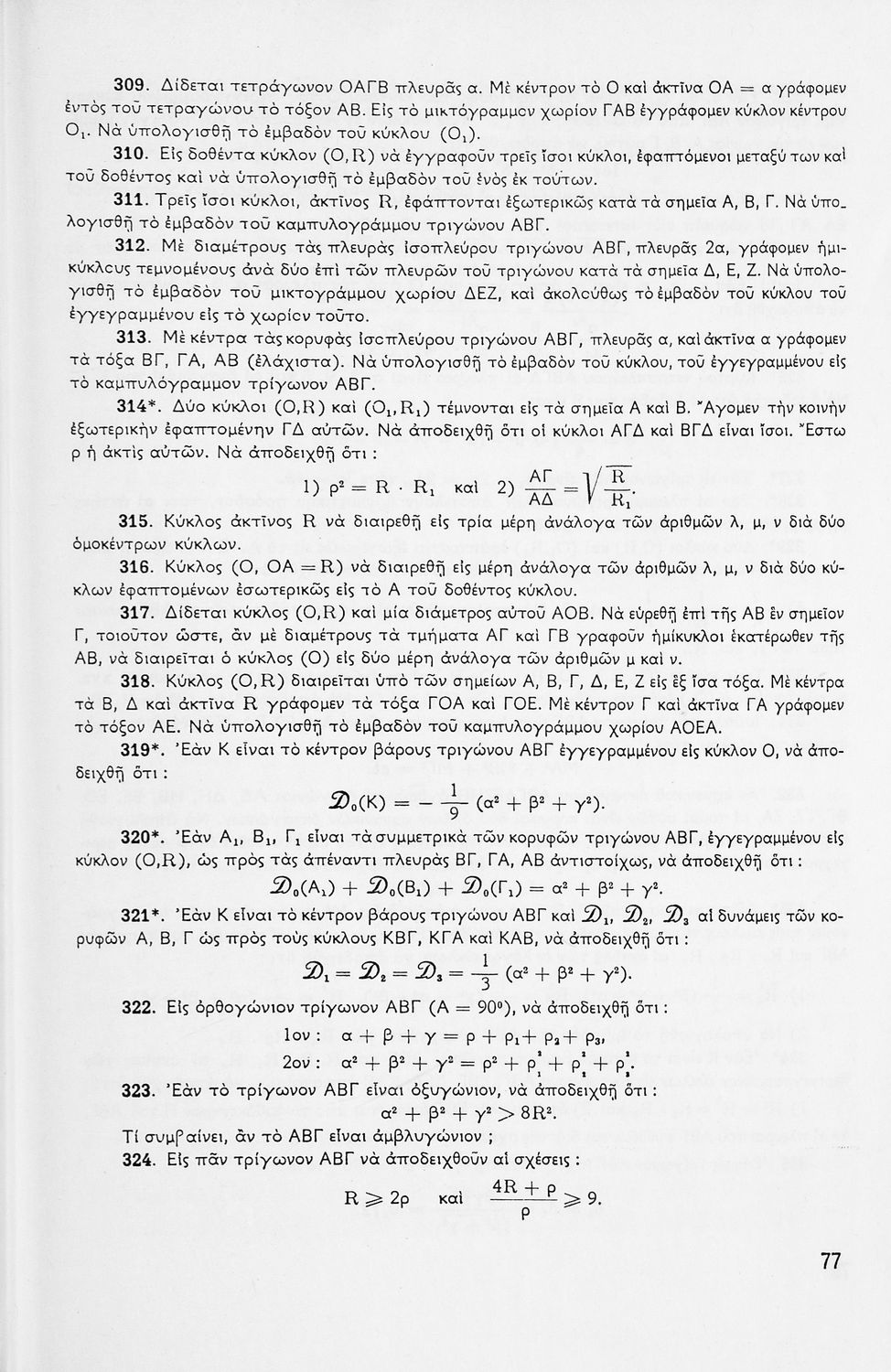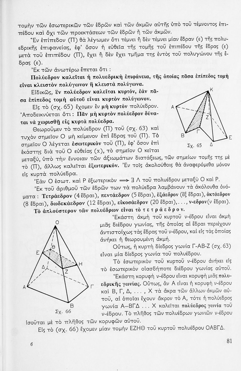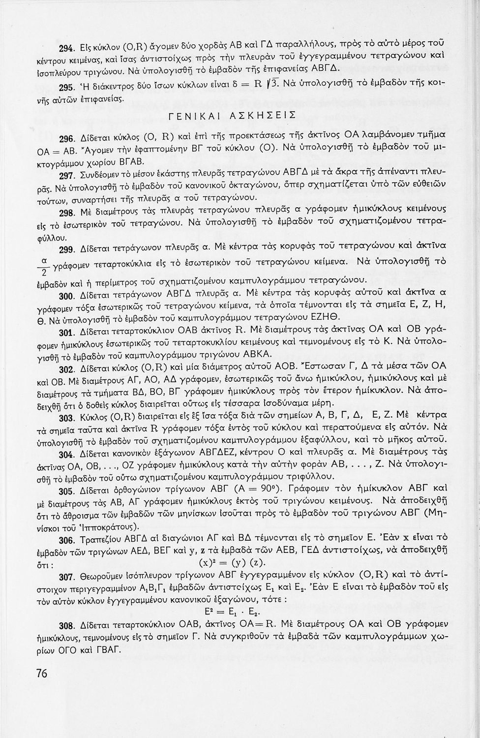 Σχολικό εγχειρίδιο Γεωμετρίας για τις Γ΄, Δ΄, Ε΄, ΣΤ΄ Γυμνασίου που περιλαμβάνει θεωρία και ασκήσεις και είναι χωρισμένο σε Επιπεδομετρία και Στερεομετρία.