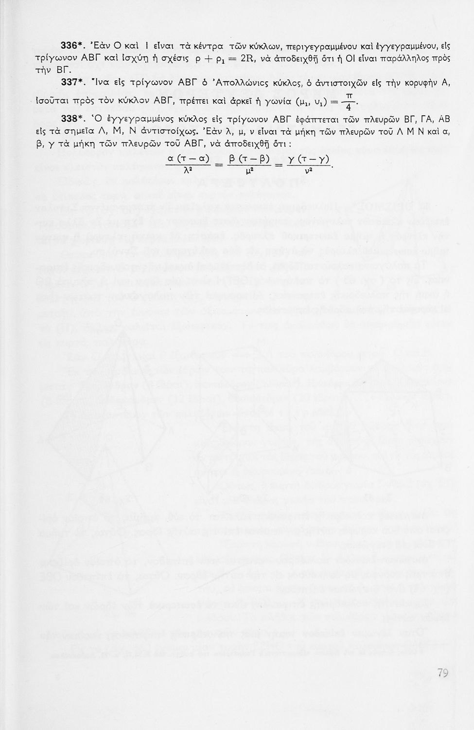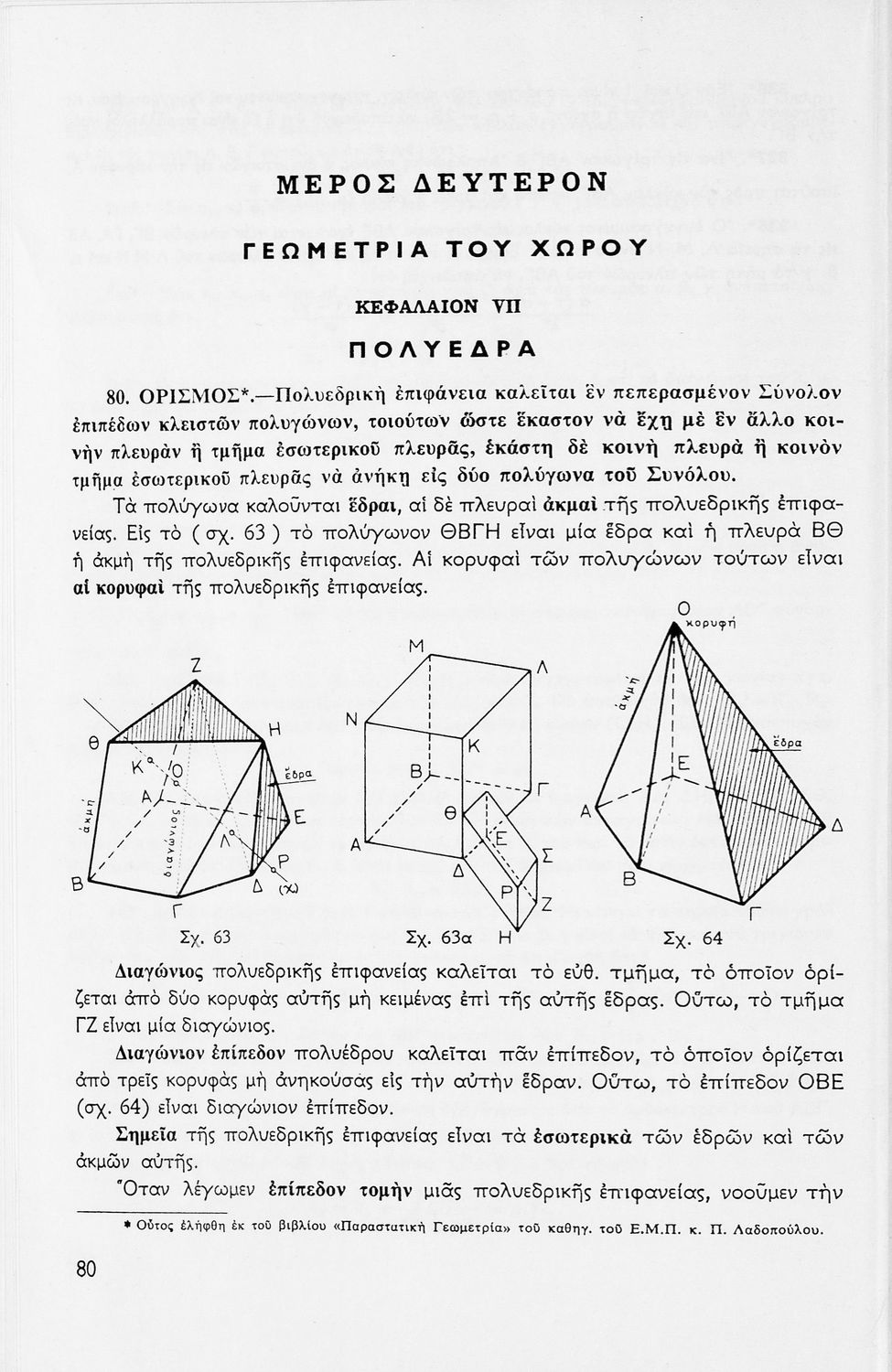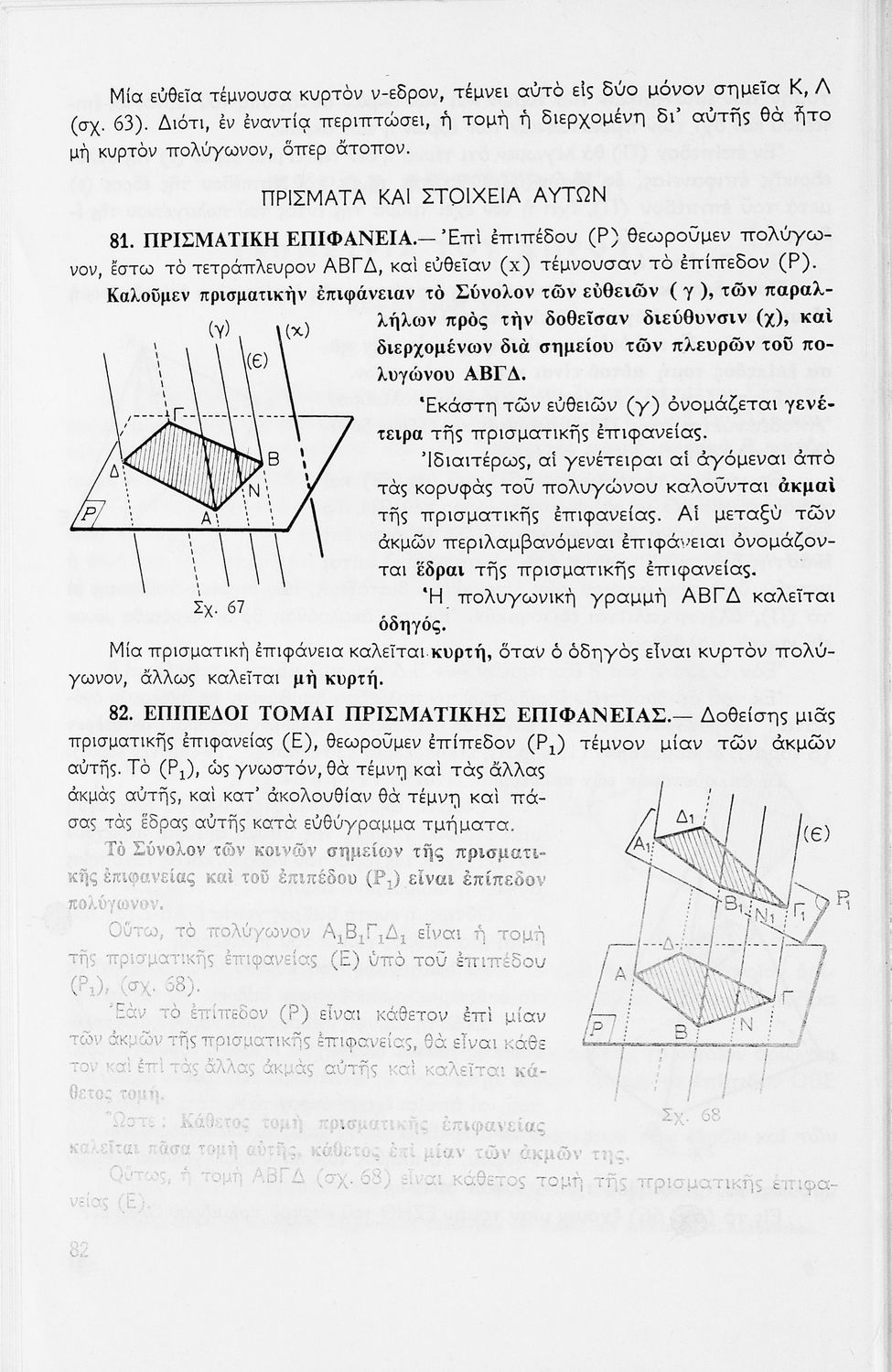 Σχολικό εγχειρίδιο Γεωμετρίας για τις Γ΄, Δ΄, Ε΄, ΣΤ΄ Γυμνασίου που περιλαμβάνει θεωρία και ασκήσεις και είναι χωρισμένο σε Επιπεδομετρία και Στερεομετρία. Φέρει το σύμβολο της δικτατορίας.