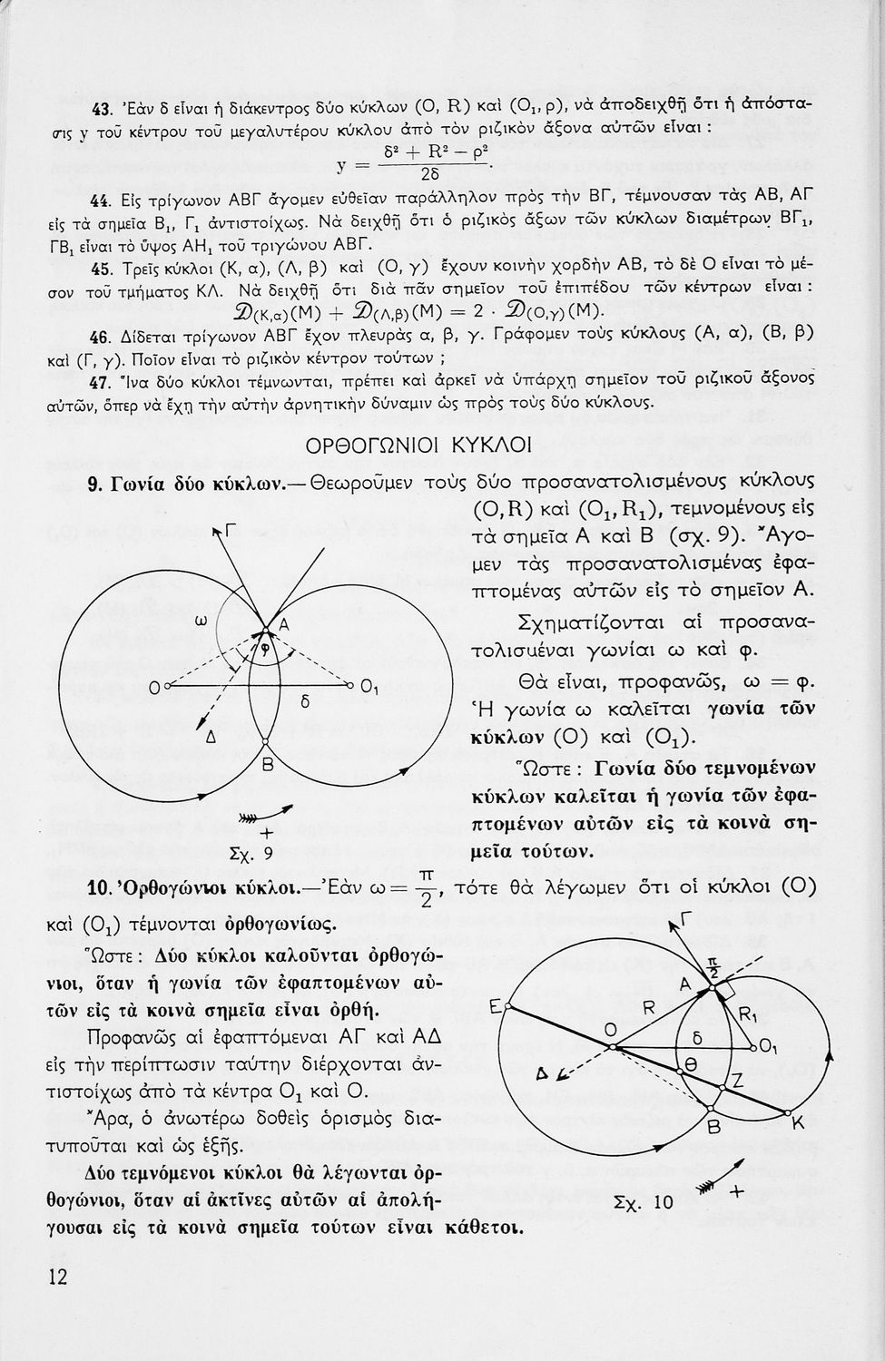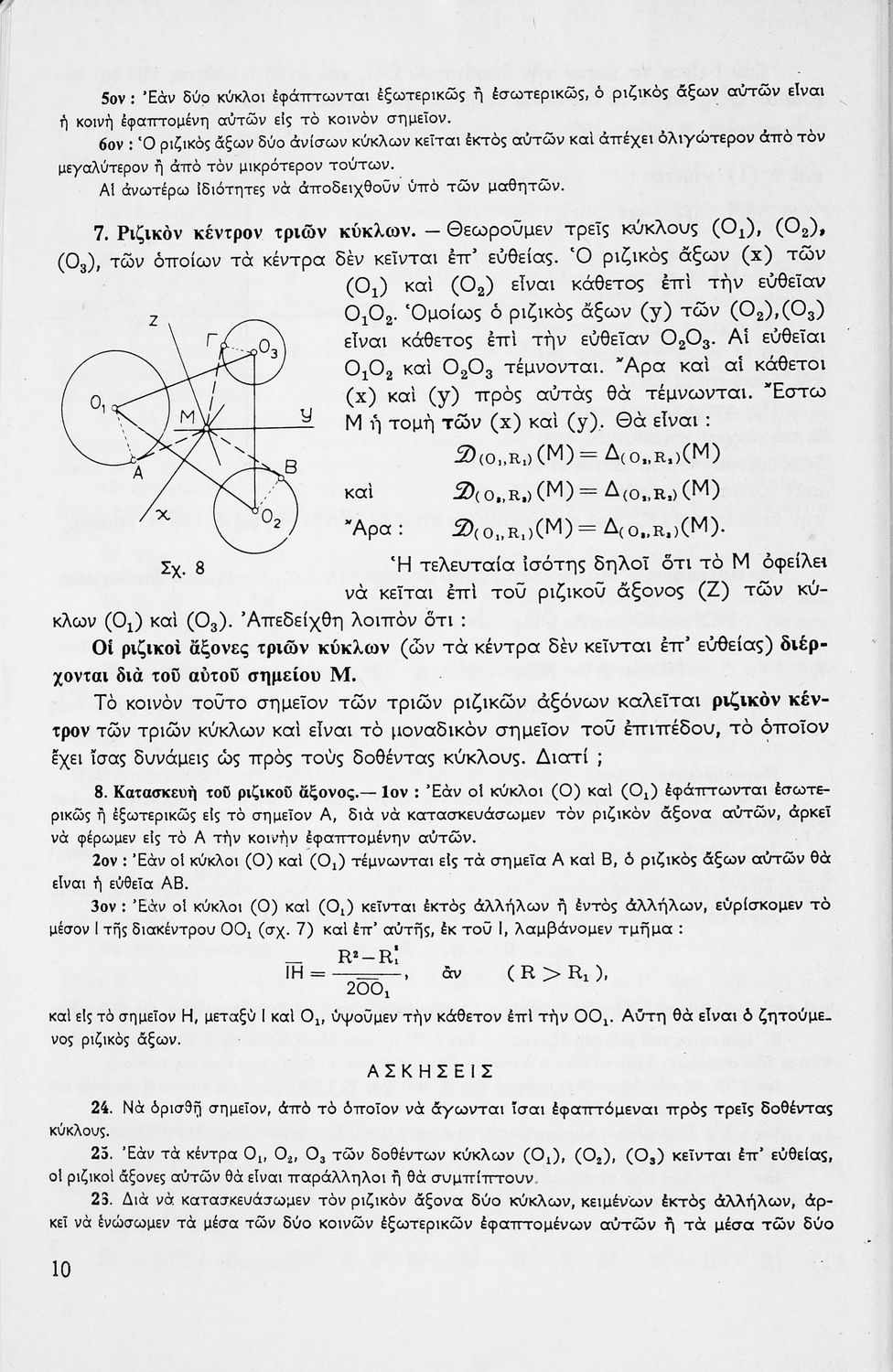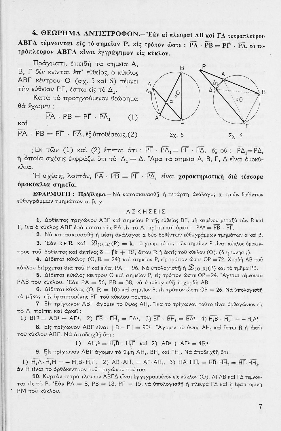 Σχολικό εγχειρίδιο Μαθηματικών για τις Δ΄, Ε΄ και ΣΤ΄ Γυμνασίου χωρισμένο σε θεωρήματα και ασκήσεις που εστιάζει στη Γεωμετρία. Φέρει το σύμβολο της δικτατορίας.