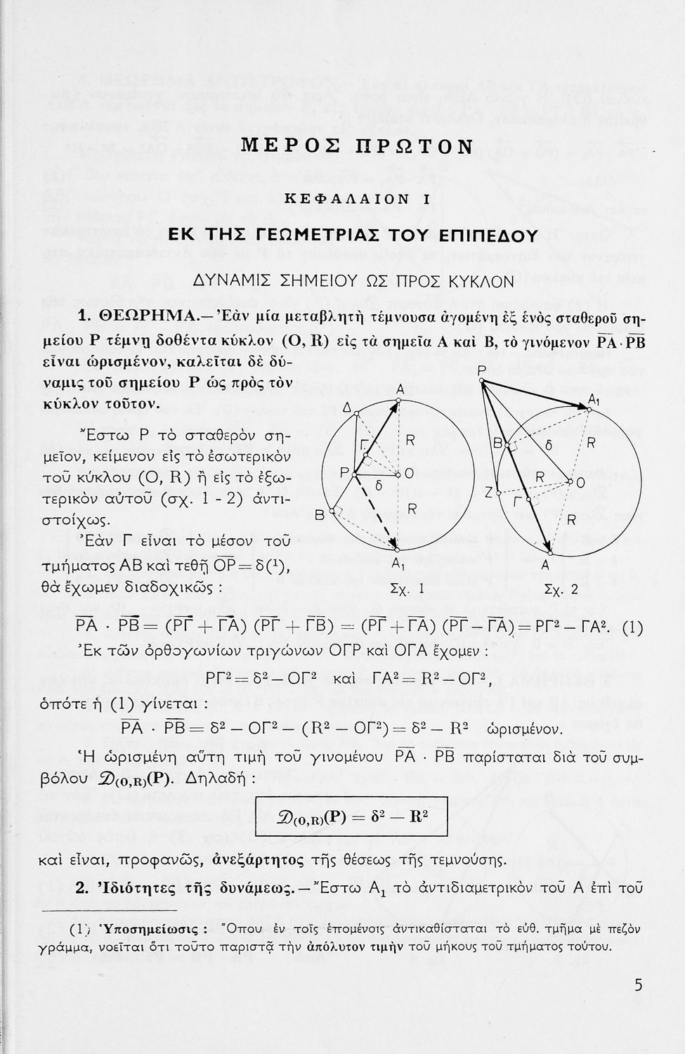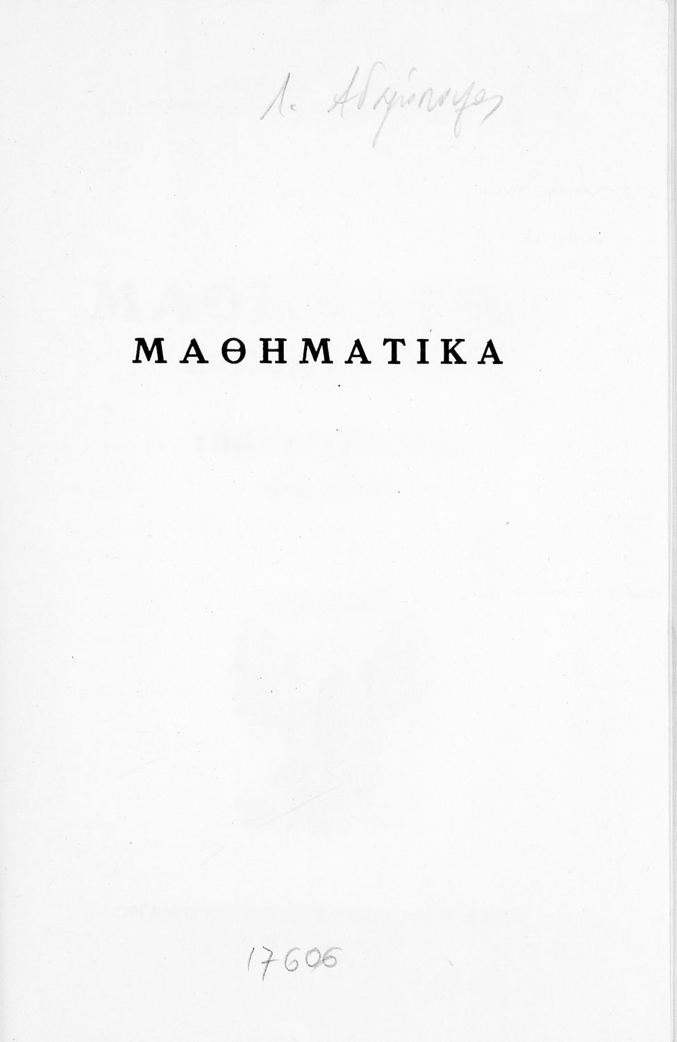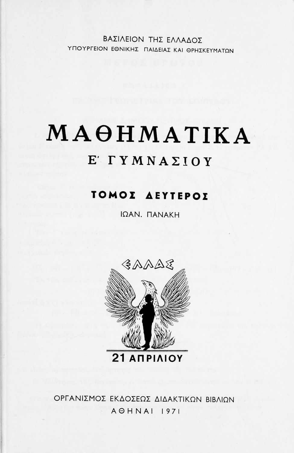 Σχολικό εγχειρίδιο Μαθηματικών Δ΄ και Ε΄ Γυμνασίου που είναι χωρισμένο σε θεωρήματα και ασκήσεις και εστιάζει στη Γεωμετρία. Φέρει το σύμβολο της δικτατορίας.