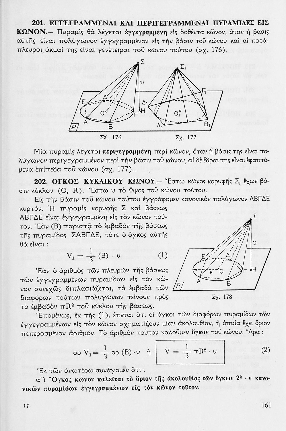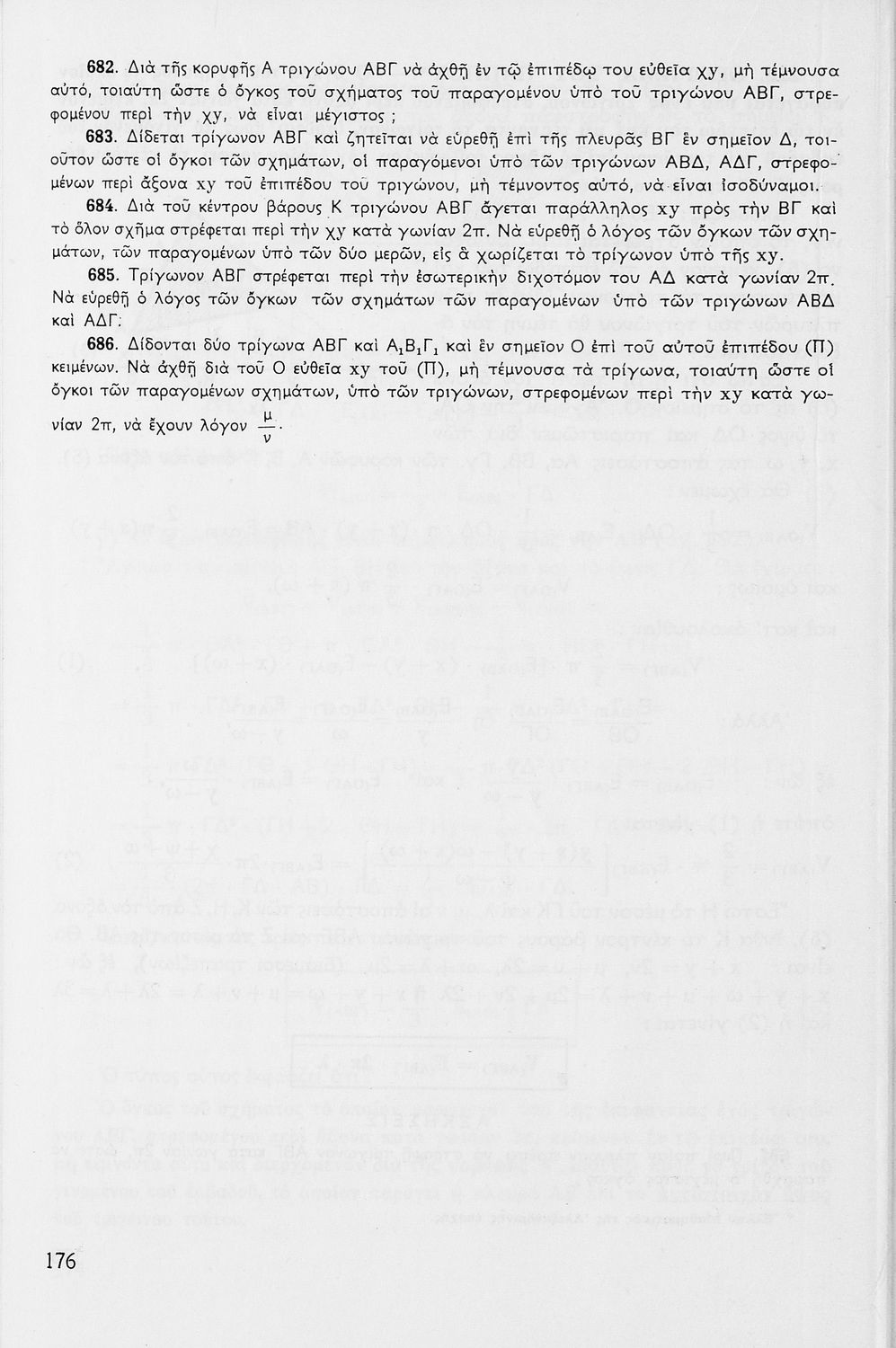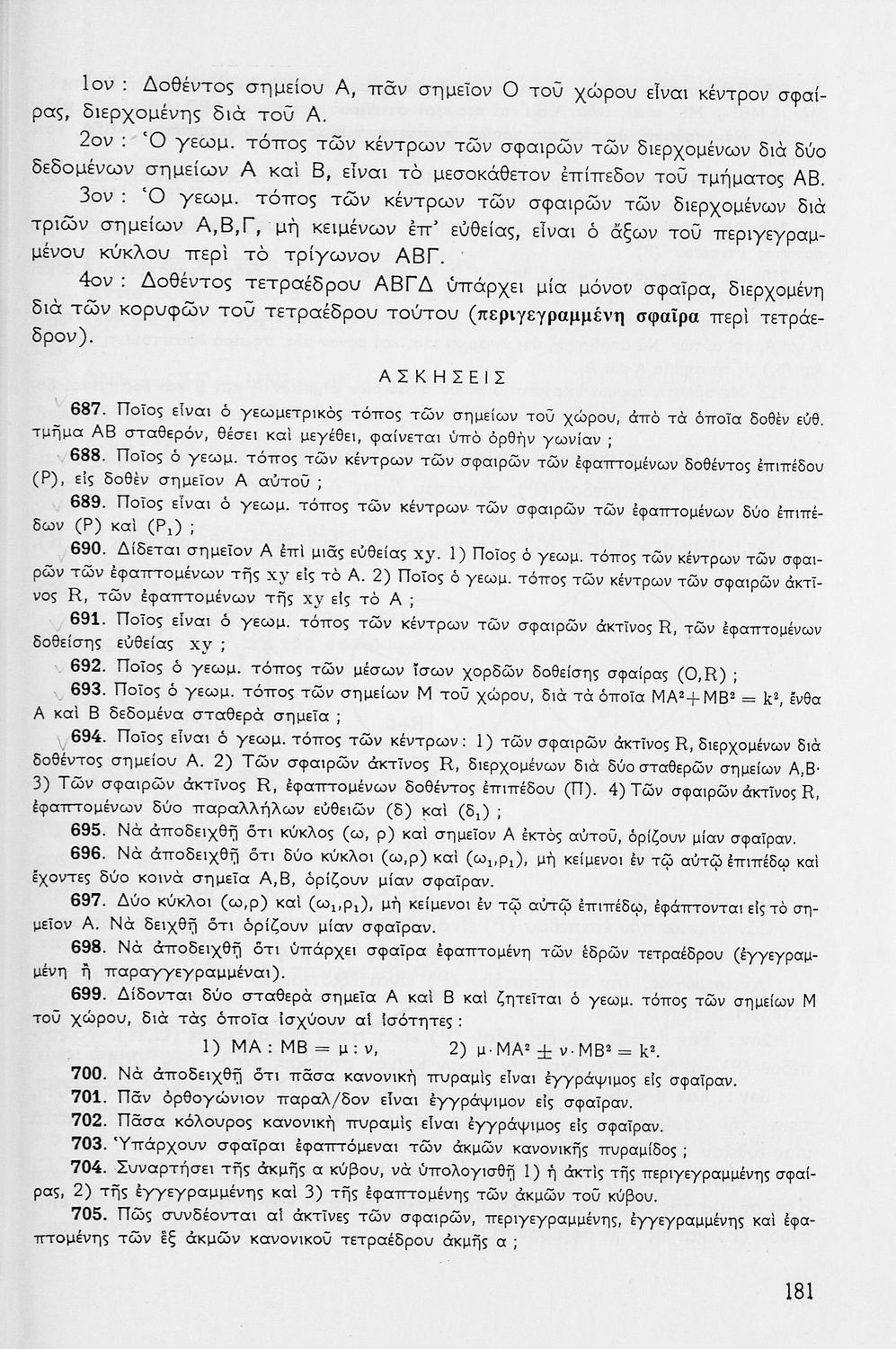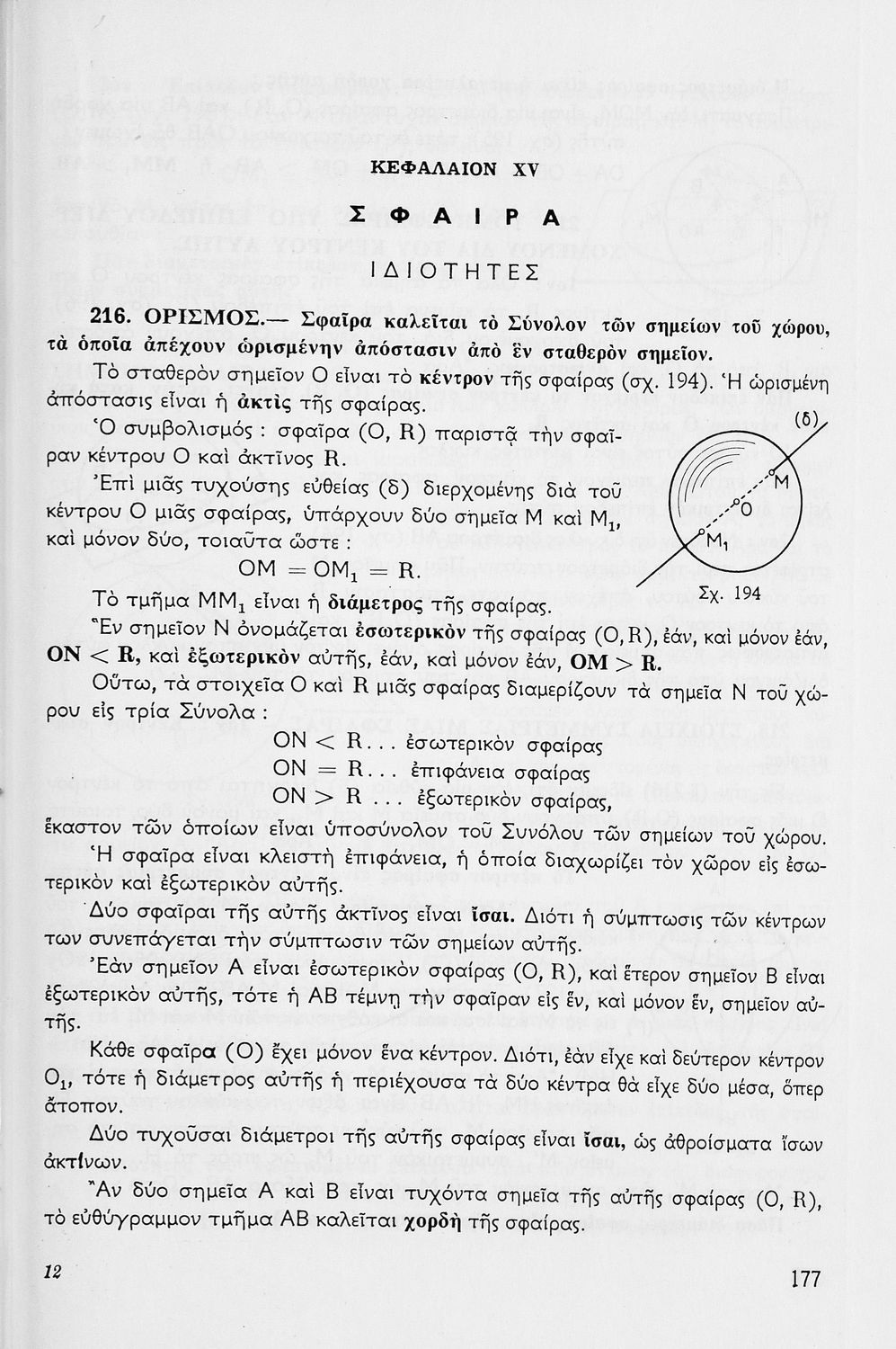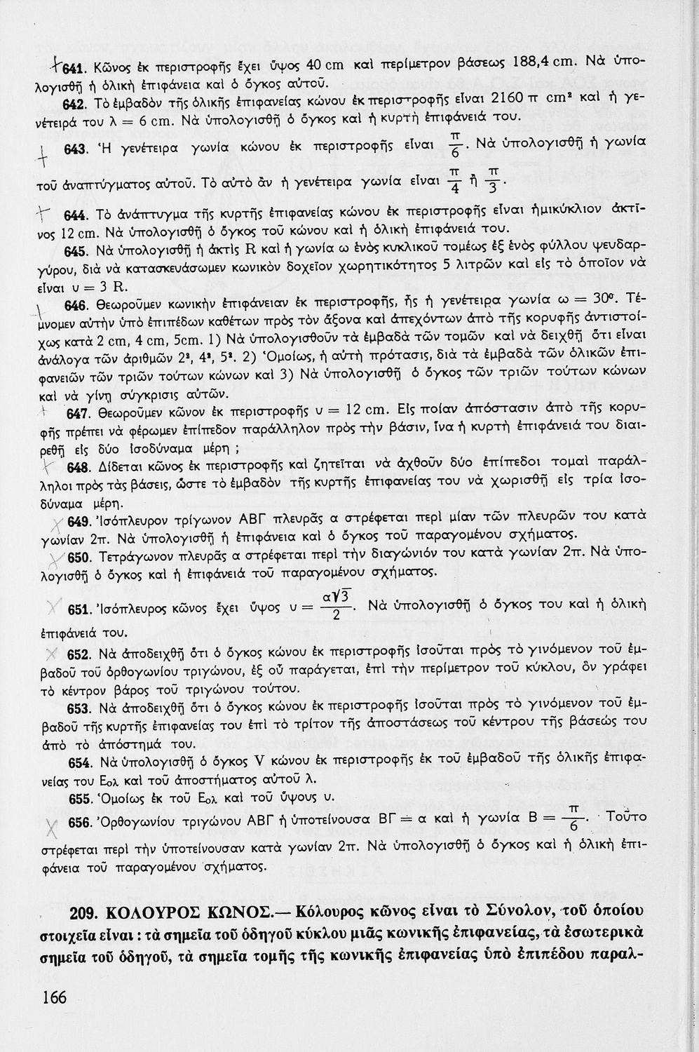 Σχολικό εγχειρίδιο Γεωμετρίας για τις Γ΄, Δ΄, Ε΄, ΣΤ΄ Γυμνασίου που περιλαμβάνει θεωρία και ασκήσεις και είναι χωρισμένο σε Επιπεδομετρία και Στερεομετρία. Φέρει το σύμβολο της δικτατορίας.