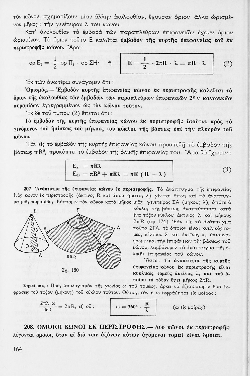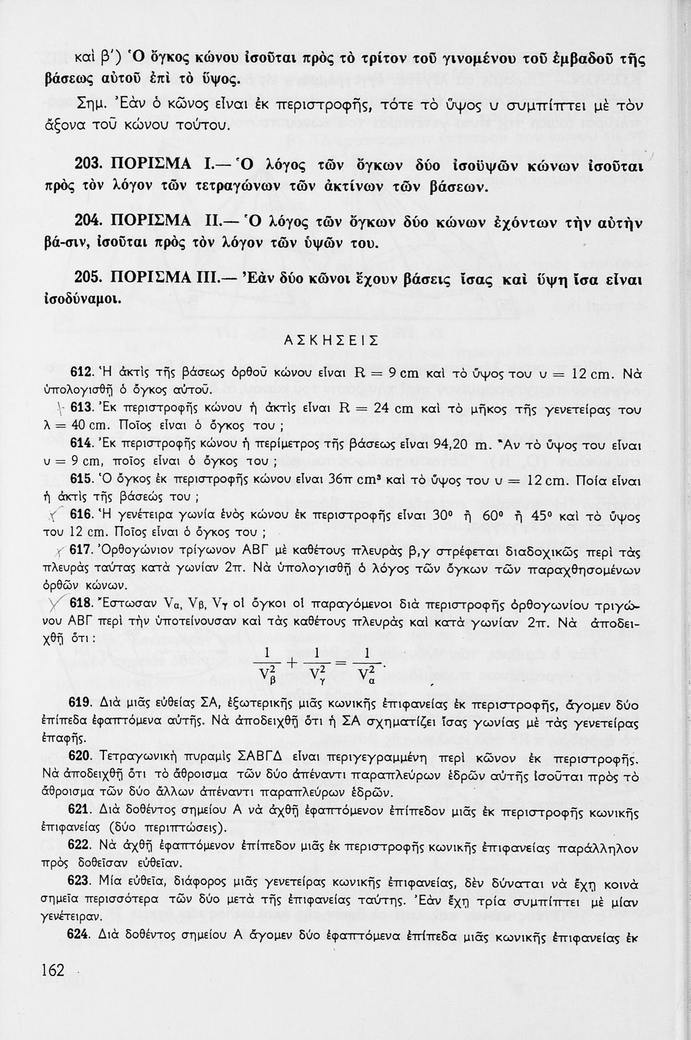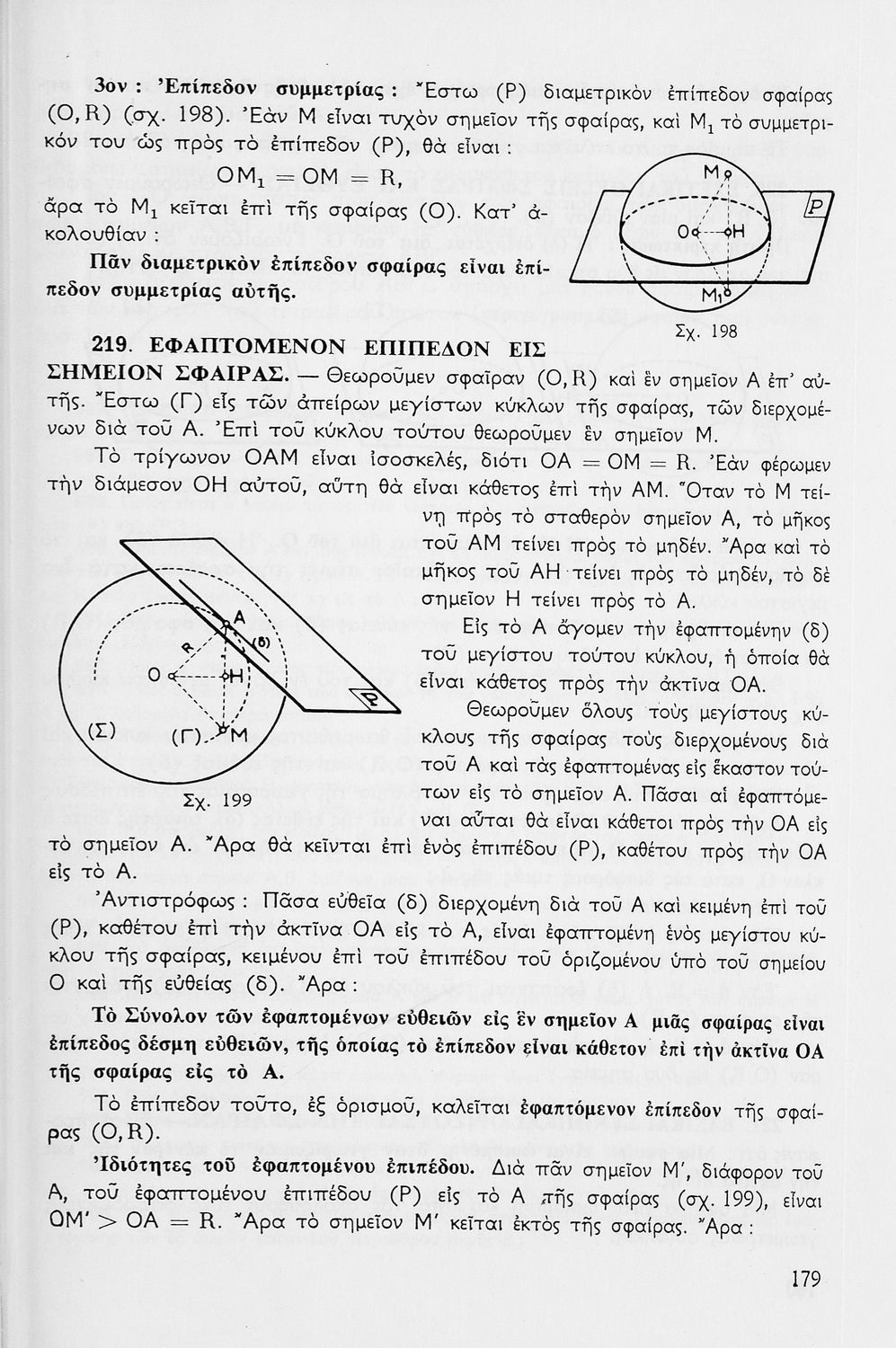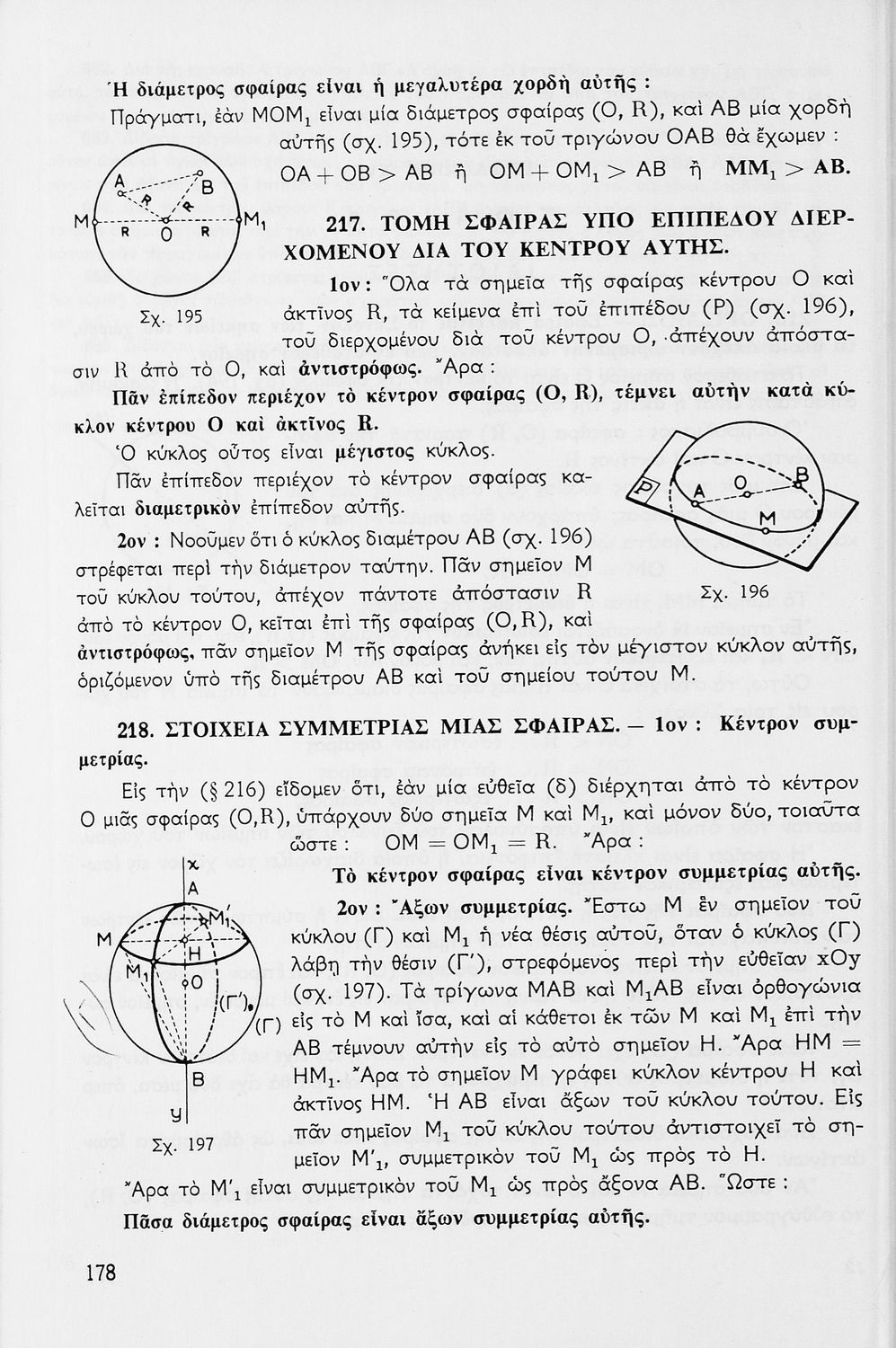 Σχολικό εγχειρίδιο Γεωμετρίας για τις Γ΄, Δ΄, Ε΄, ΣΤ΄ Γυμνασίου που περιλαμβάνει θεωρία και ασκήσεις και είναι χωρισμένο σε Επιπεδομετρία και Στερεομετρία. Φέρει το σύμβολο της δικτατορίας.