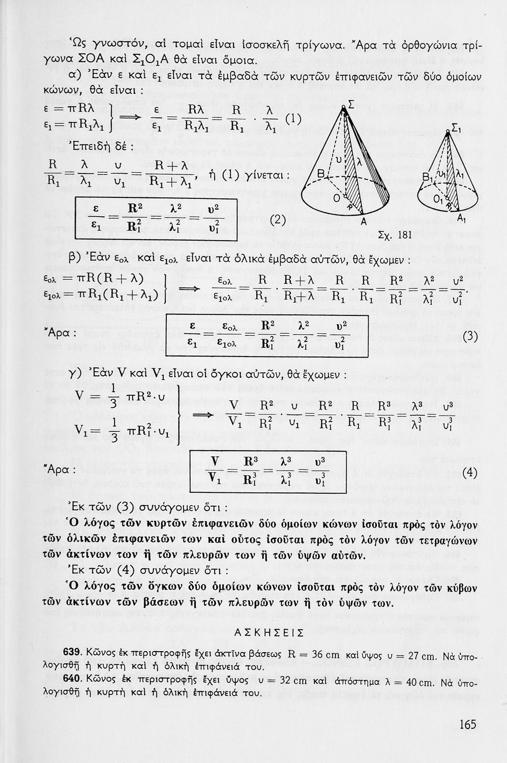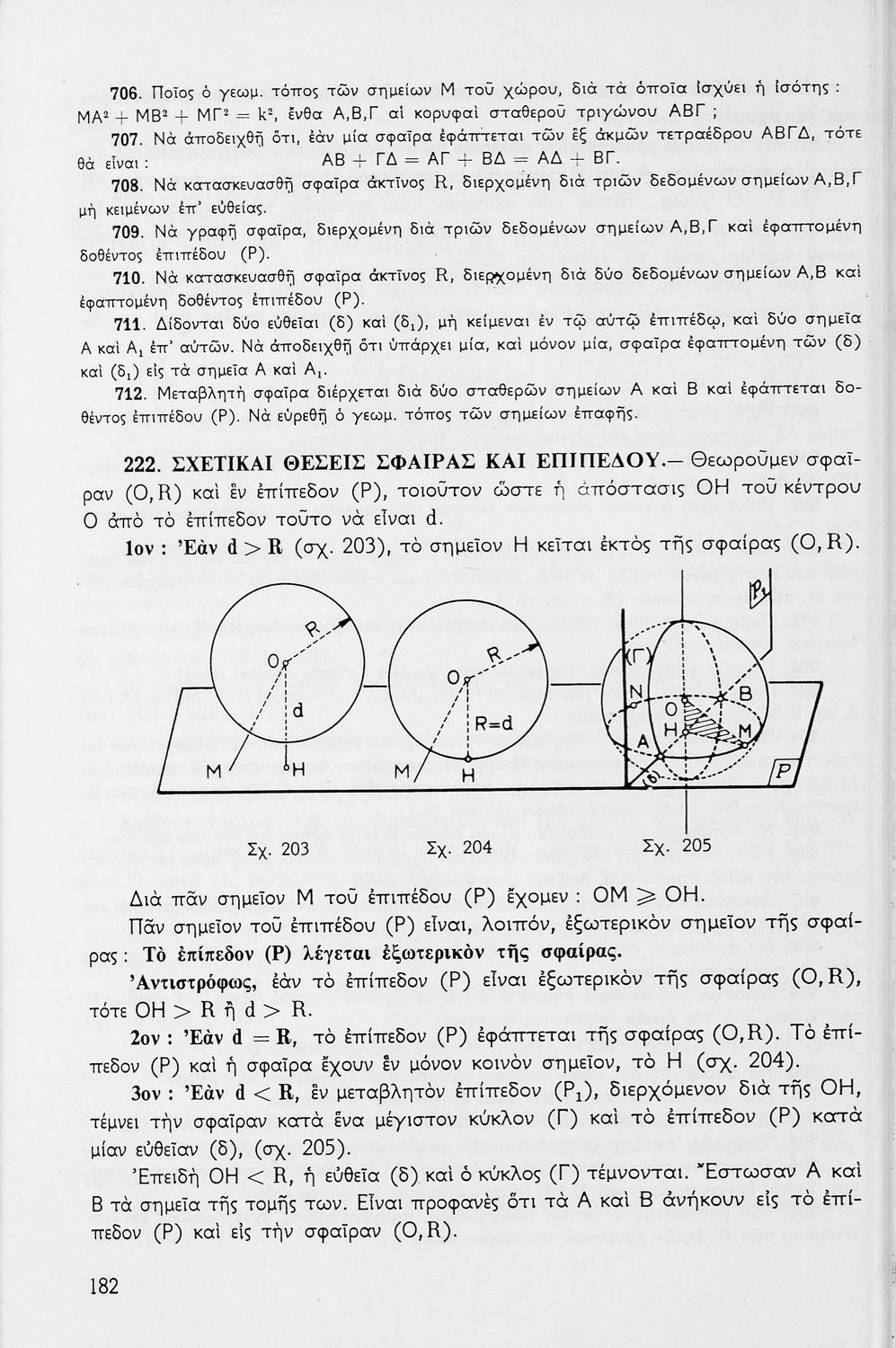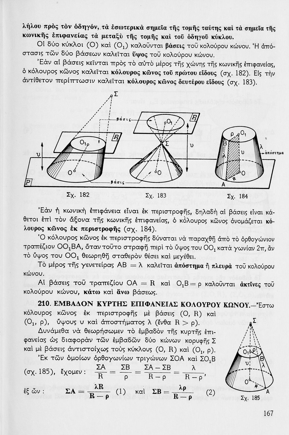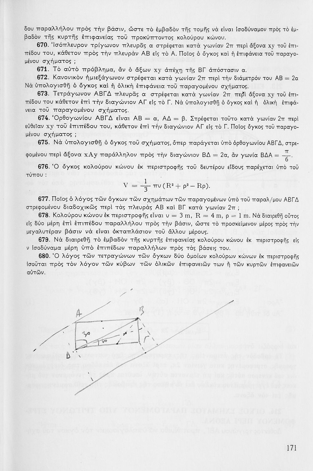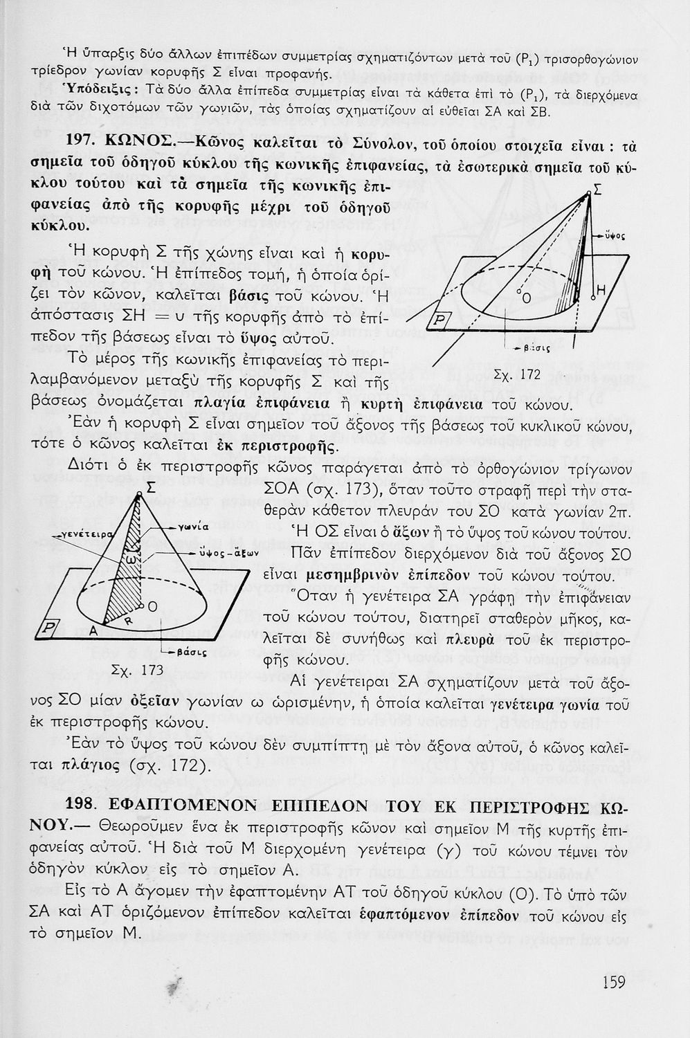 Σχολικό εγχειρίδιο Γεωμετρίας για τις Γ΄, Δ΄, Ε΄, ΣΤ΄ Γυμνασίου που περιλαμβάνει θεωρία και ασκήσεις και είναι χωρισμένο σε Επιπεδομετρία και Στερεομετρία. Φέρει το σύμβολο της δικτατορίας.