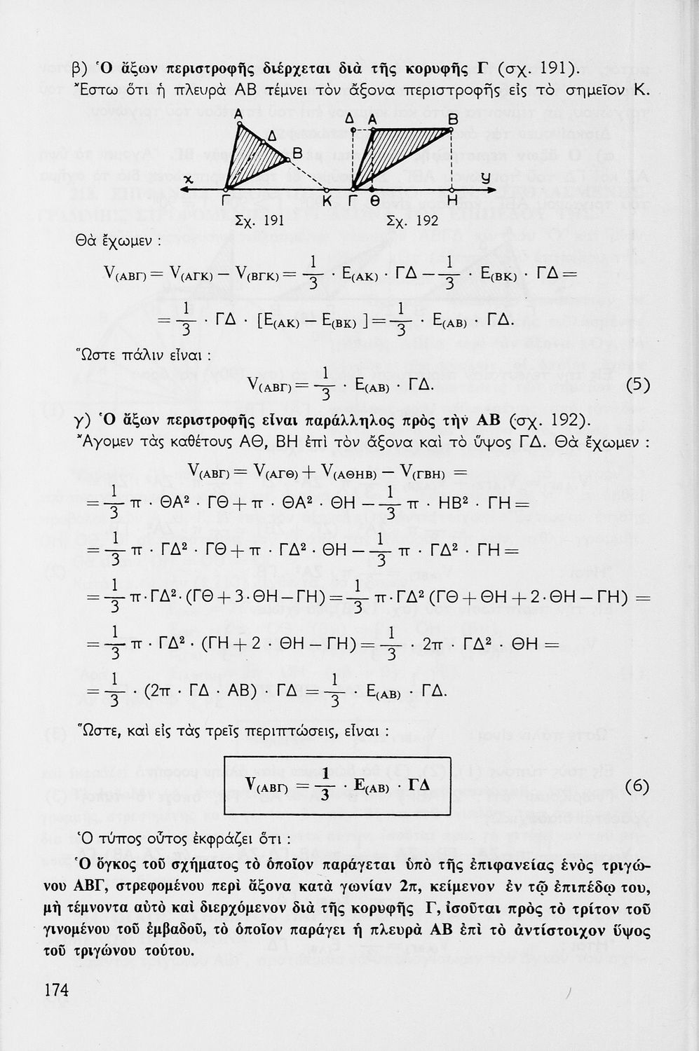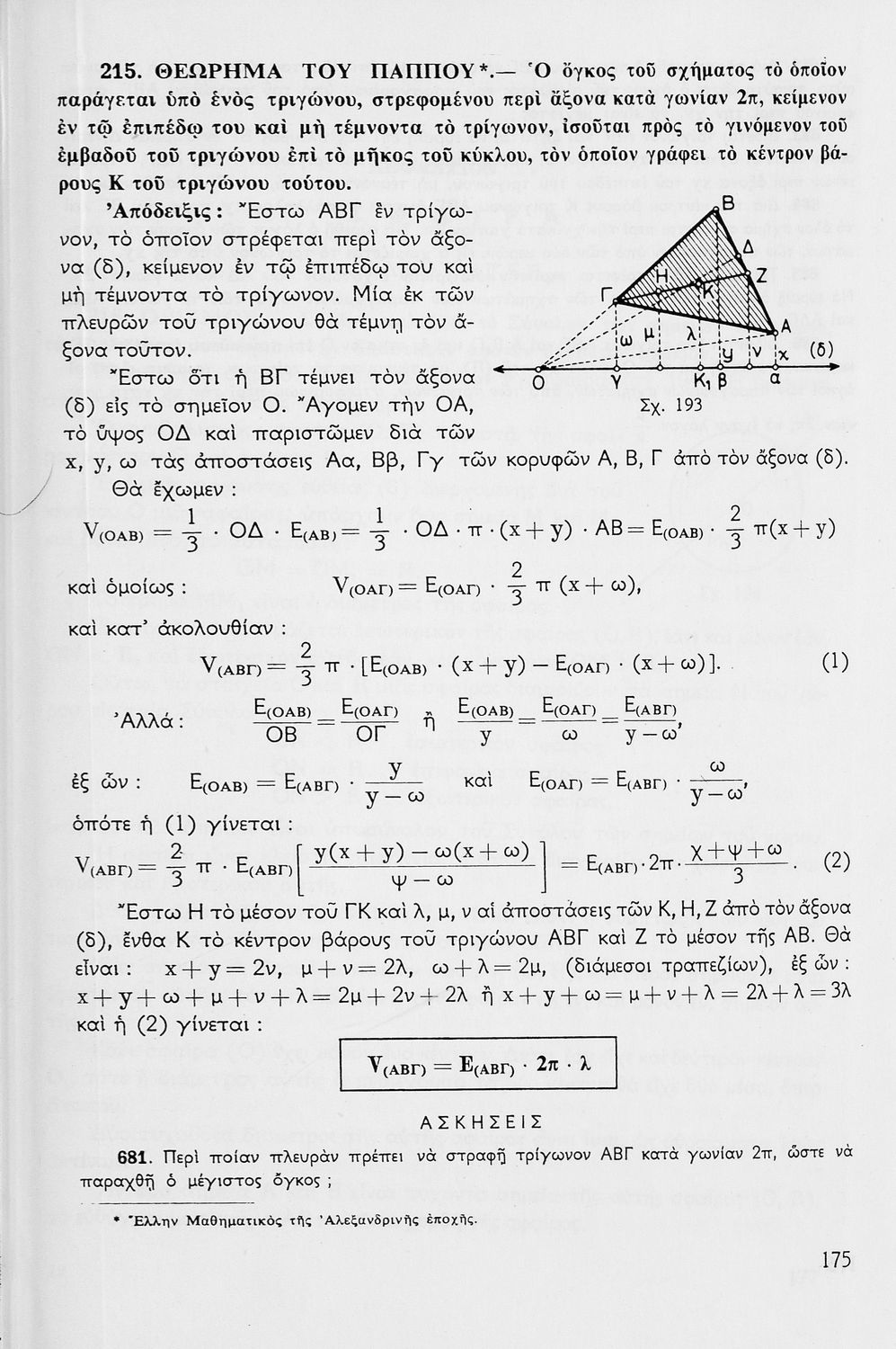 Σχολικό εγχειρίδιο Μαθηματικών για τις Δ΄, Ε΄ και ΣΤ΄ Γυμνασίου χωρισμένο σε θεωρήματα και ασκήσεις που εστιάζει στη Γεωμετρία. Φέρει το σύμβολο της δικτατορίας.