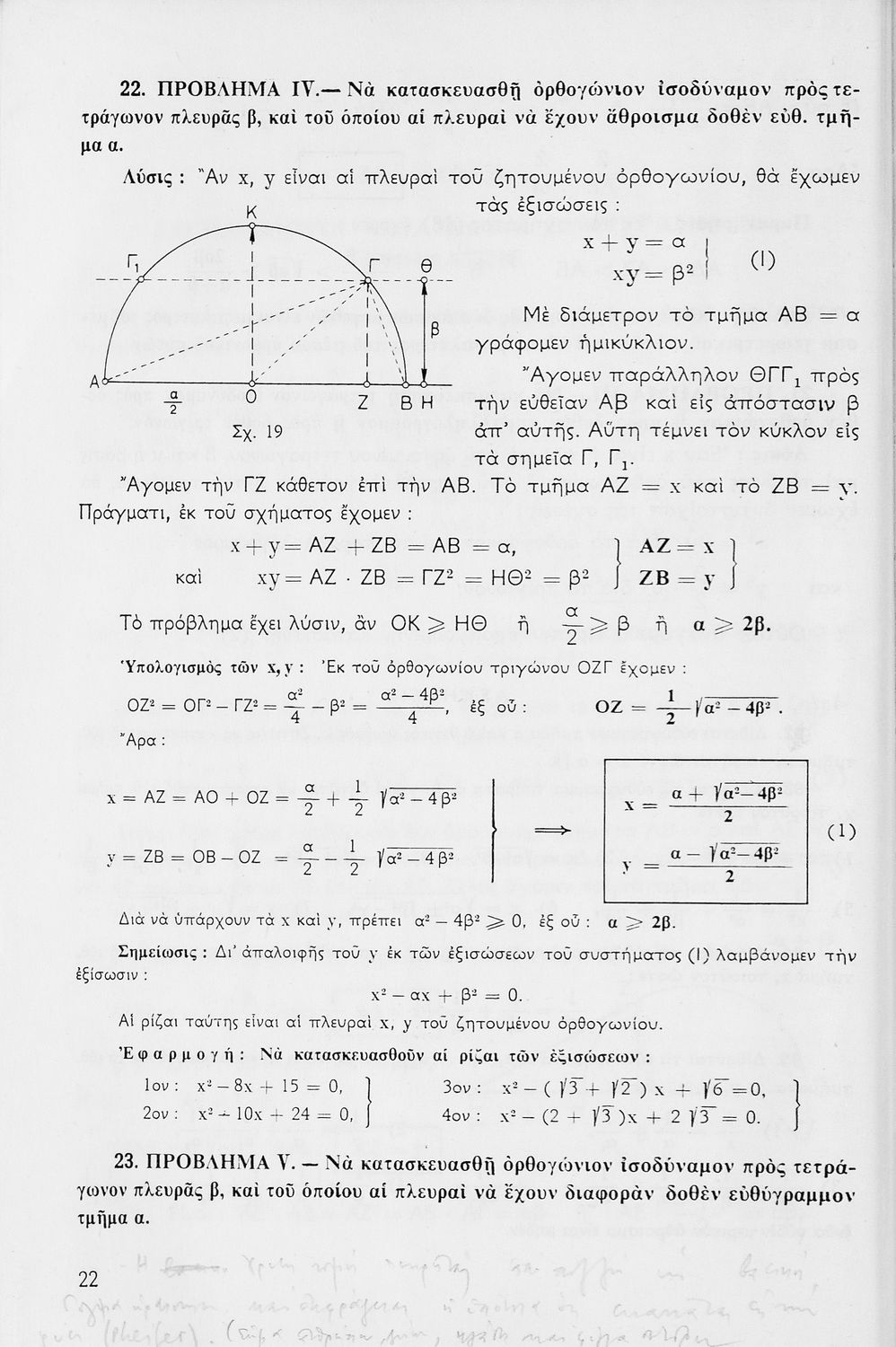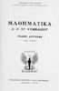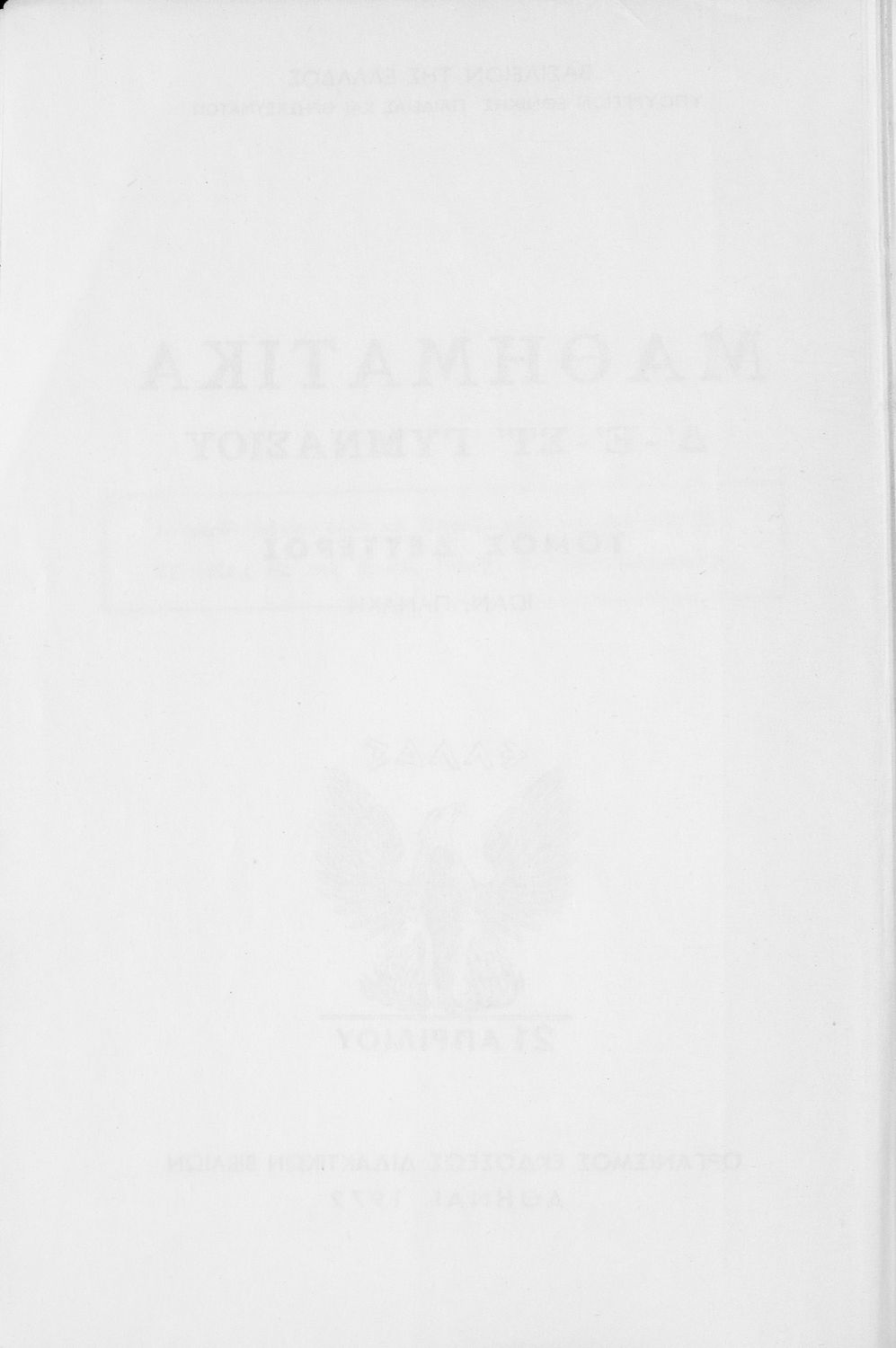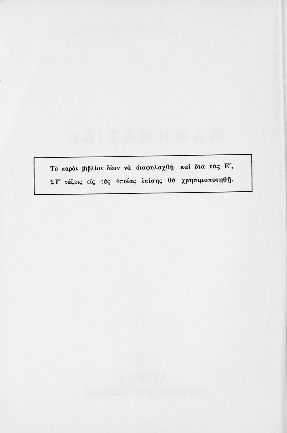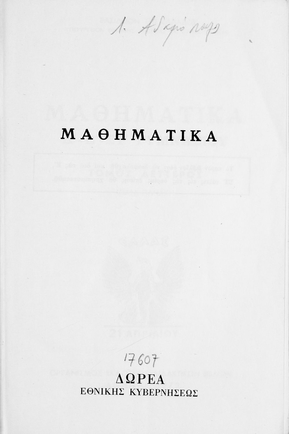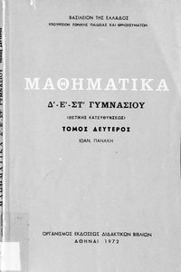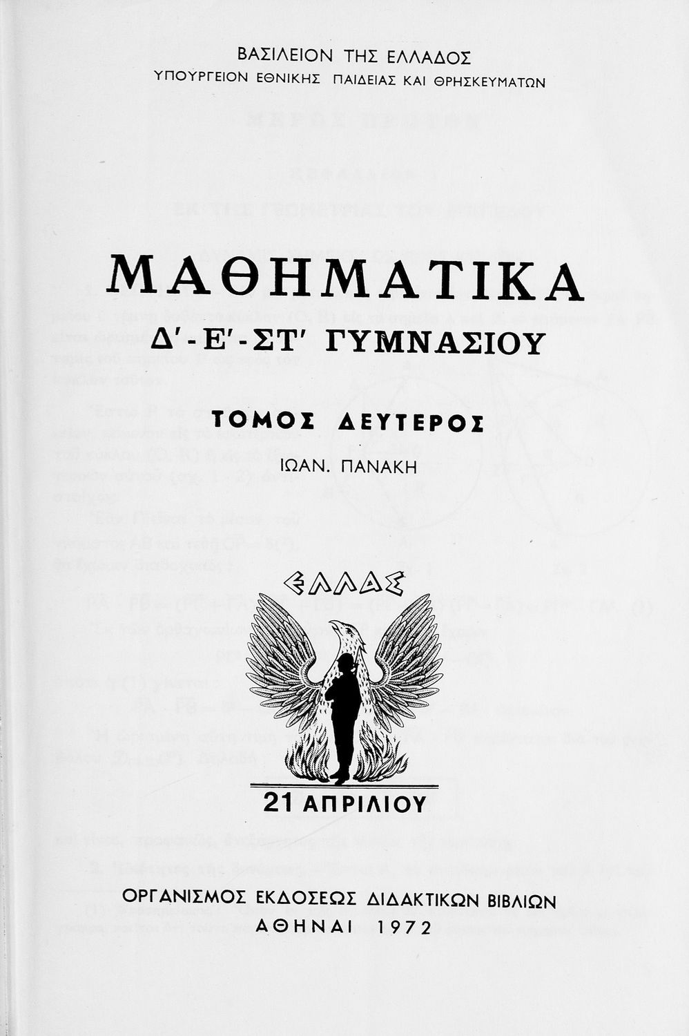 Σχολικό εγχειρίδιο Μαθηματικών Δ΄ και Ε΄ Γυμνασίου που είναι χωρισμένο σε θεωρήματα και ασκήσεις και εστιάζει στη Γεωμετρία. Φέρει το σύμβολο της δικτατορίας.