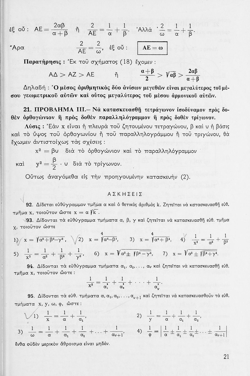 Παρουσίαση περιεχομένου: Σχολικό εγχειρίδιο Μαθηματικών για τις Δ΄, Ε΄ και ΣΤ΄ Γυμνασίου χωρισμένο σε θεωρήματα και ασκήσεις που εστιάζει στη Γεωμετρία. Φέρει το σύμβολο της δικτατορίας.