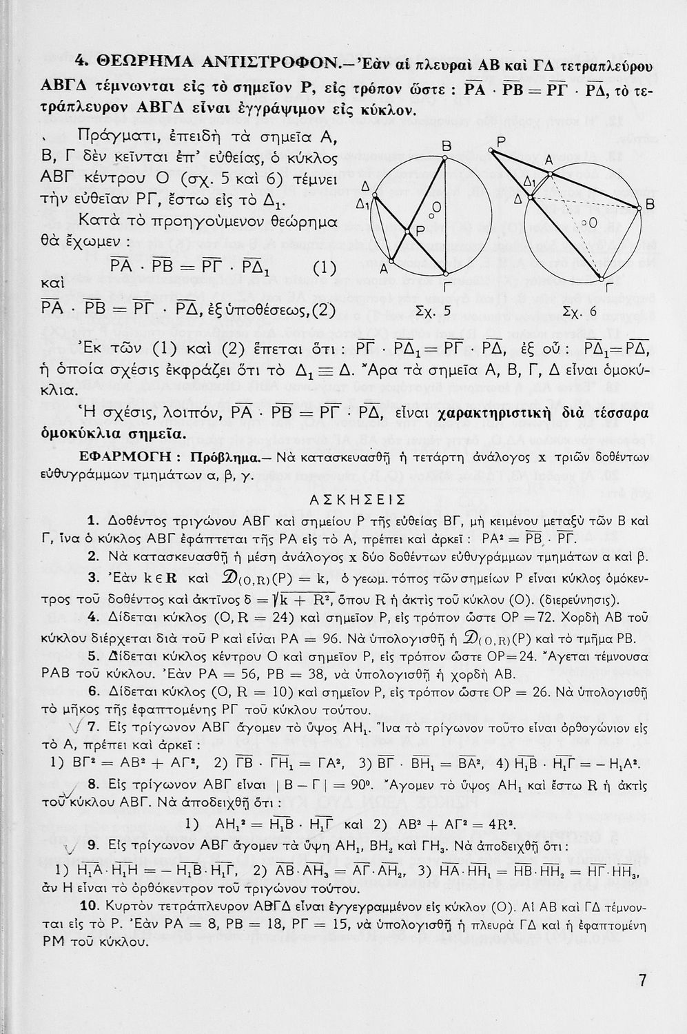 Σχολικό εγχειρίδιο Μαθηματικών για τις Δ΄, Ε΄ και ΣΤ΄ Γυμνασίου χωρισμένο σε θεωρήματα και ασκήσεις που εστιάζει στη Γεωμετρία. Φέρει το σύμβολο της δικτατορίας.