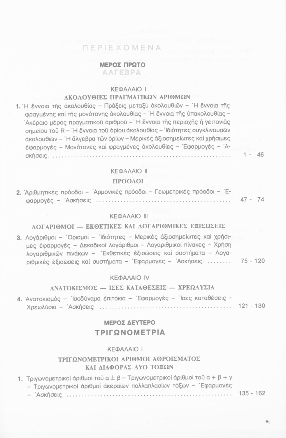 Σχολικό εγχειρίδιο Μαθηματικών Β΄ Λυκείου που περιλαμβάνει Άλγεβρα και Τριγωνομετρία και είναι χωρισμένο σε θεωρήματα, παρατηρήσεις, παραδείγματα και ασκήσεις.