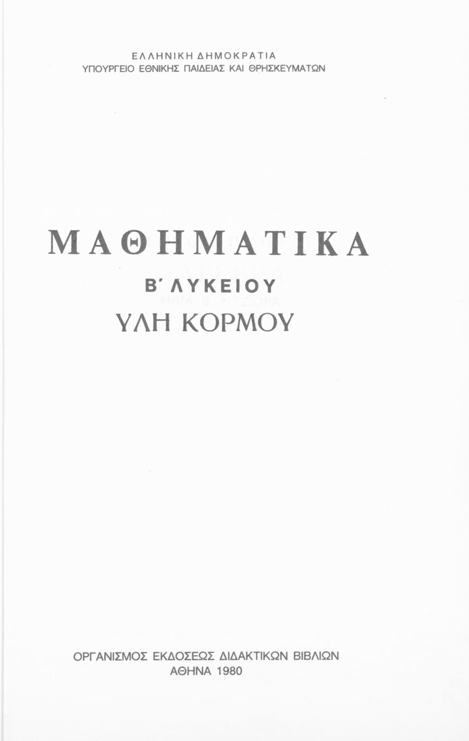 Σχολικό εγχειρίδιο Άλγεβρας Β΄ Λυκείου χωρισμένο σε θεωρία, παρατηρήσεις και ασκήσεις που περιλαμβάνει και στοιχεία από το Διανυσματικό Λογισμό και την Αναλυτική Γεωμετρία που έχουν συγγραφεί από τον Ιωάννη ...
