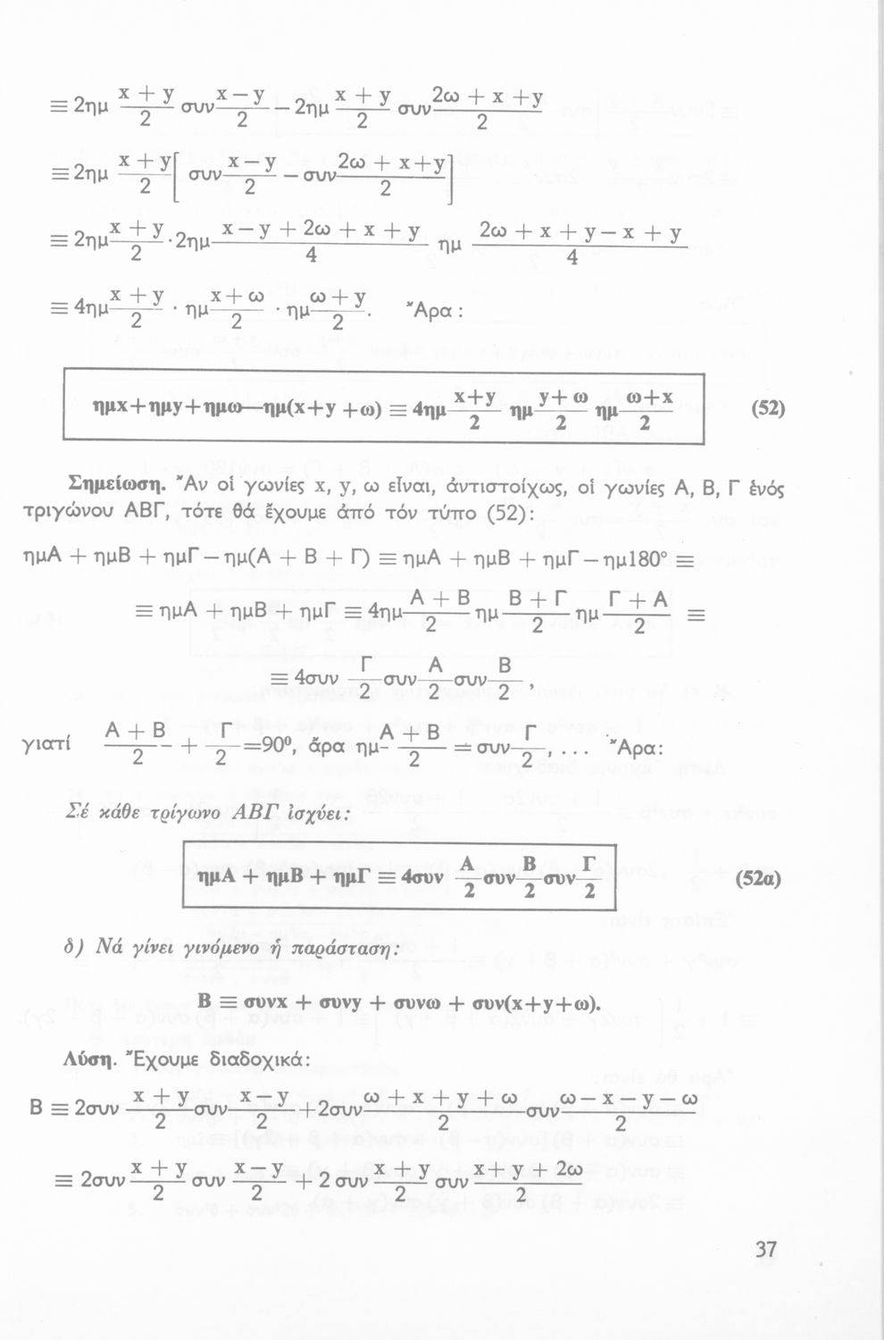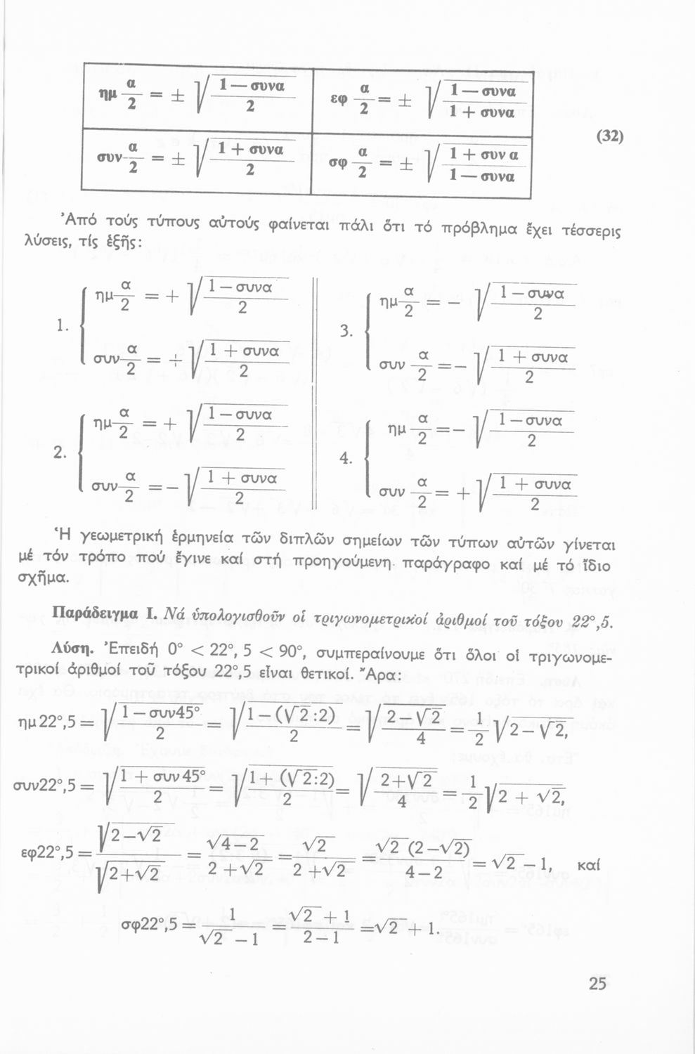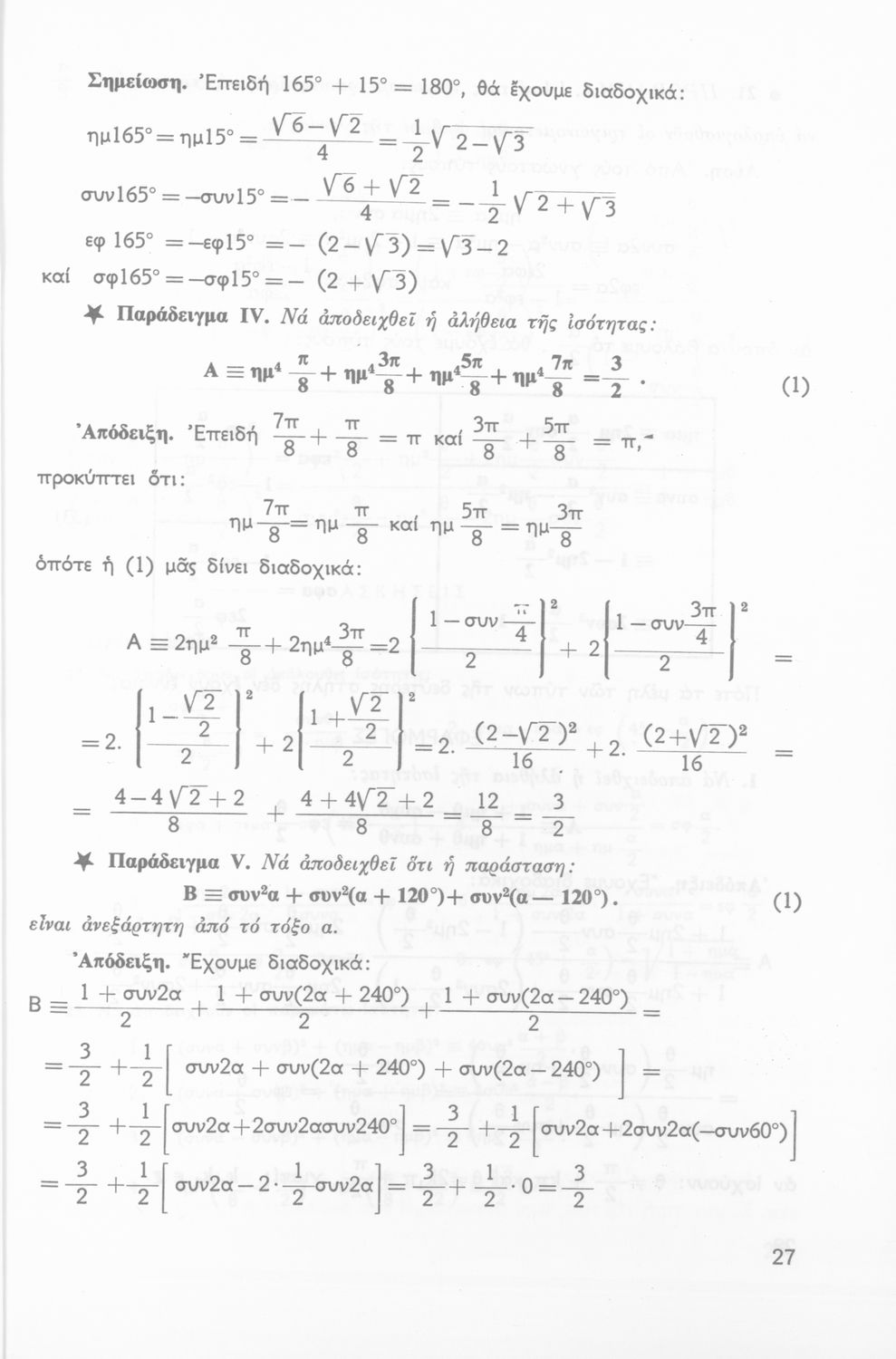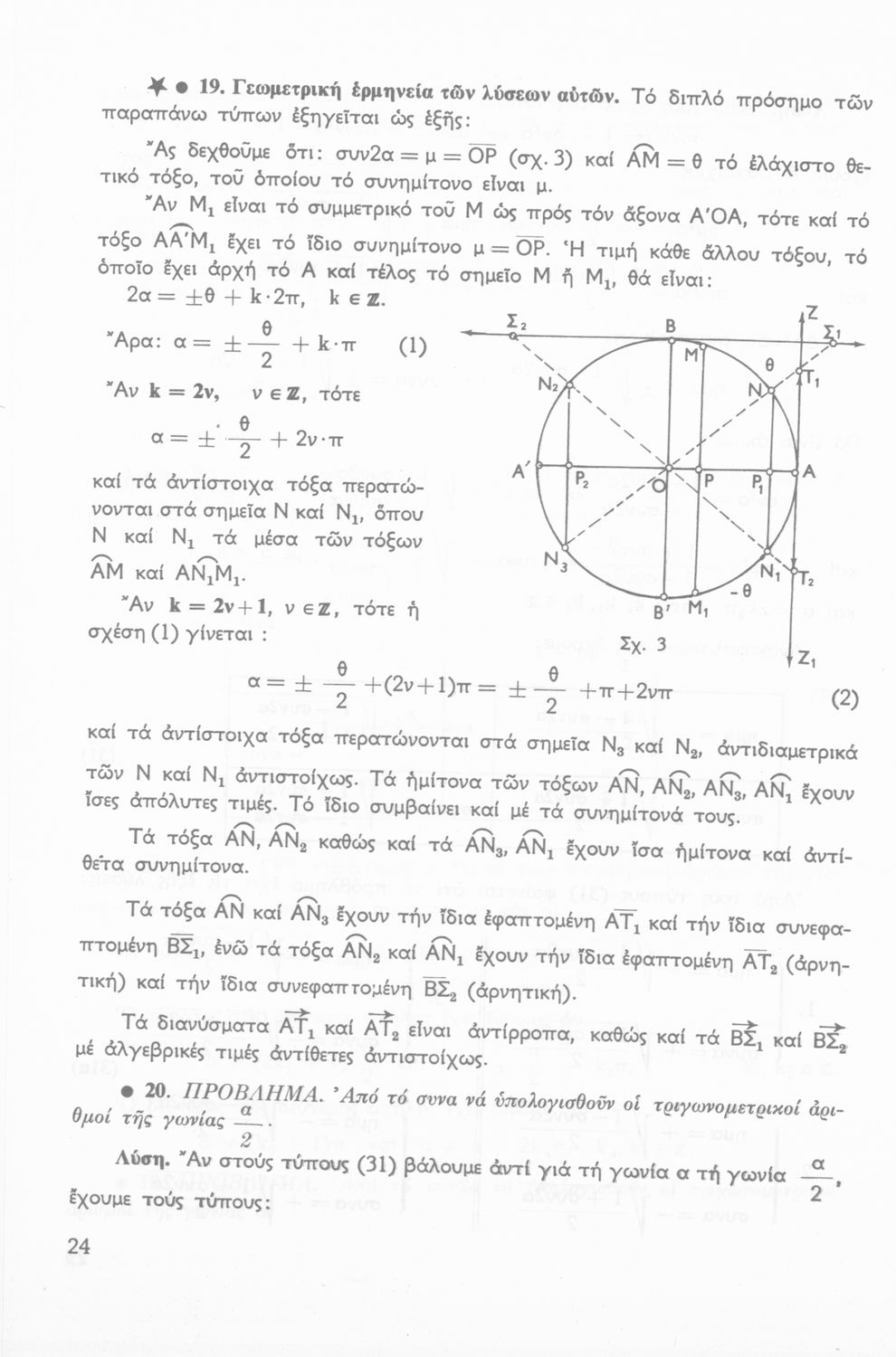 Σχολικό εγχειρίδιο Τριγωνομετρίας για την Β΄ Λυκείου χωρισμένο σε προβλήματα, εφαρμογές και ασκήσεις. Το εγχειρίδιο μεταγλωττίστηκε στη δημοτική από τους Βασίλειο Θεοδωρακόπουλο, Απόστολο Ζορμπά και τον συγγραφέα. Οι μαθητές της κλασσικής κατεύθυνσης δεν διδάσκονταν κάποια από τα κεφάλαια.