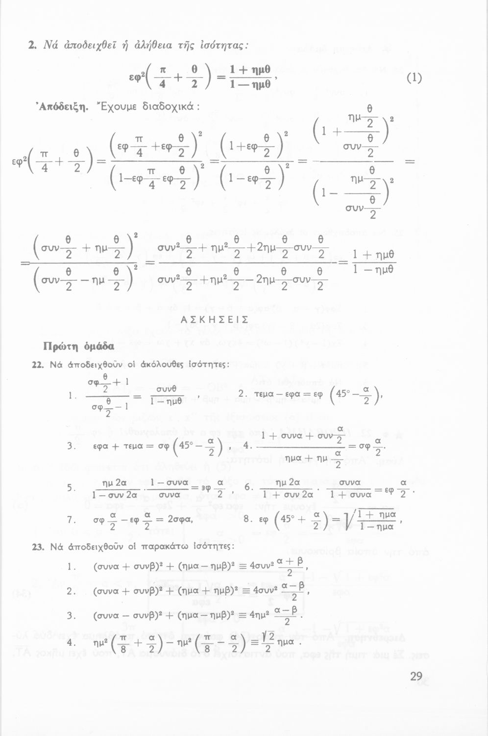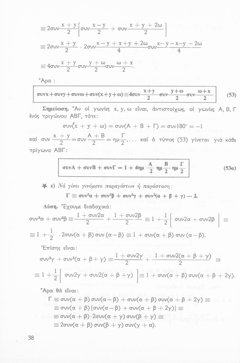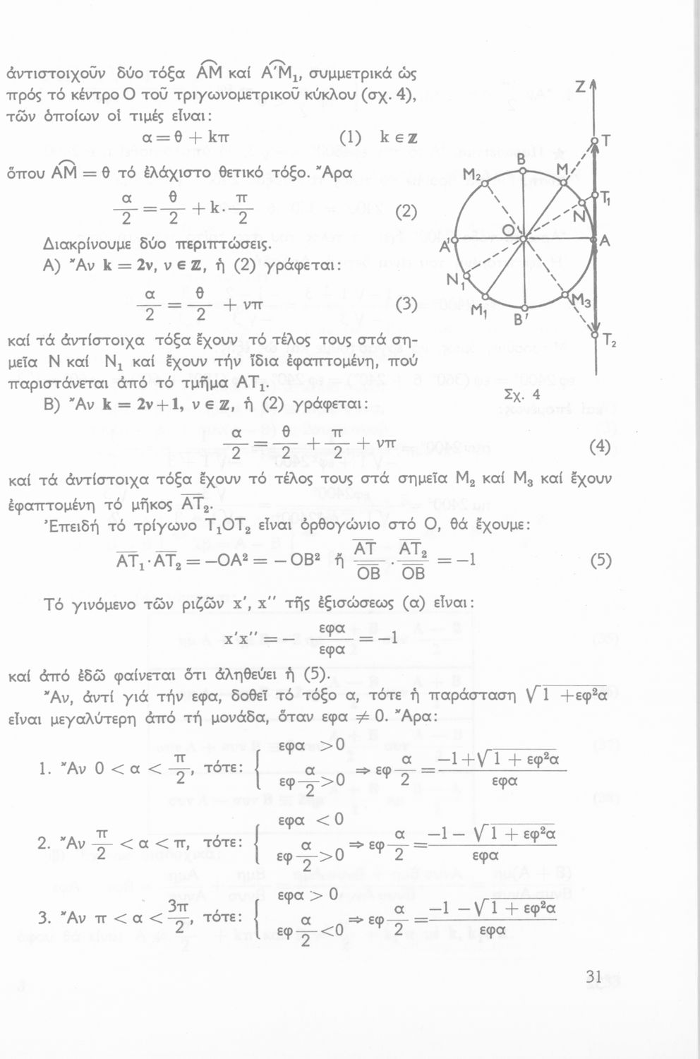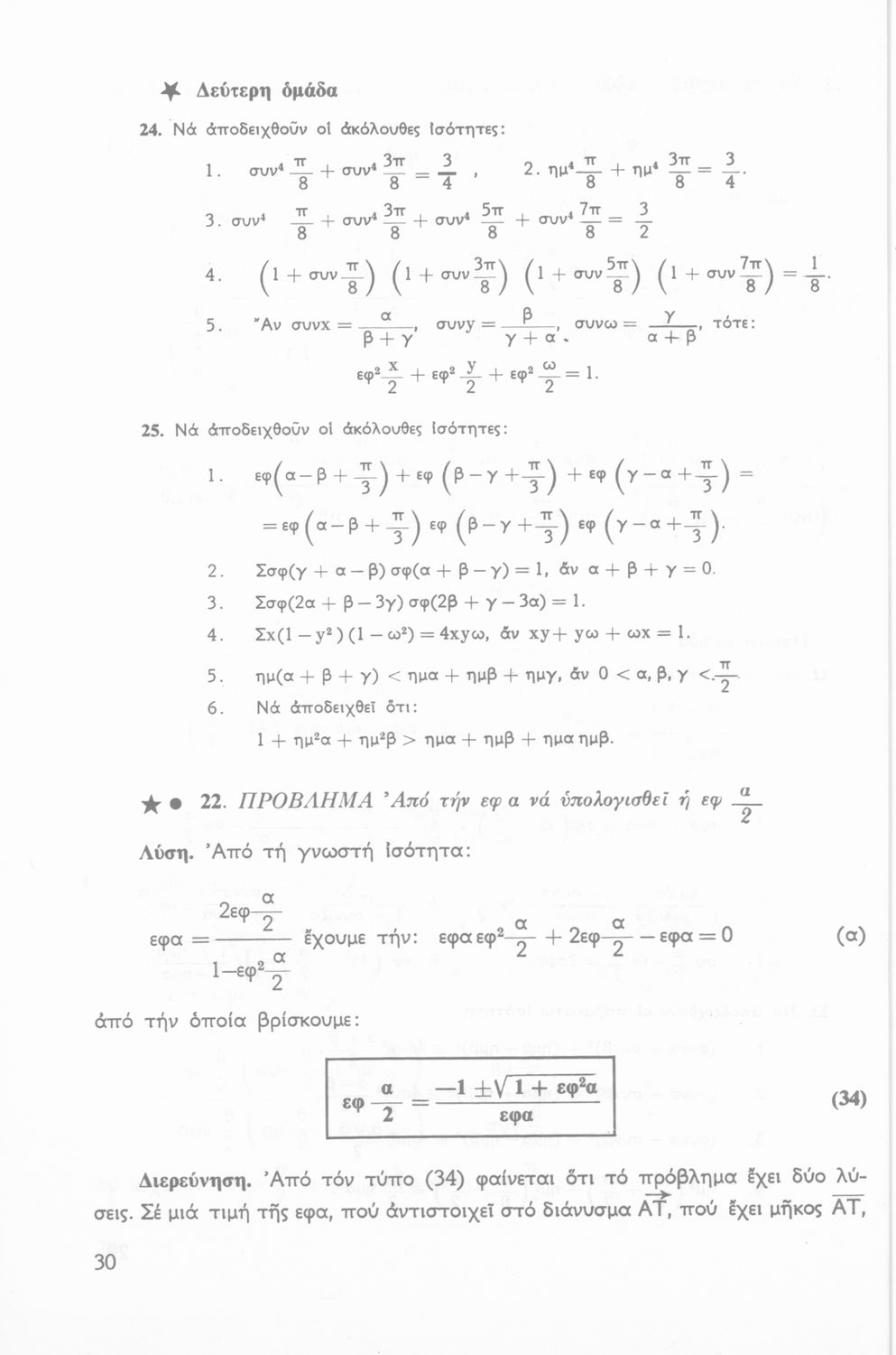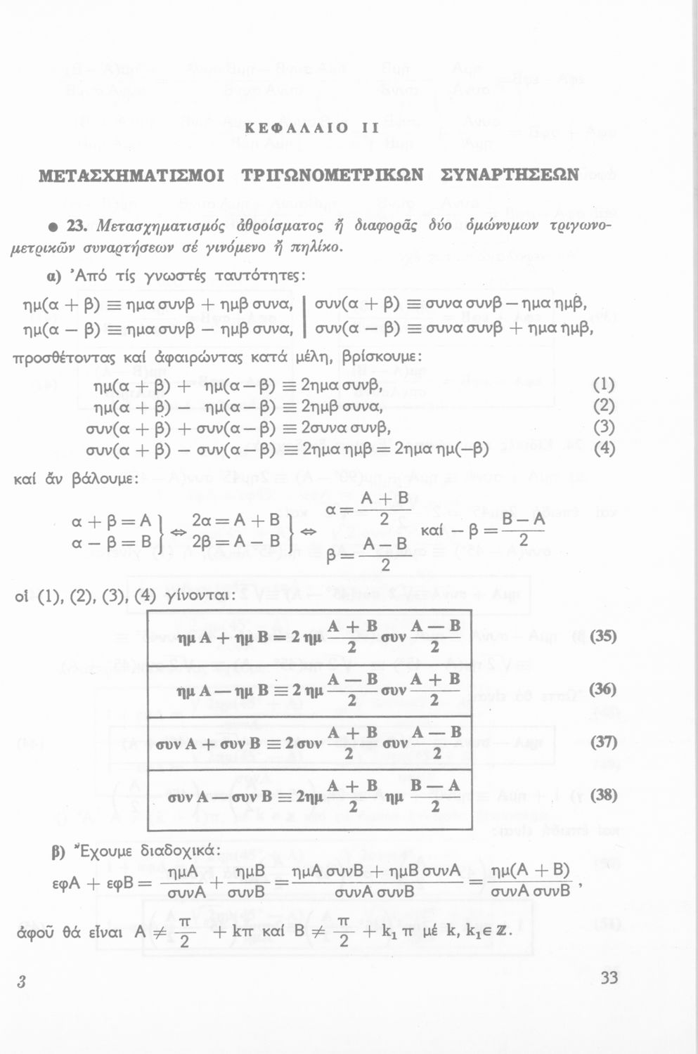 Σχολικό εγχειρίδιο Τριγωνομετρίας για την Β΄ Λυκείου χωρισμένο σε προβλήματα, εφαρμογές και ασκήσεις. Το εγχειρίδιο μεταγλωττίστηκε στη δημοτική από τους Βασίλειο Θεοδωρακόπουλο, Απόστολο Ζορμπά και τον συγγραφέα. Οι μαθητές της κλασσικής κατεύθυνσης δεν διδάσκονταν κάποια από τα κεφάλαια.