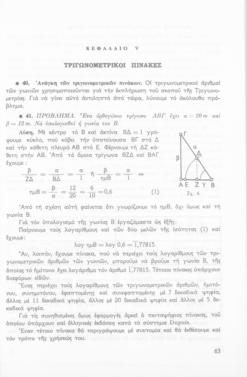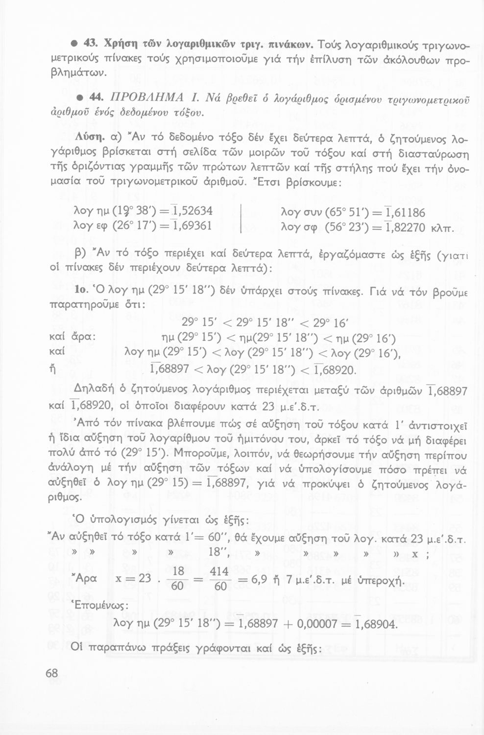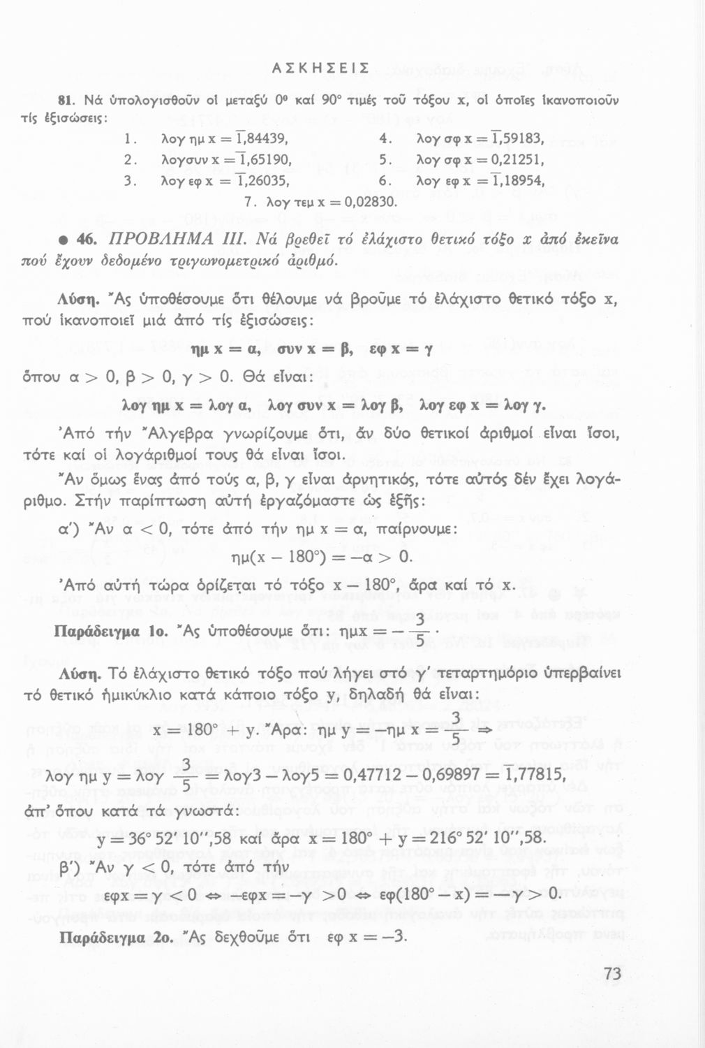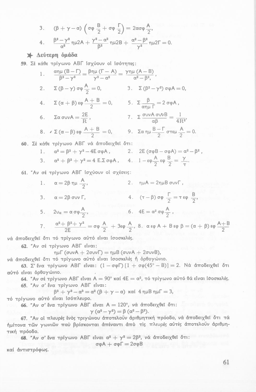 Σχολικό εγχειρίδιο Τριγωνομετρίας για την Β΄ Λυκείου χωρισμένο σε προβλήματα, εφαρμογές και ασκήσεις. Το εγχειρίδιο μεταγλωττίστηκε στη δημοτική από τους Βασίλειο Θεοδωρακόπουλο, Απόστολο Ζορμπά και τον συγγραφέα. Οι μαθητές της κλασσικής κατεύθυνσης δεν διδάσκονταν κάποια από τα κεφάλαια.