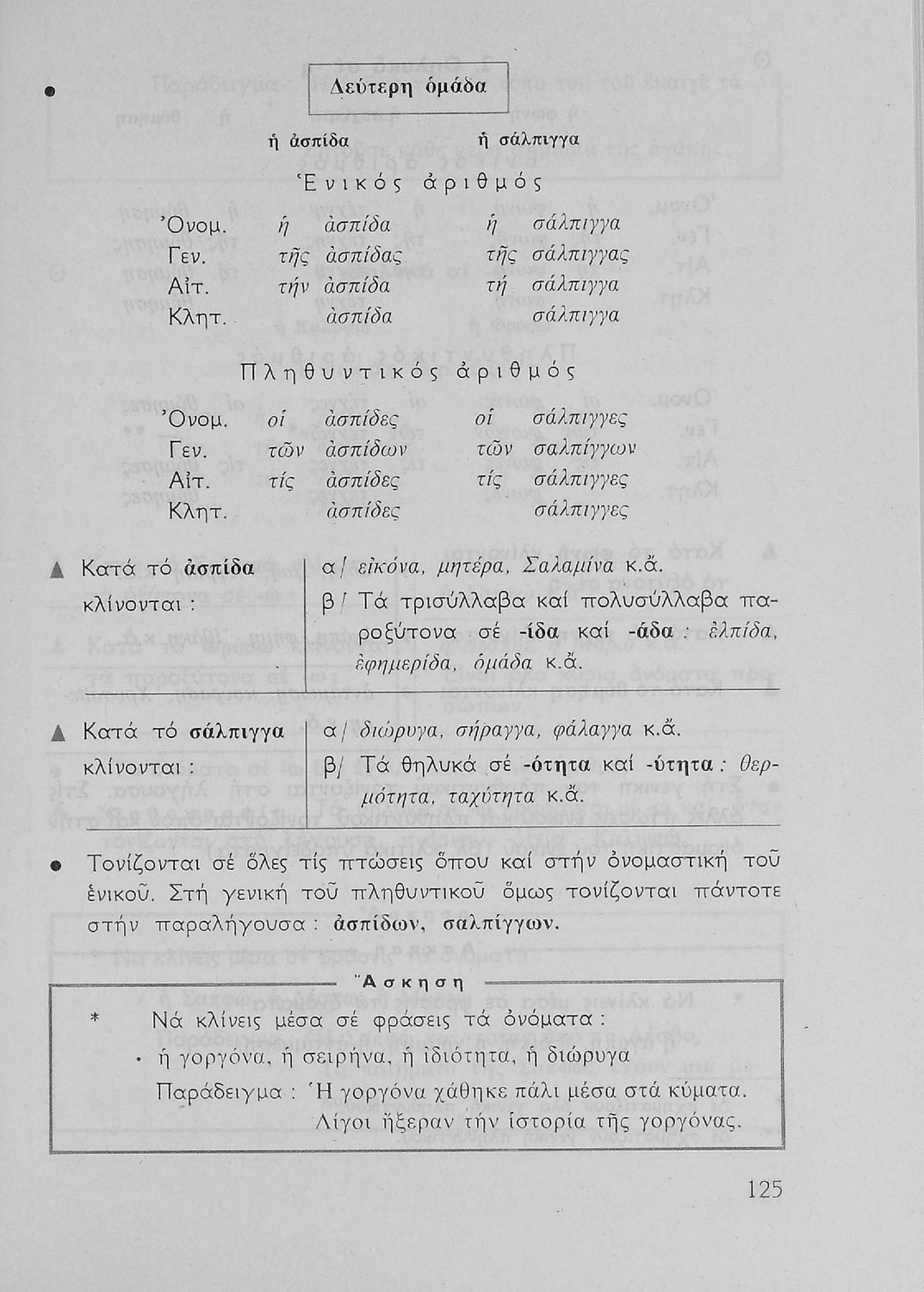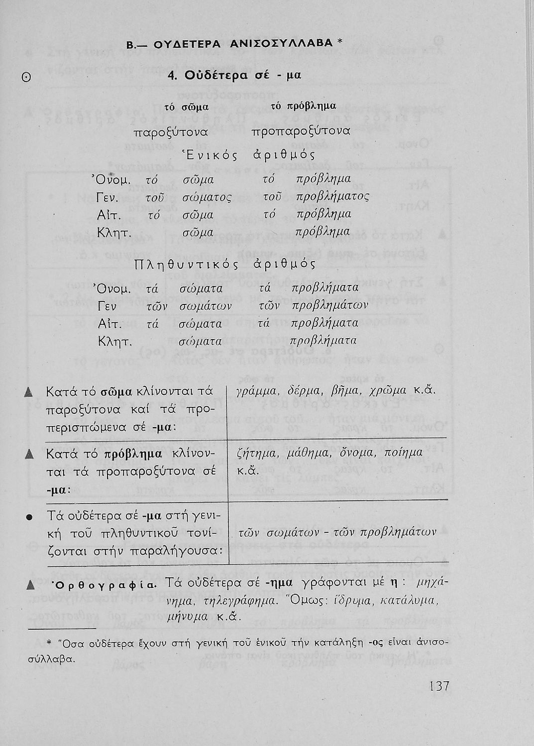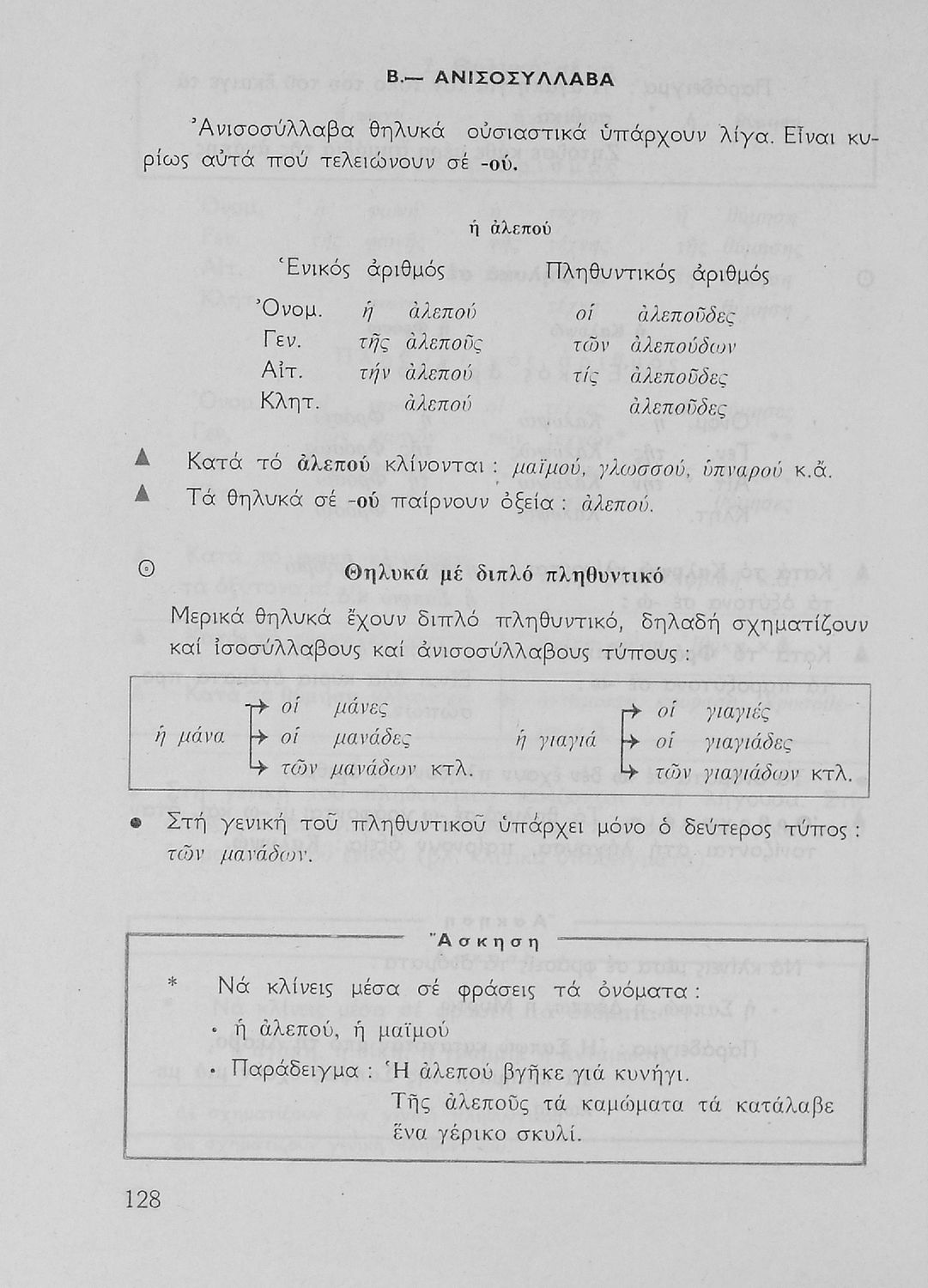 Σχολικό εγχειρίδιο της Ε΄ και ΣΤ΄ τάξης Δημοτικού για την γραμματική της ελληνικής γλώσσας με κανόνες και παραδείγματα. Στο επίμετρο υπάρχουν πίνακες με ανώμαλους σχηματισμούς ρημάτων.