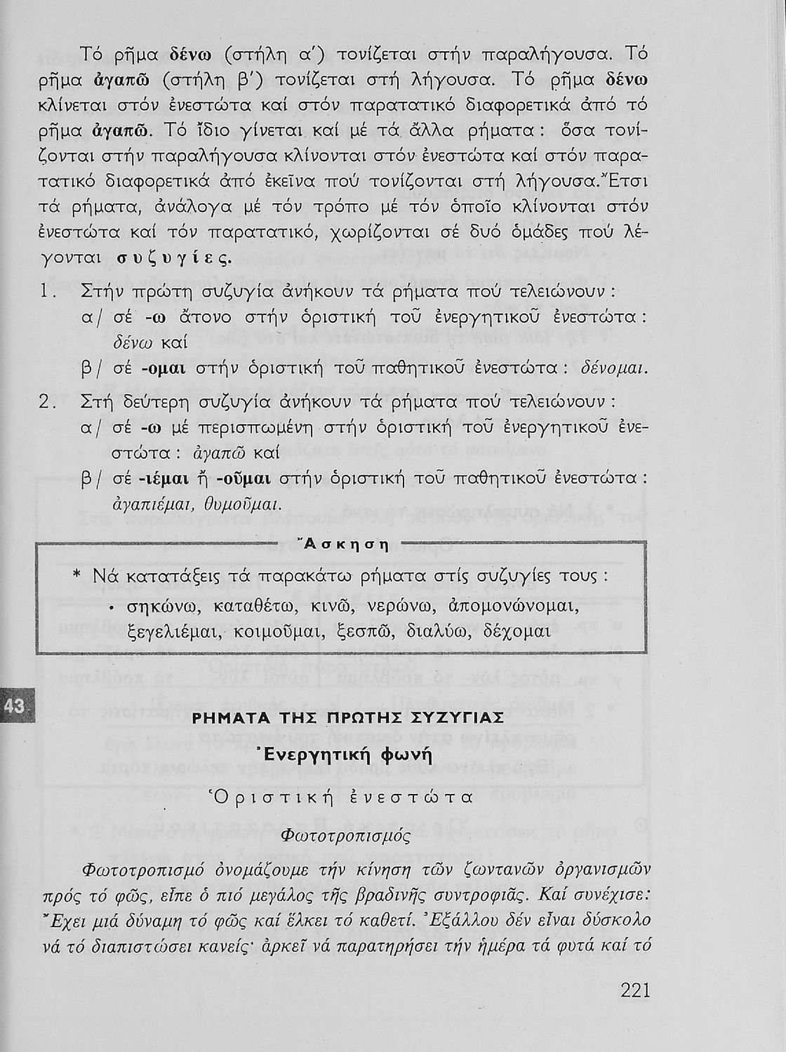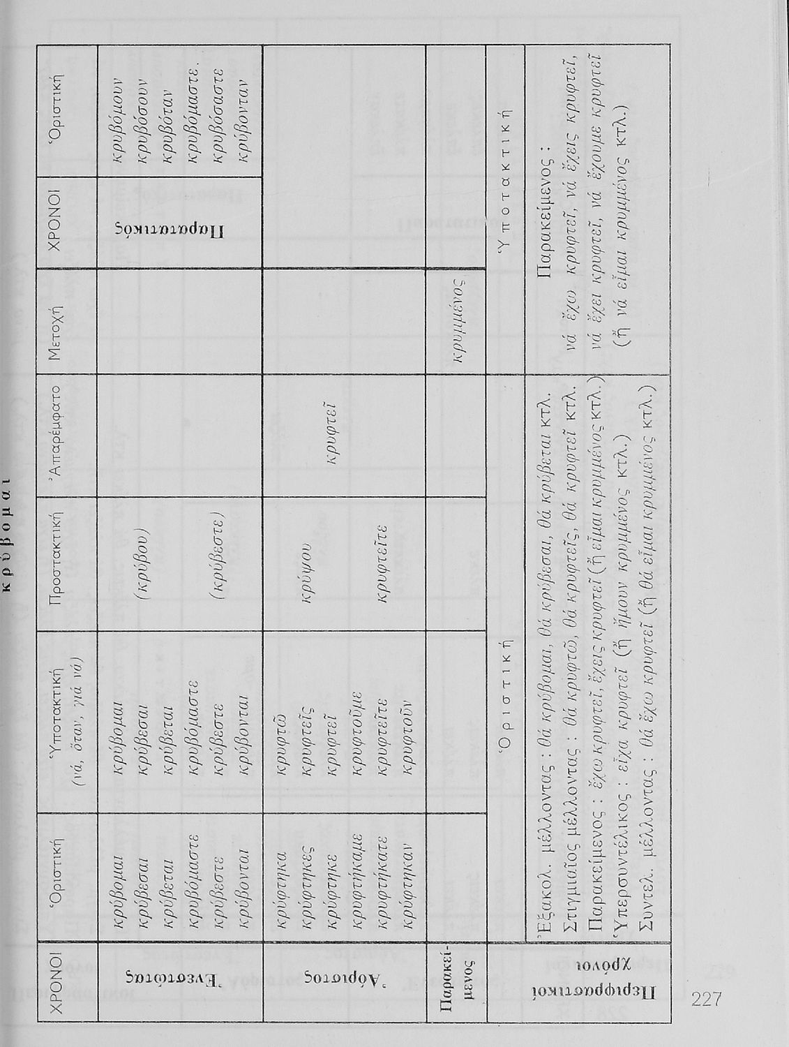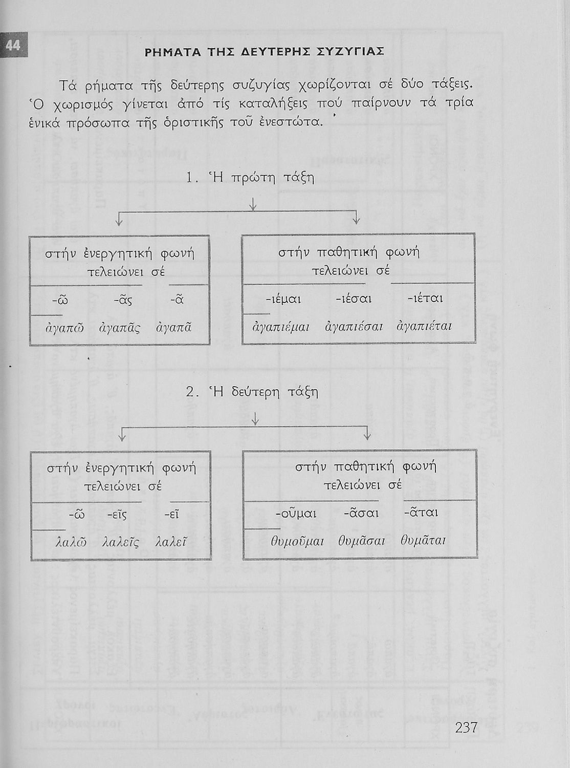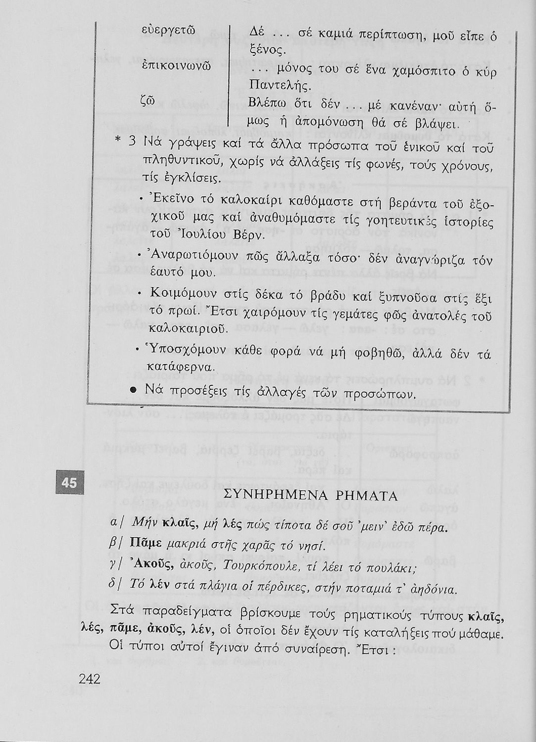 Σχολικό εγχειρίδιο της Ε΄ και ΣΤ΄ τάξης Δημοτικού για την γραμματική της ελληνικής γλώσσας με κανόνες και παραδείγματα. Στο επίμετρο υπάρχουν πίνακες με ανώμαλους σχηματισμούς ρημάτων.