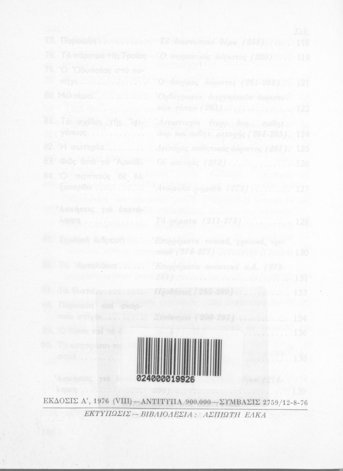 Εκδότης: Οργανισμός Εκδόσεως Διδακτικών Βιβλίων Έτος έκδοσης: 1976 Τόπος έκδοσης: Αθήνα Έκδοση: 1η Υπουργική απόφαση / Σύμβαση: 2759/12- 8-1976 Έτος έγκρισης: 1976 |