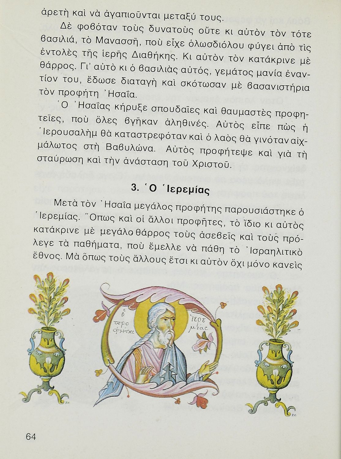 Σχολικό εγχειρίδιο Θρησκευτικών για τους μαθητές της Γ' Δημοτικού. Ενώ το βιβλίο αναφέρεται σε θέματα Παλαιάς Διαθήκης στο τέλος έχει γιορτές αγίων που έχουν σχέση με την ιστορία της Εκκλησίας.