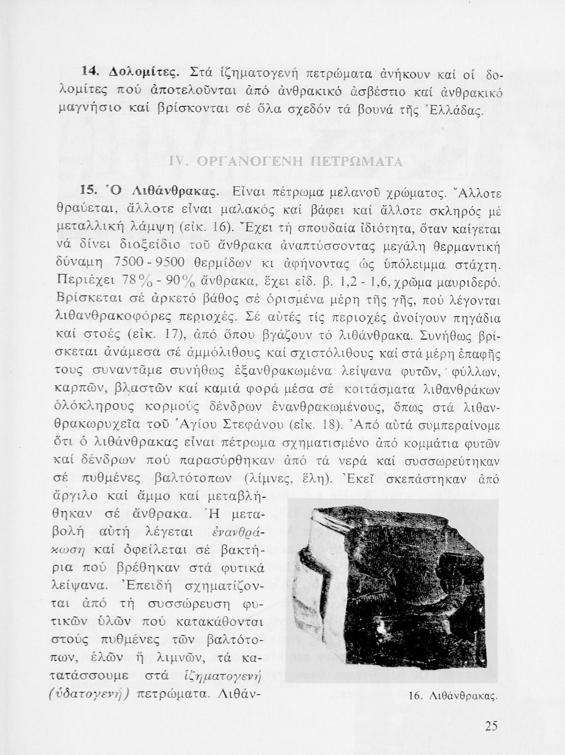 Βαθμίδα εκπαίδευσης: Δευτεροβάθμια Τάξη: Α' Λυκείου Μάθημα: Γεωλογία, Ορυκτολογία Γλώσσα: Δημοτική Παρουσίαση περιεχομένου: Σχολικό εγχειρίδιο Γεωλογίας/Ορυκτολογίας για την Α΄ Λυκείου που περιλαμβάνει χθονογραφική, δυναμική και ιστορική γεωλογία, και γενική και ειδική ορυκτολογία. Ο συγγραφέας ήταν καθηγητής πανεπιστημίου και η συγγραφέας φυσικός. |