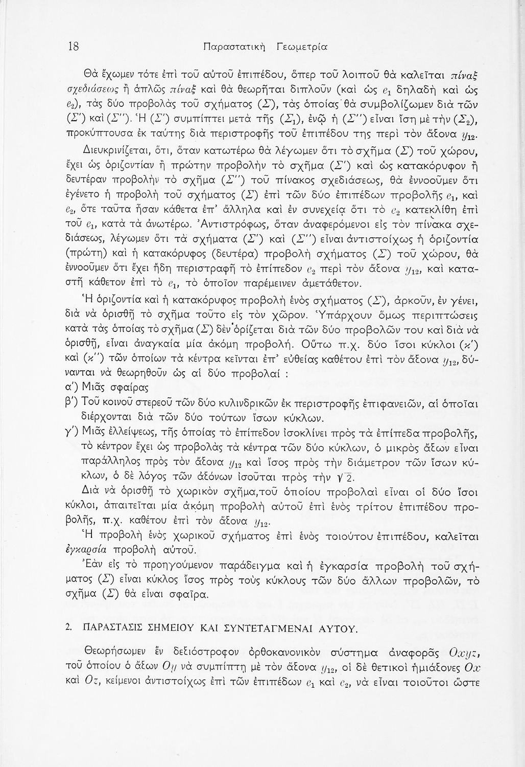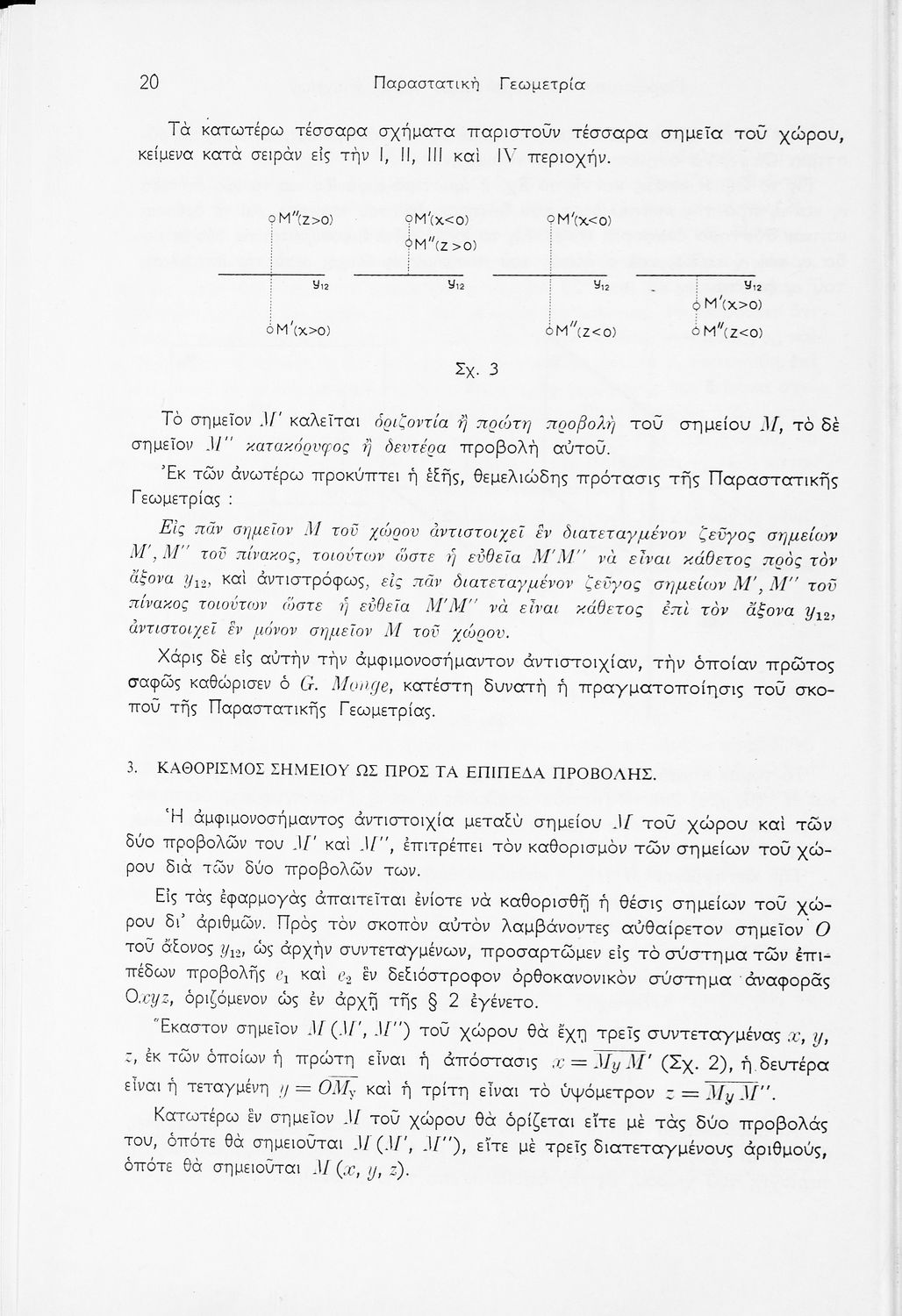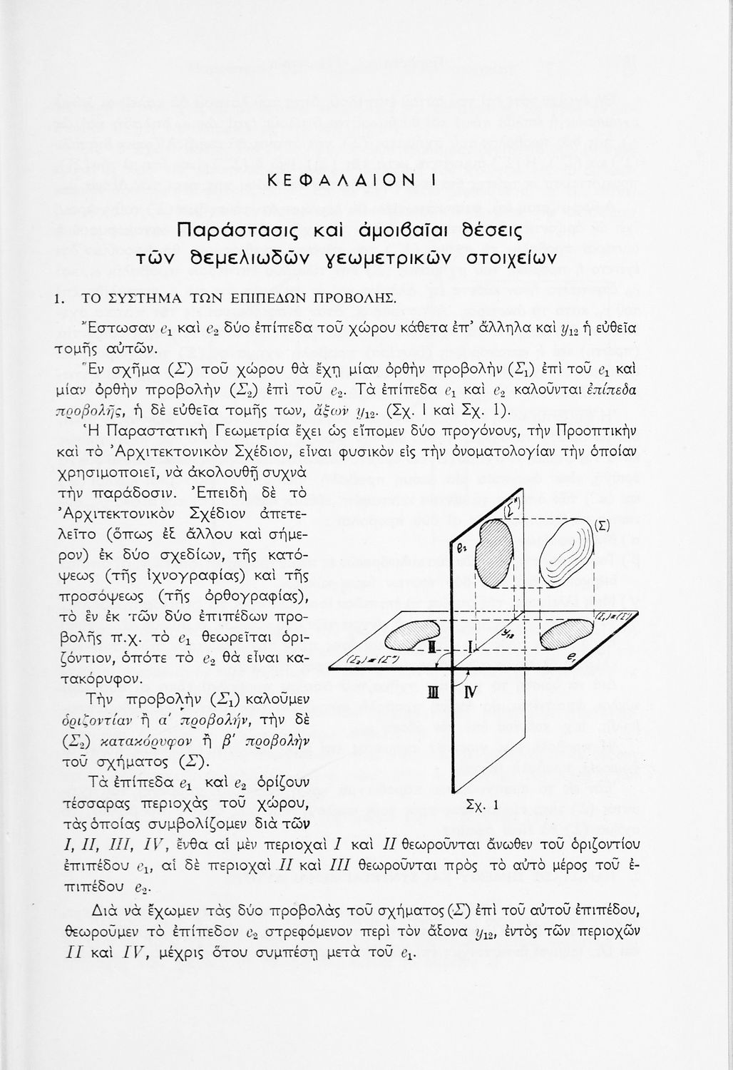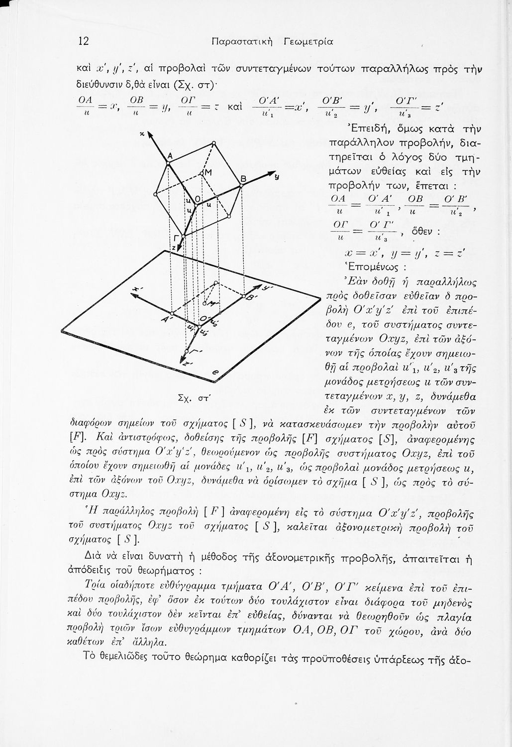 Παρουσίαση περιεχομένου: Σχολικό εγχειρίδιο Παραστατικής Γεωμετρίας για τις Ε΄ και ΣΤ΄ Γυμνασίου χωρισμένο σε θεωρία και ασκήσεις που περιλαμβάνει παράρτημα με έγχρωμα διαγράμματα σε Χ, Ψ, Ζ άξονα. Ο συγγραφέας ήταν καθηγητής στο ΕΜΠ. Φέρει το σύμβολο της δικτατορίας.