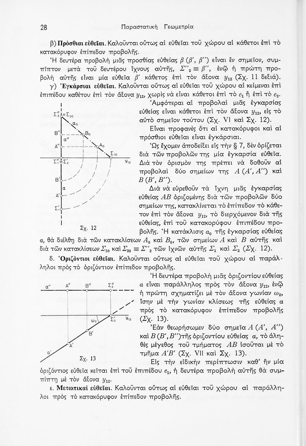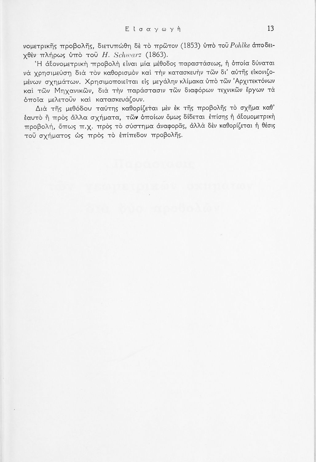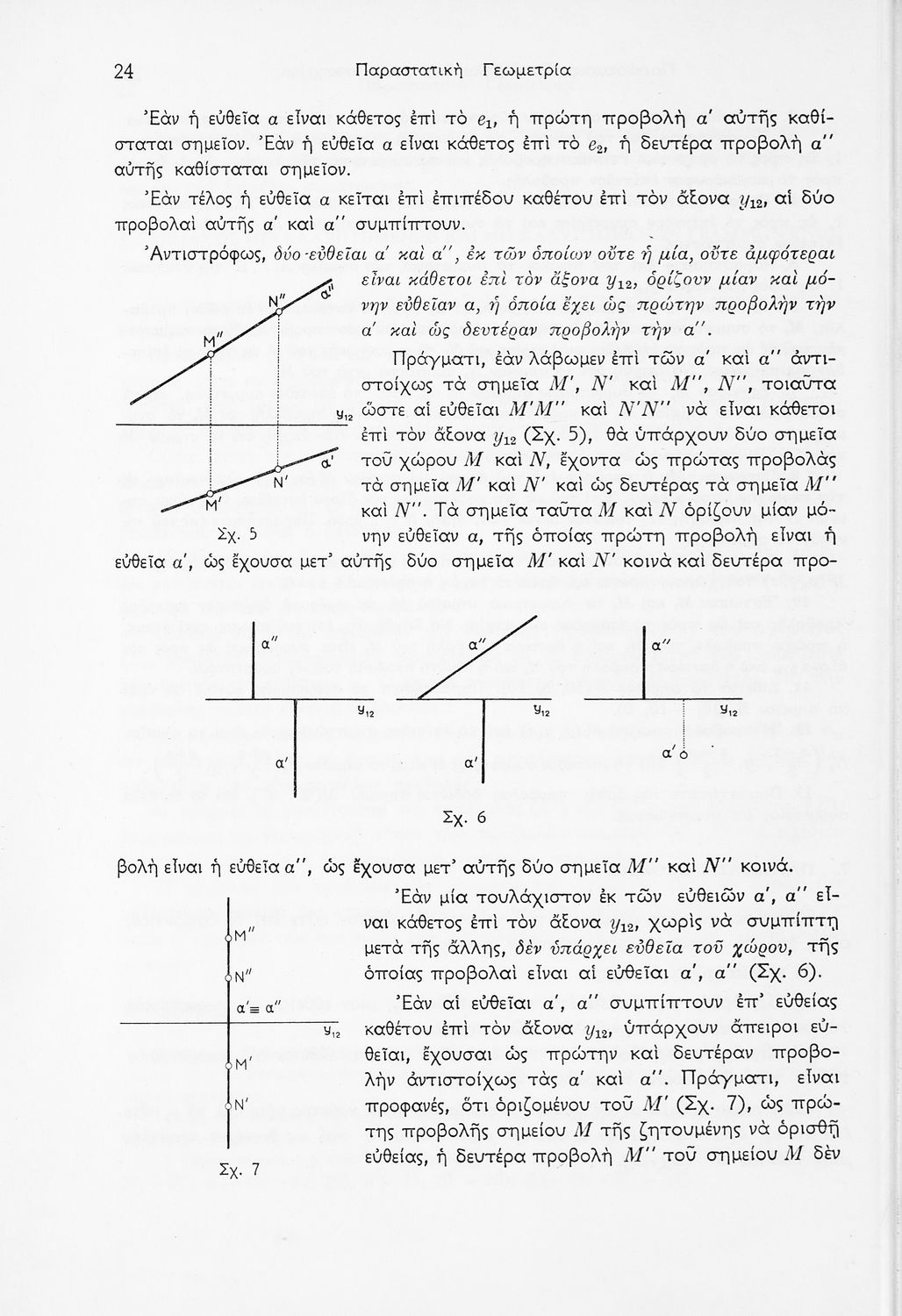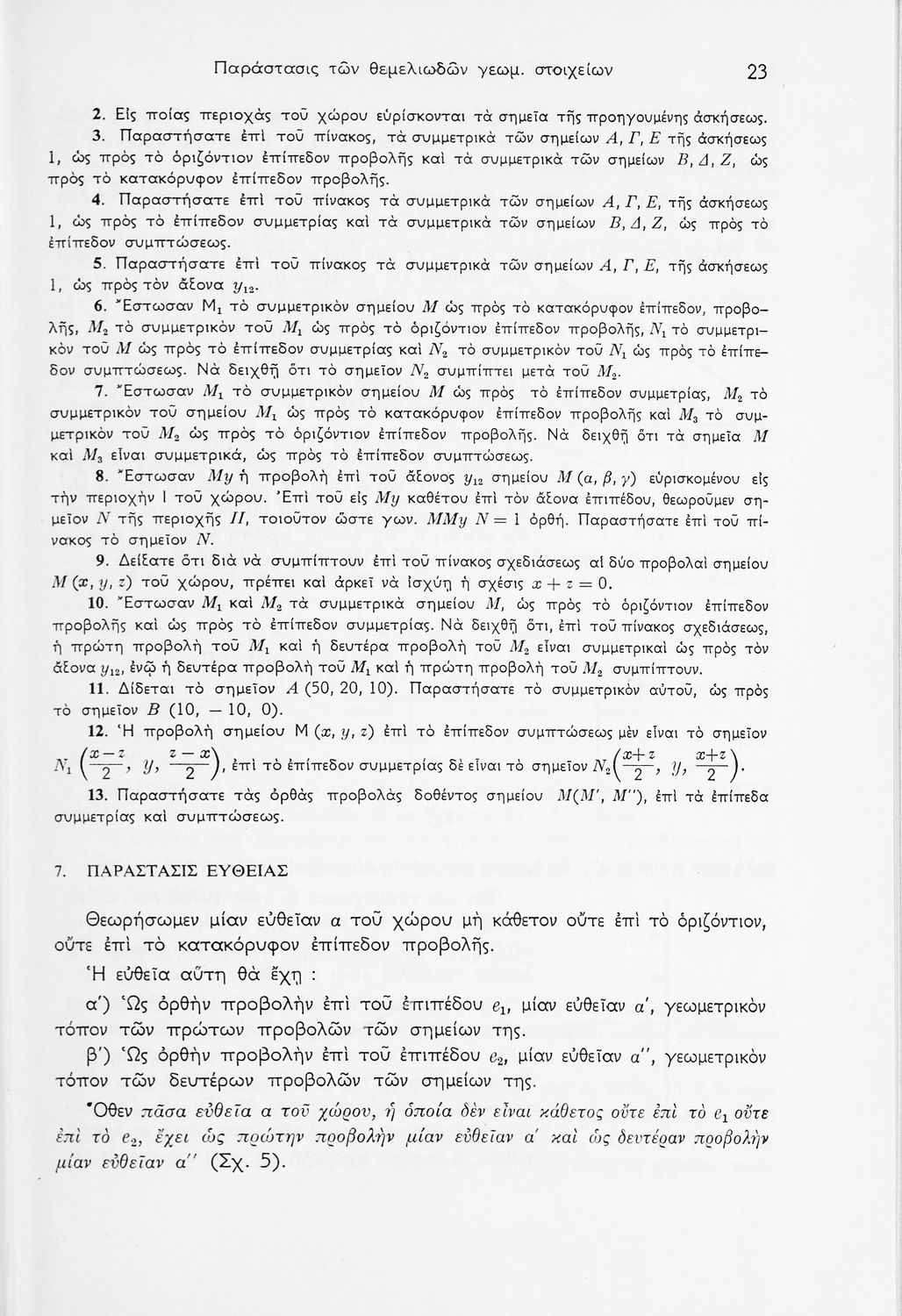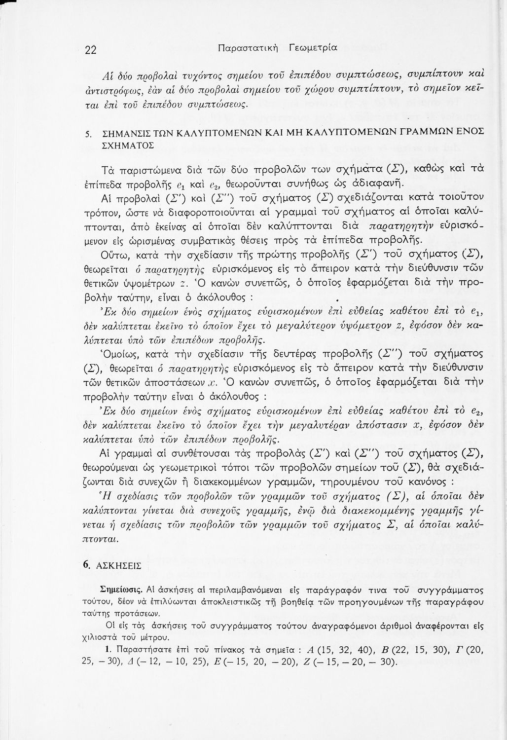 Σχολικό εγχειρίδιο Παραστατικής Γεωμετρίας για τις Ε΄ και ΣΤ΄ Γυμνασίου χωρισμένο σε θεωρία και ασκήσεις που περιλαμβάνει παράρτημα με έγχρωμα διαγράμματα σε Χ, Ψ, Ζ άξονα. Ο συγγραφέας ήταν καθηγητής στο ΕΜΠ. Φέρει το σύμβολο της δικτατορίας.